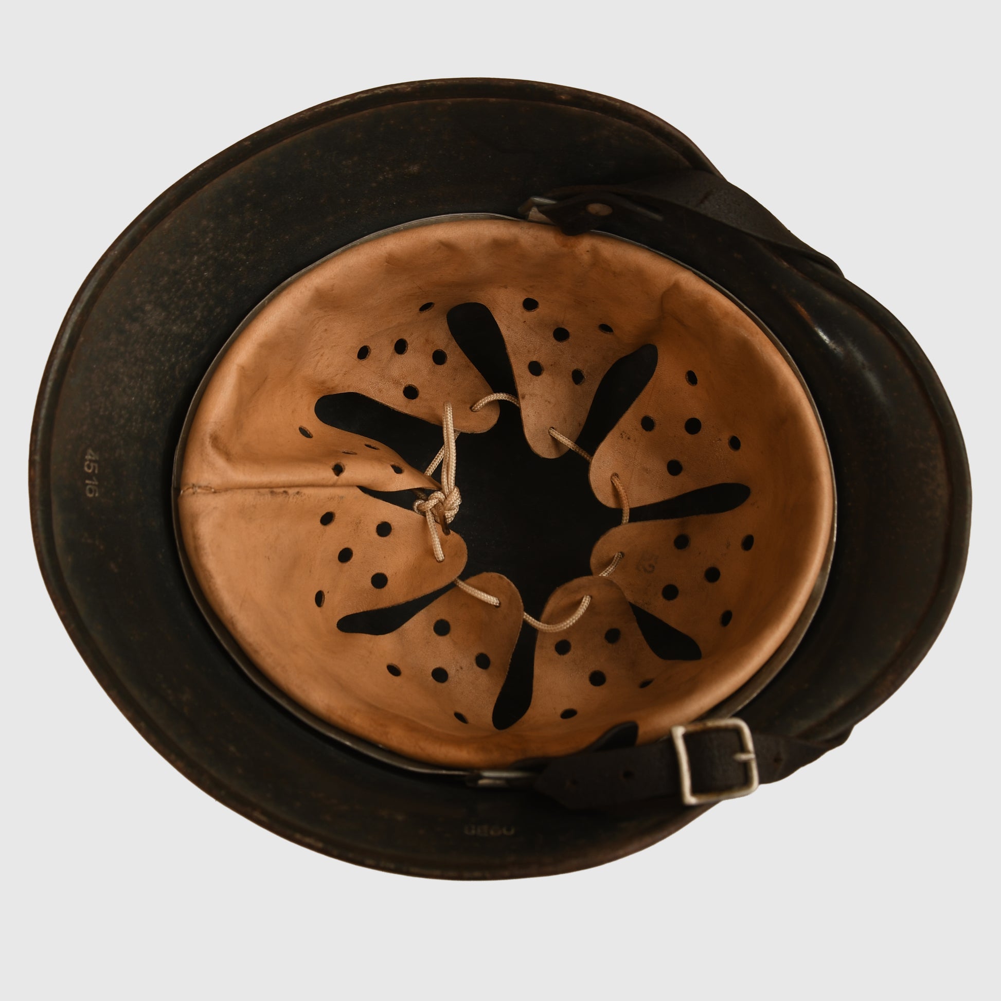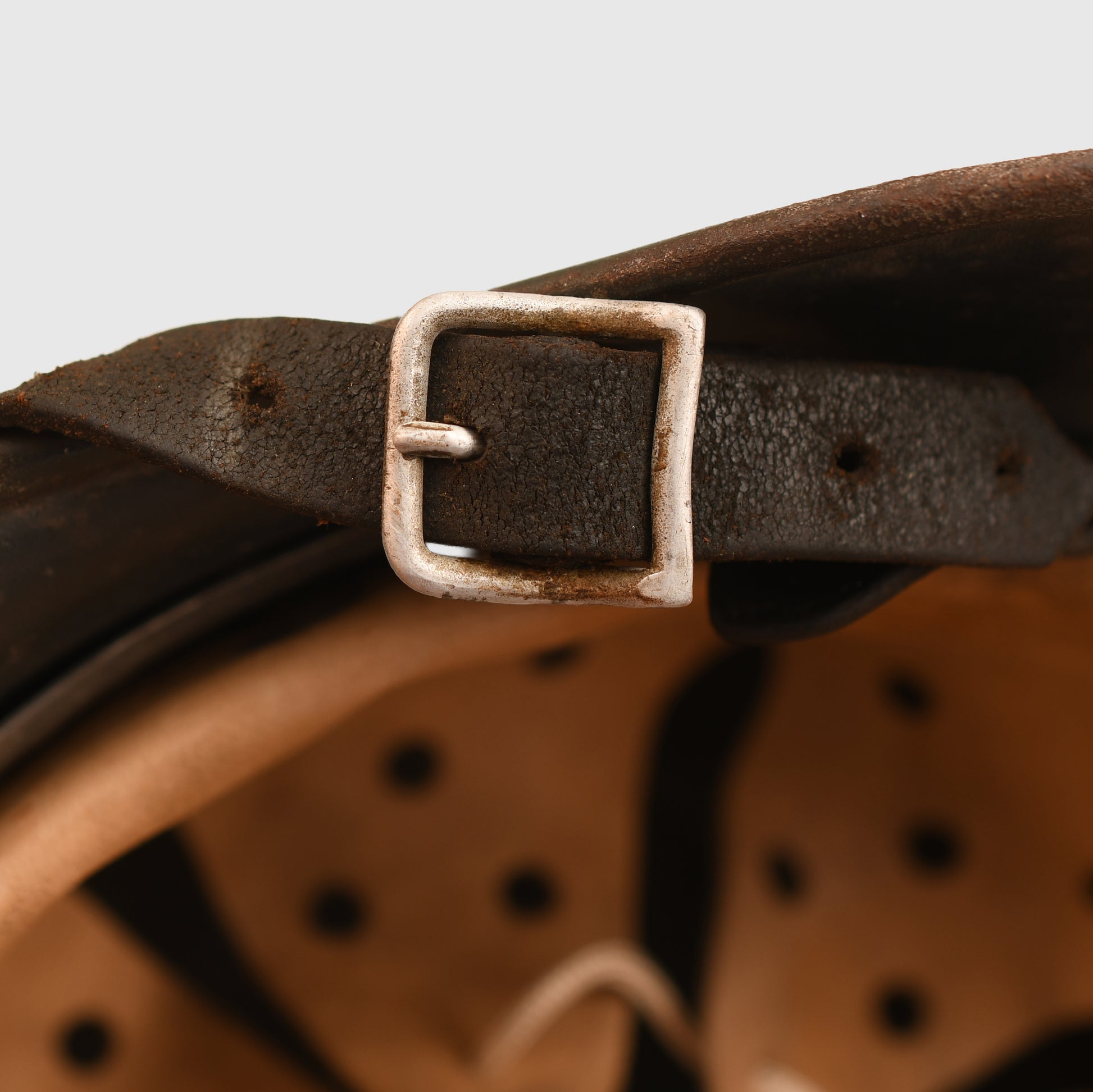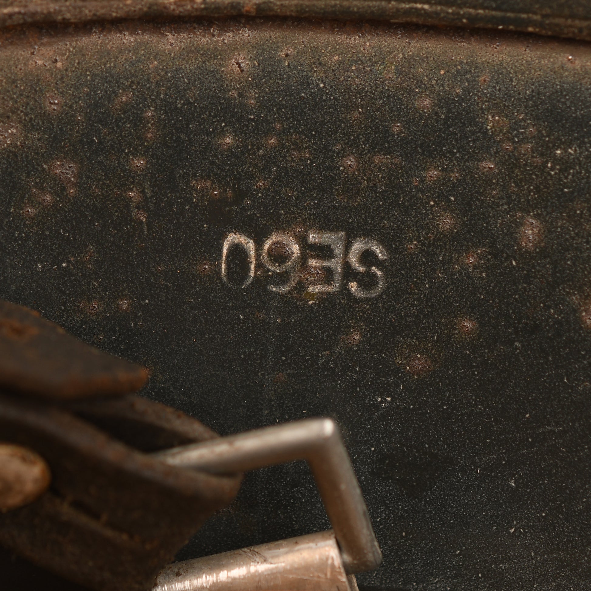 A SE60 size M.35 shell, batch number 4516, retaining the majority of its early Luftwaffe blue finish with some light rust bleed, as visible in our web images. Fitted with the rare short-tailed Luftwaffe eagle. The national tricolour decal is complete with minor abrasions. Notably, one M.35 rivet cap has detached on one side, while the opposite side remains intact. Paint remains on all three liner retaining rivet heads. The interior liner retains almost all of its original light tan colour and is fitted with the correct aluminium M.35 liner band and square-edged strap attachments. The original strap and aluminium buckle are present.