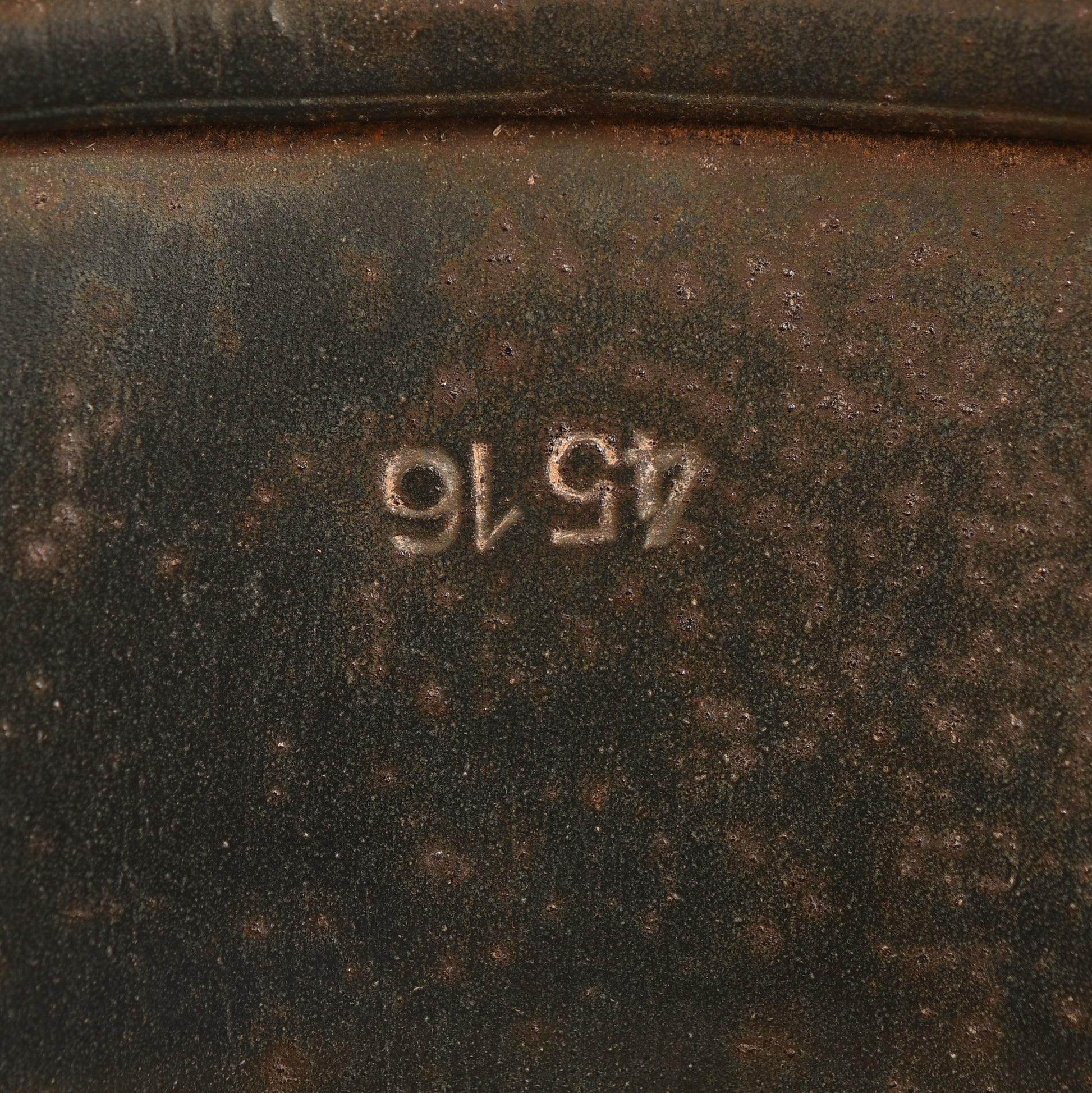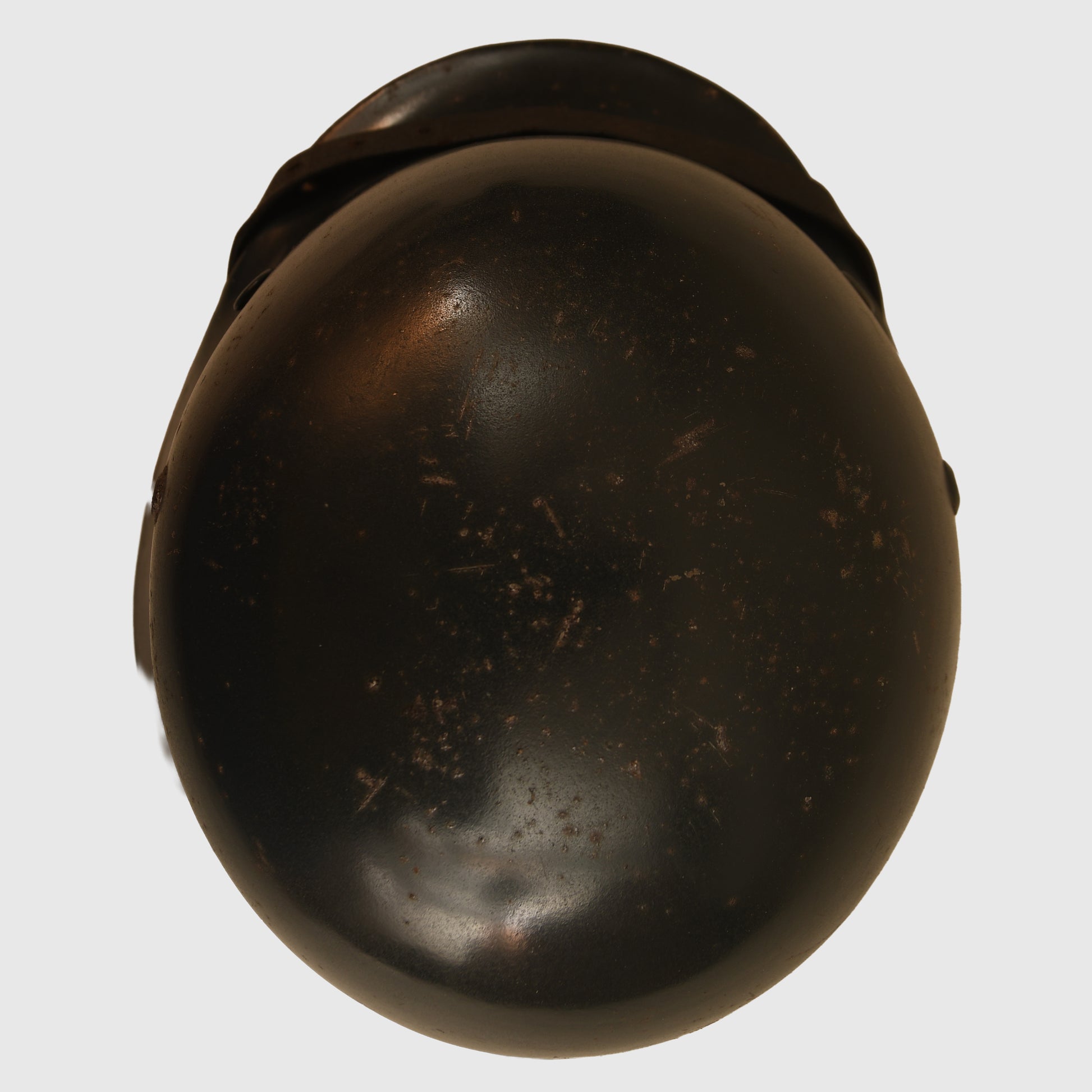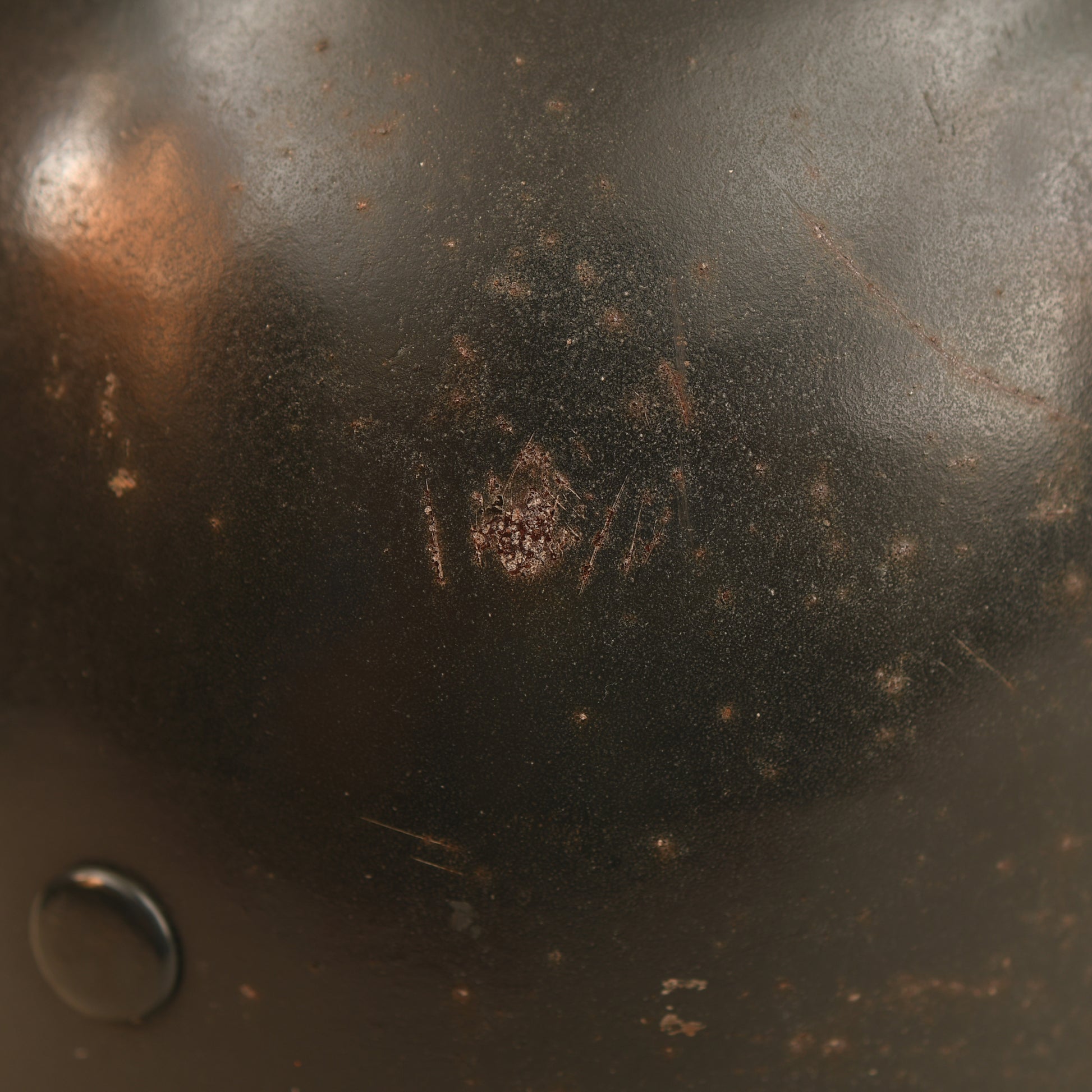 A SE60 size M.35 shell, batch number 4516, retaining the majority of its early Luftwaffe blue finish with some light rust bleed, as visible in our web images. Fitted with the rare short-tailed Luftwaffe eagle. The national tricolour decal is complete with minor abrasions. Notably, one M.35 rivet cap has detached on one side, while the opposite side remains intact. Paint remains on all three liner retaining rivet heads. The interior liner retains almost all of its original light tan colour and is fitted with the correct aluminium M.35 liner band and square-edged strap attachments. The original strap and aluminium buckle are present.