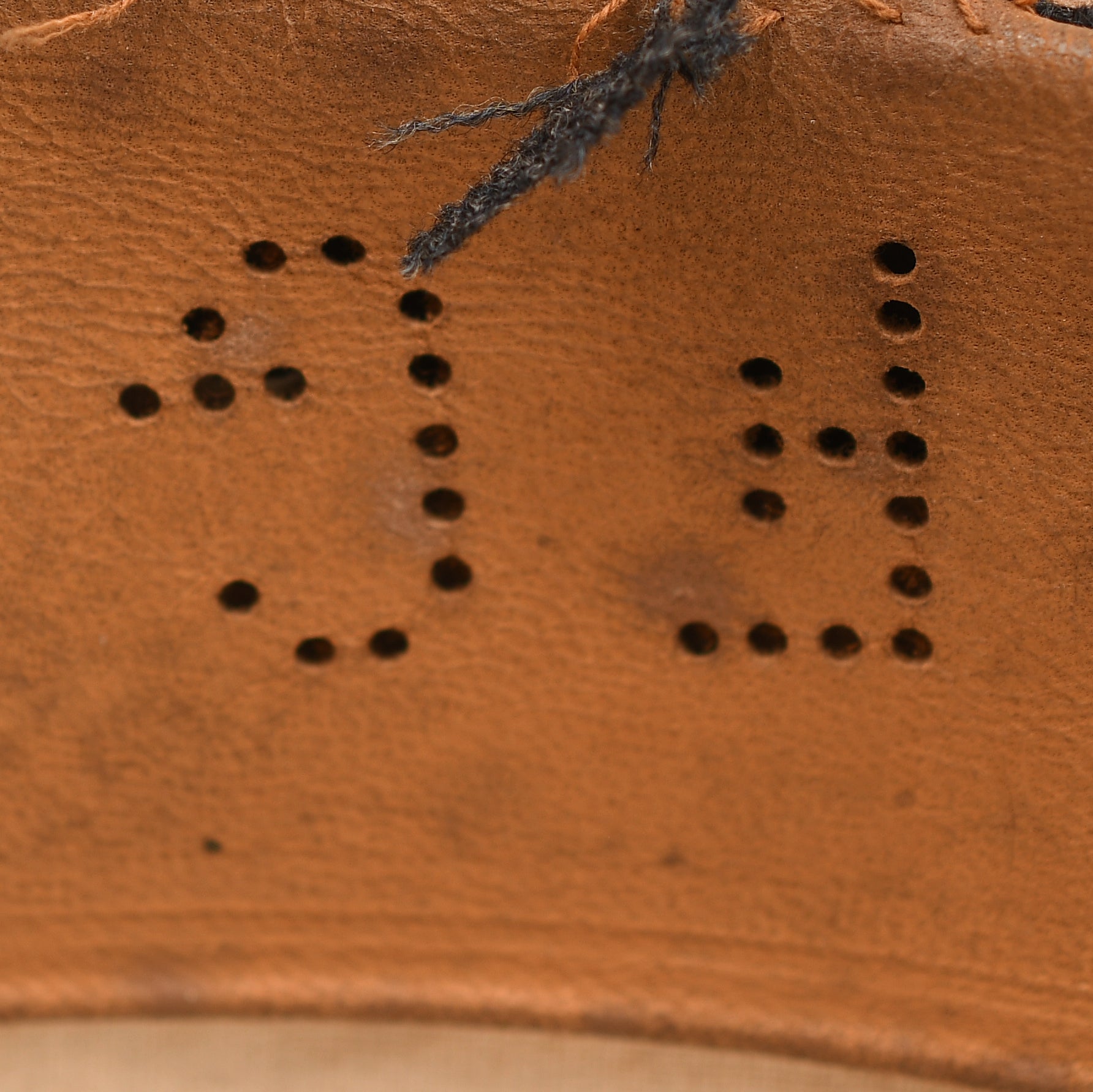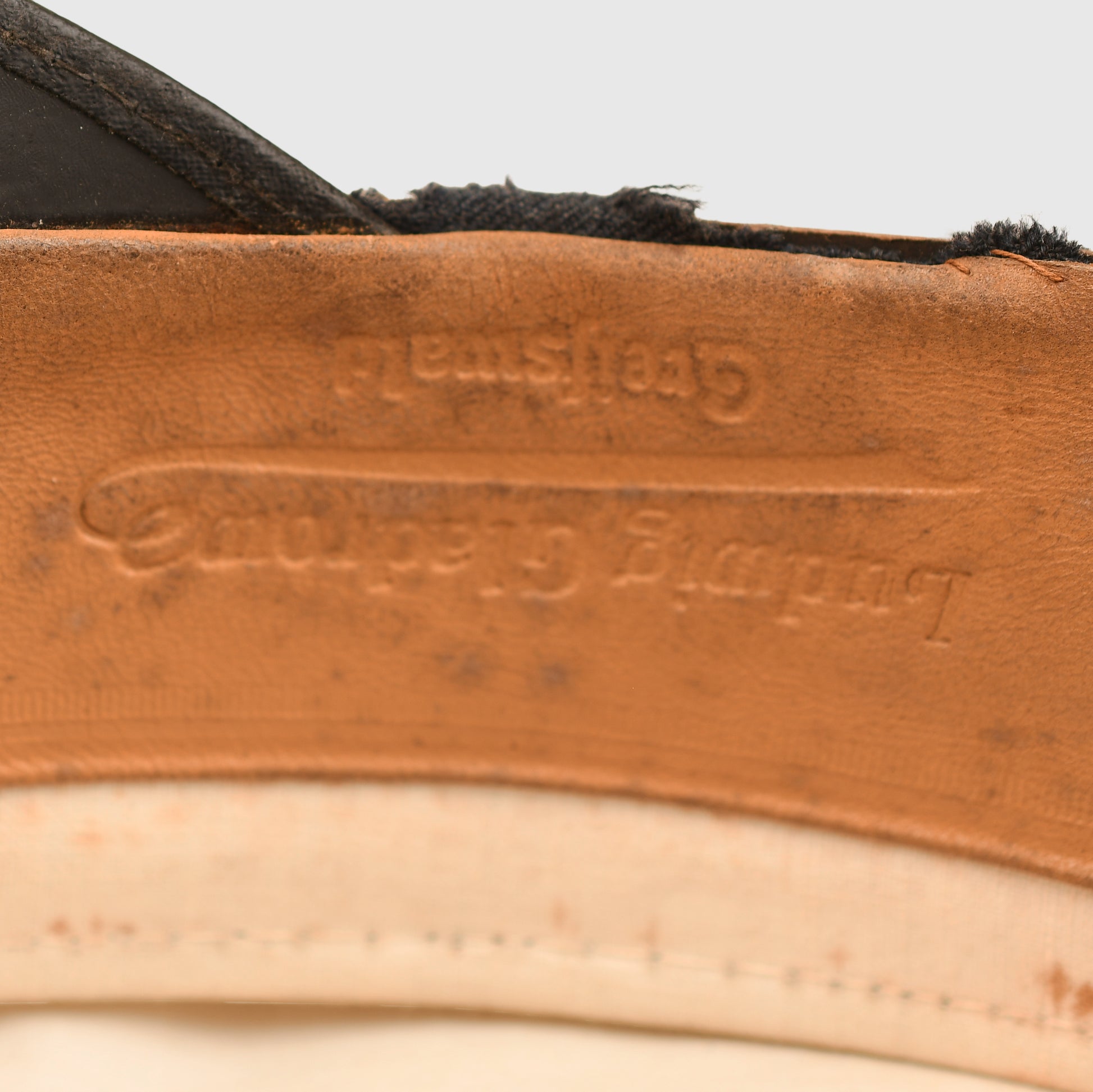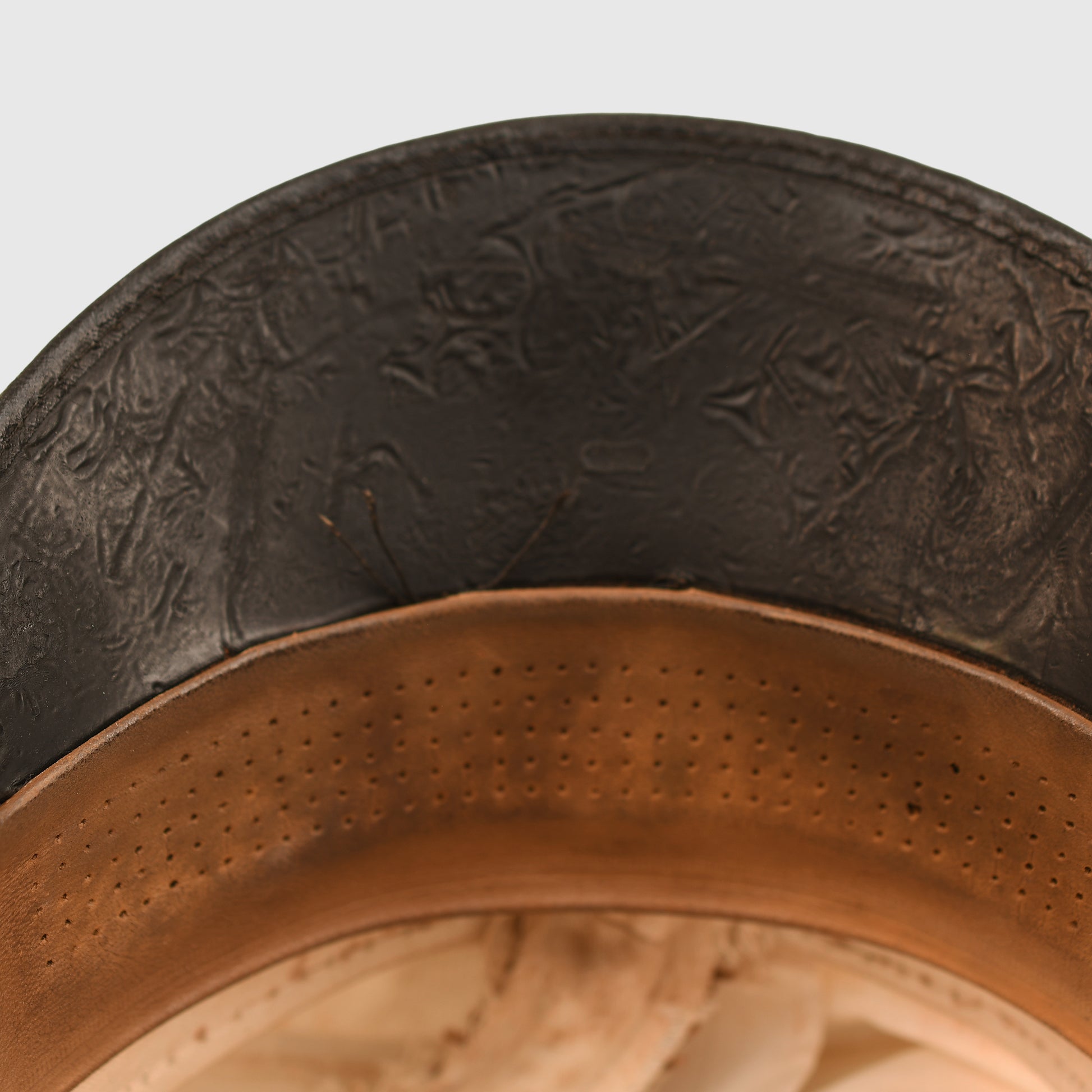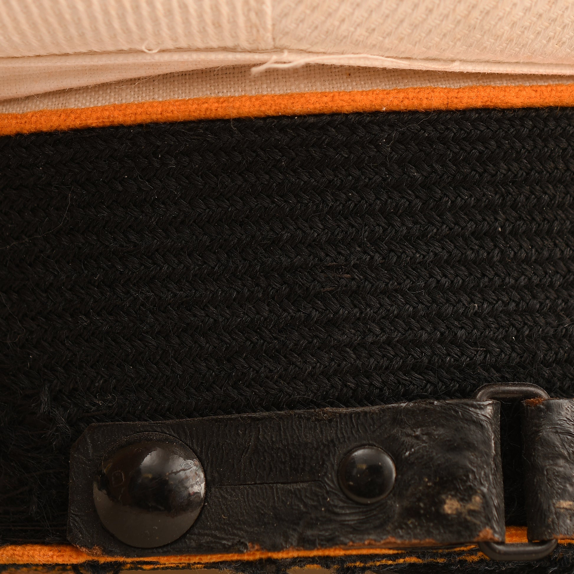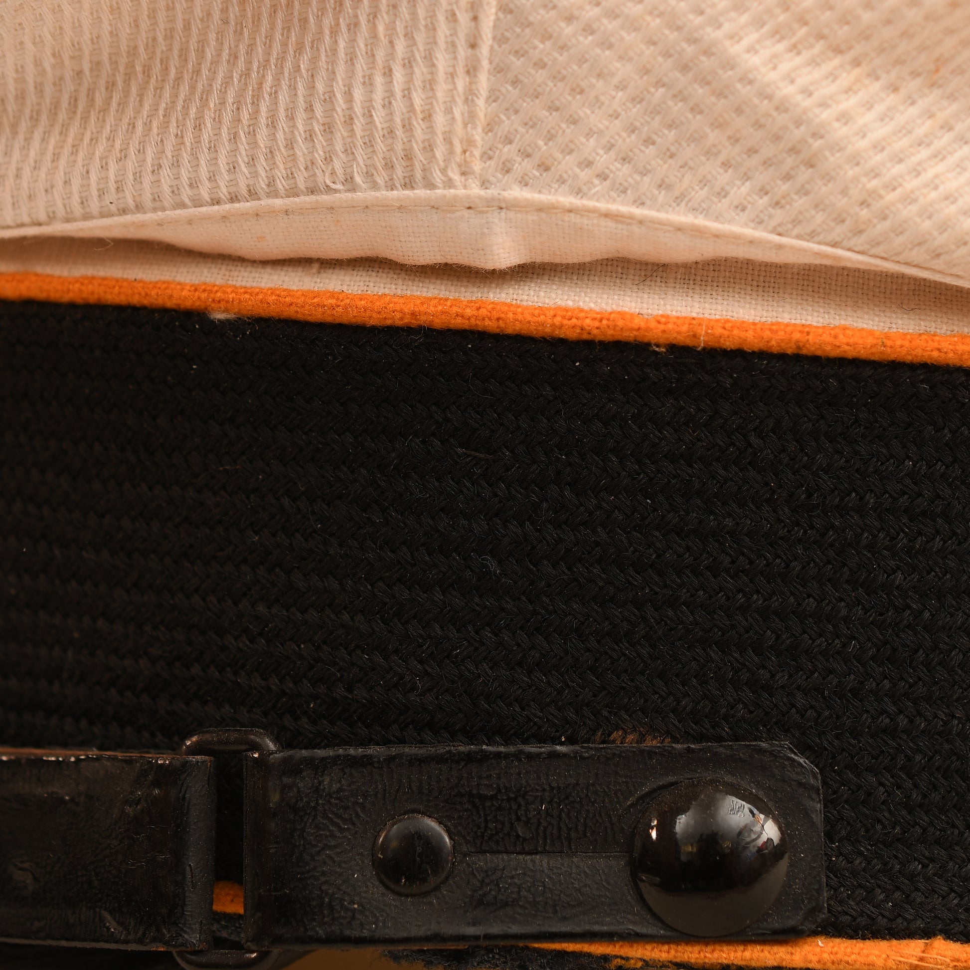 A fine Luftwaffe visor cap featuring a white removable top, standard mohair centre band, and yellow waffenfarbe for flight section to both upper and lower edges of the band. Fitted with a matched set of aluminium eagle and cockade. The white top shows only minor age-related storage staining. Complete with standard double oval buckle chinstrap and double ribbed edged peak, showing slight congealing to the finish. Interior with light tan sweatband displaying evidence of wear, supple and intact, with a retailer’s mark. The cap has moth damage along the full circumference of the very bottom edge near the lower waffenfarbe, though the yellow piping itself remains untouched.