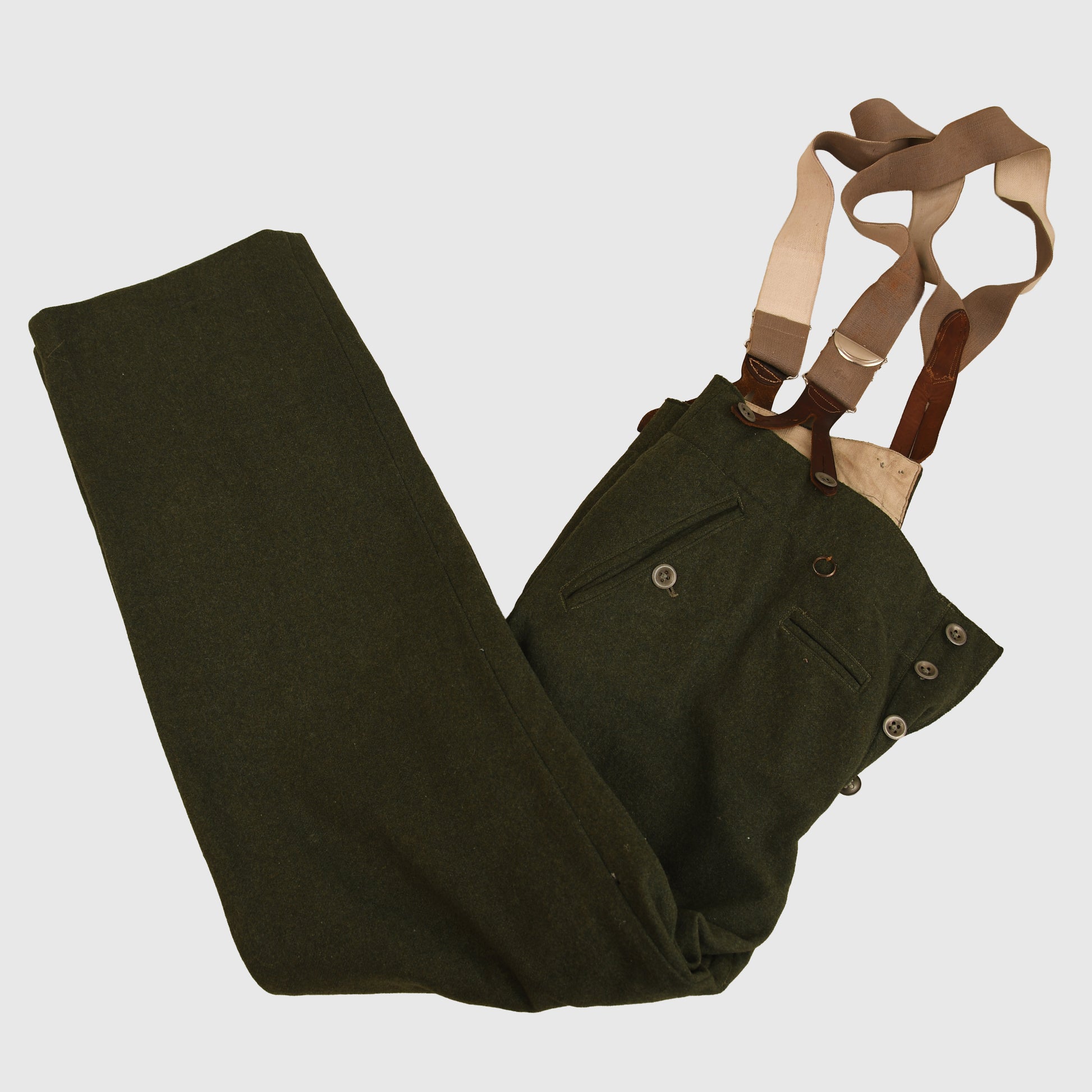 A very good set of German Army M.36 combat trousers in the standard straight-leg configuration. Features include two angled side pockets with button closures, a rear pocket with button closure, and a rear waist adjuster strap. Zeltbahn buttons are fitted to the waistband for the attachment of braces, which remain present with the trousers.