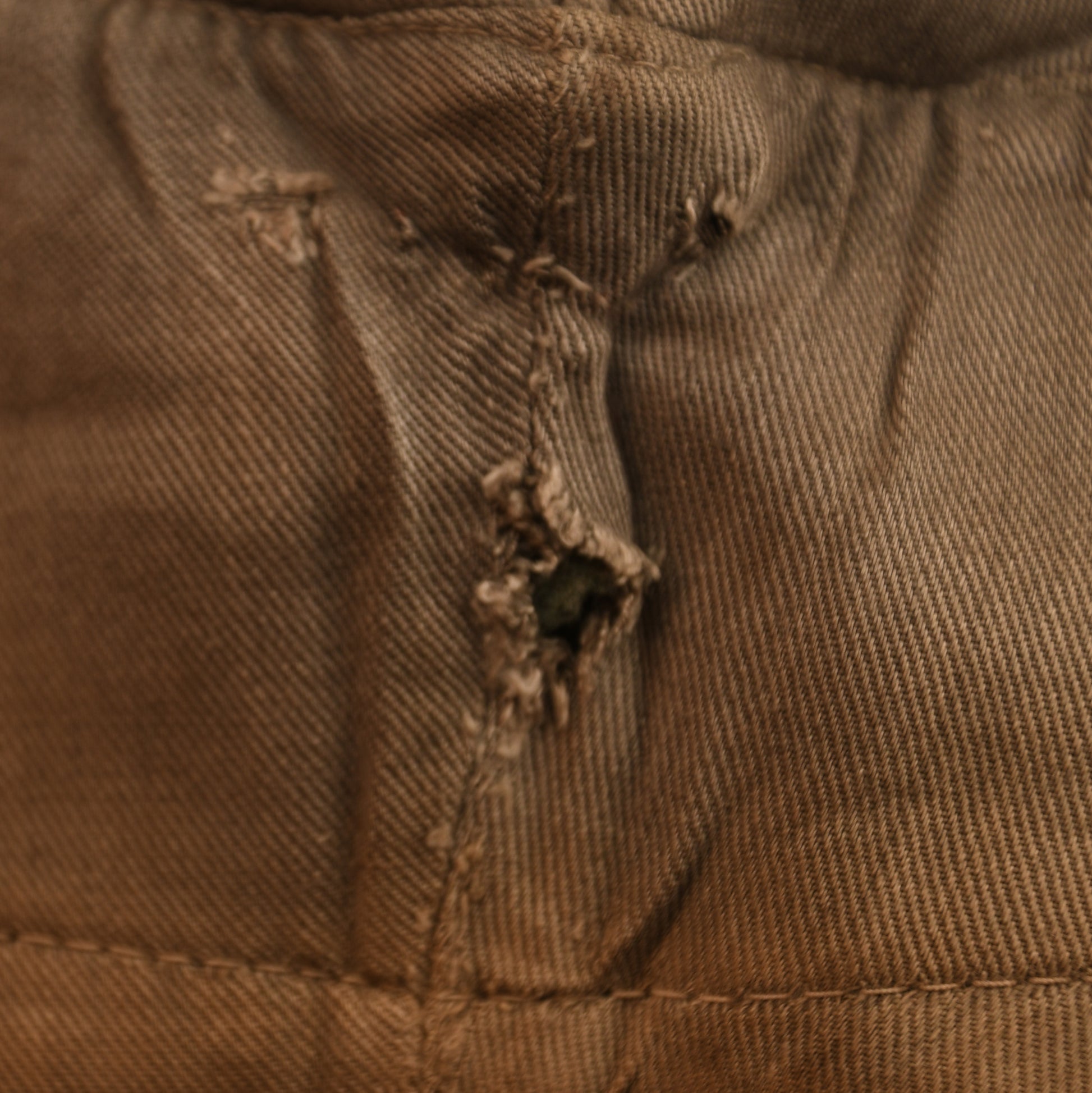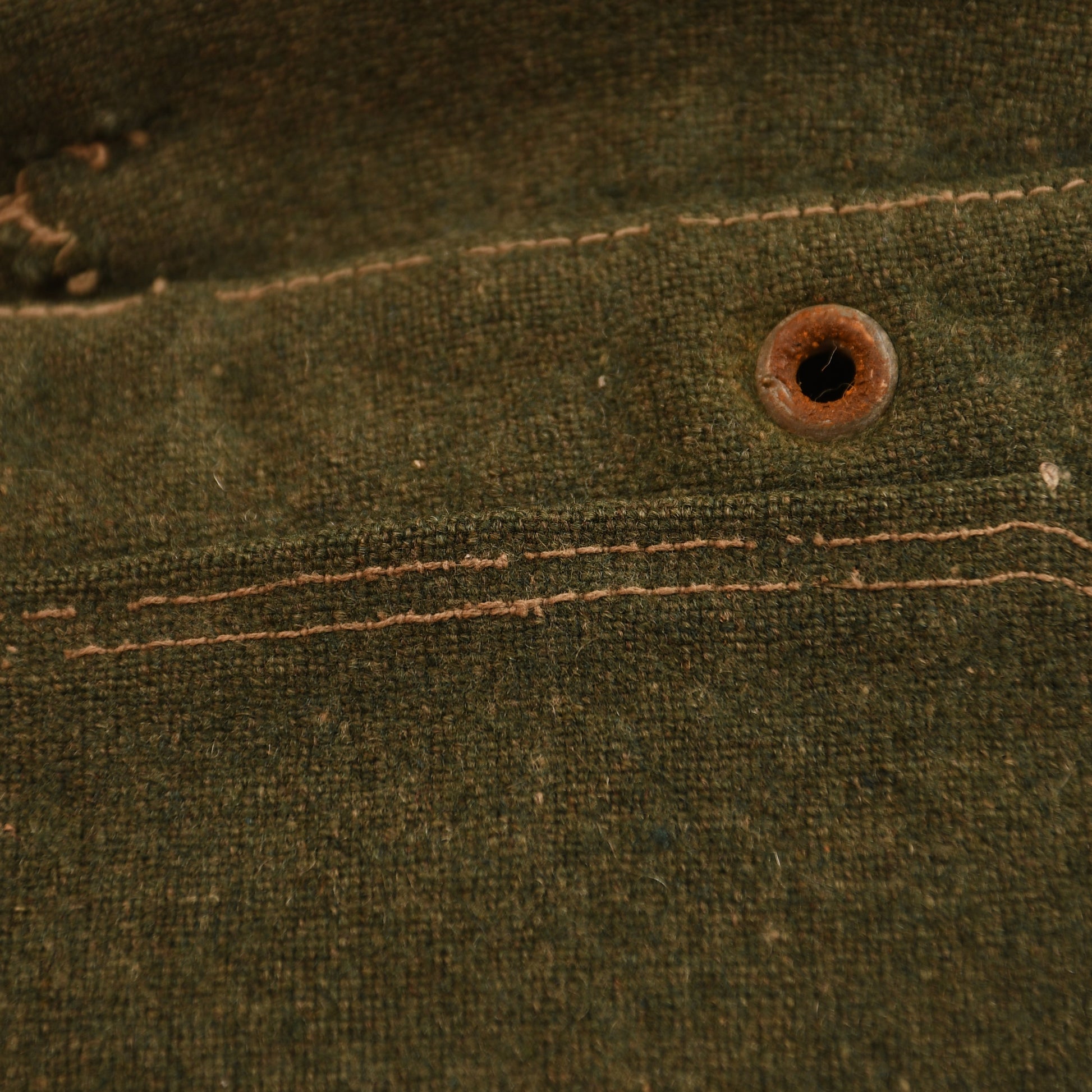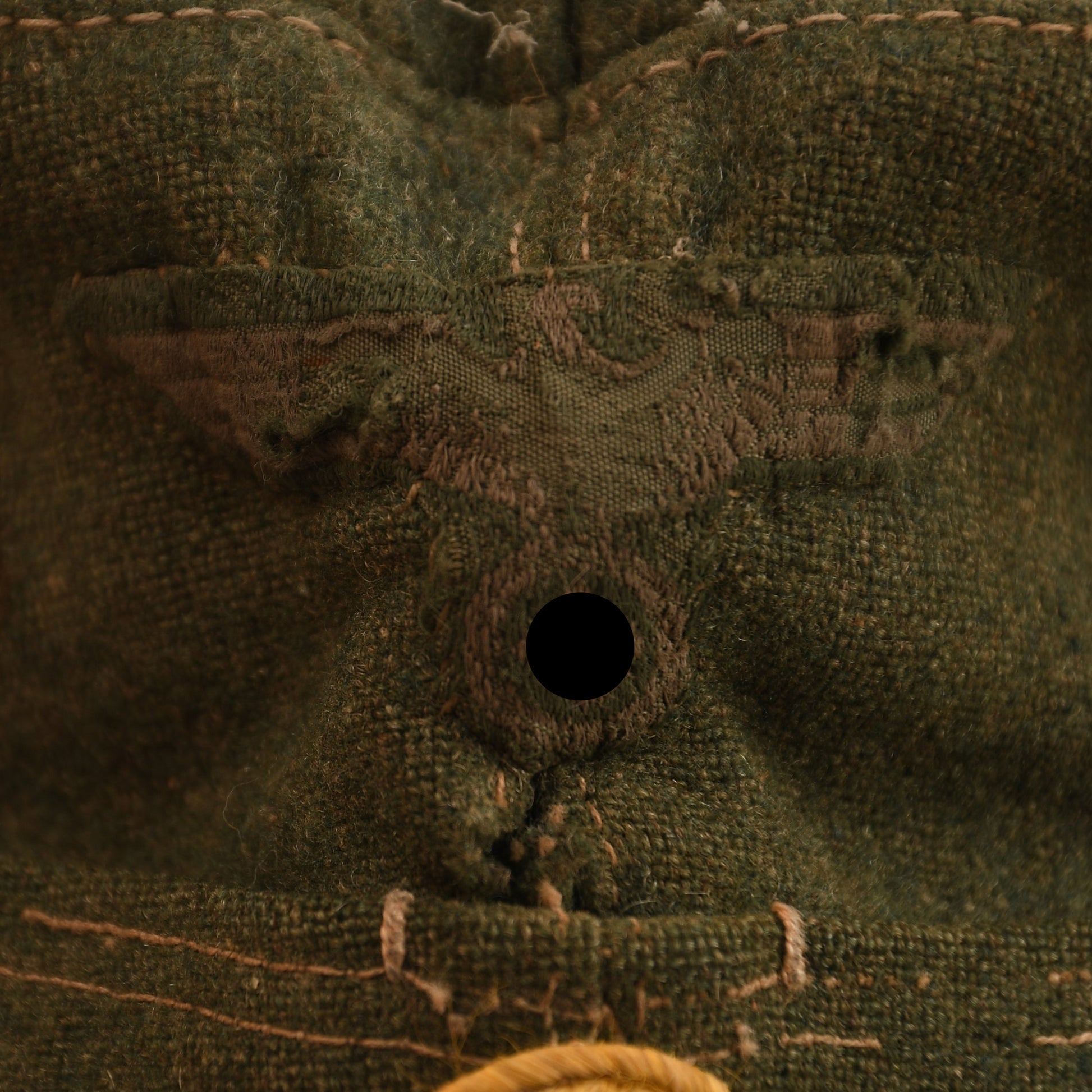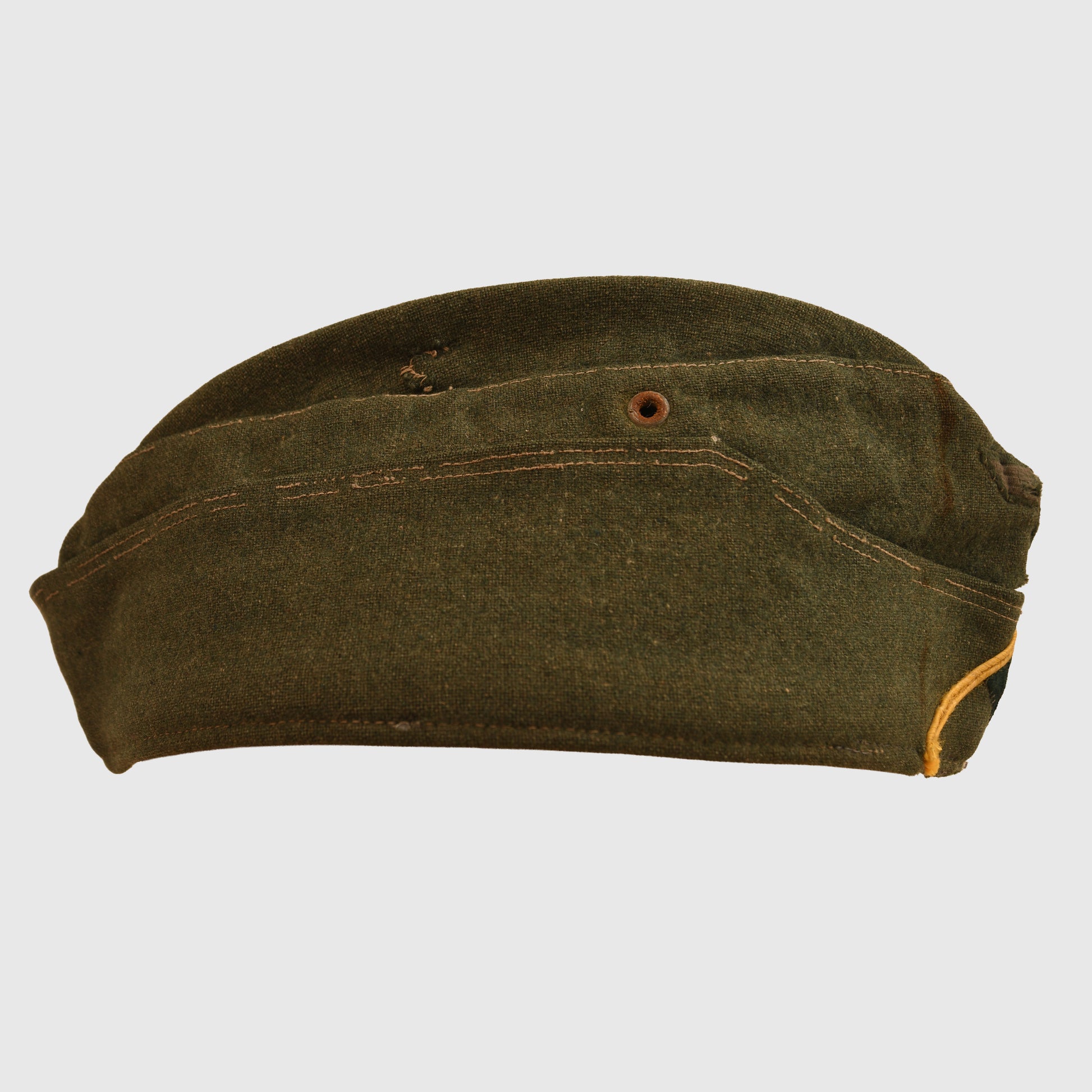 A well-worn enlisted man’s M.38 overseas cap showing extensive use. The cloth nap is largely worn away, except in areas protected by the side curtains and upper envelope, with some stitching degraded to a light grey. Fitted with a grey-on-green Bevo woven eagle, showing some wear and degradation as visible in our web images. Cockade remains intact, with the inverted V section of lemon yellow signals piping clearly present. Stamped size ‘57’, maker marked and dated ‘1942’ on the interior brushed cotton lining.