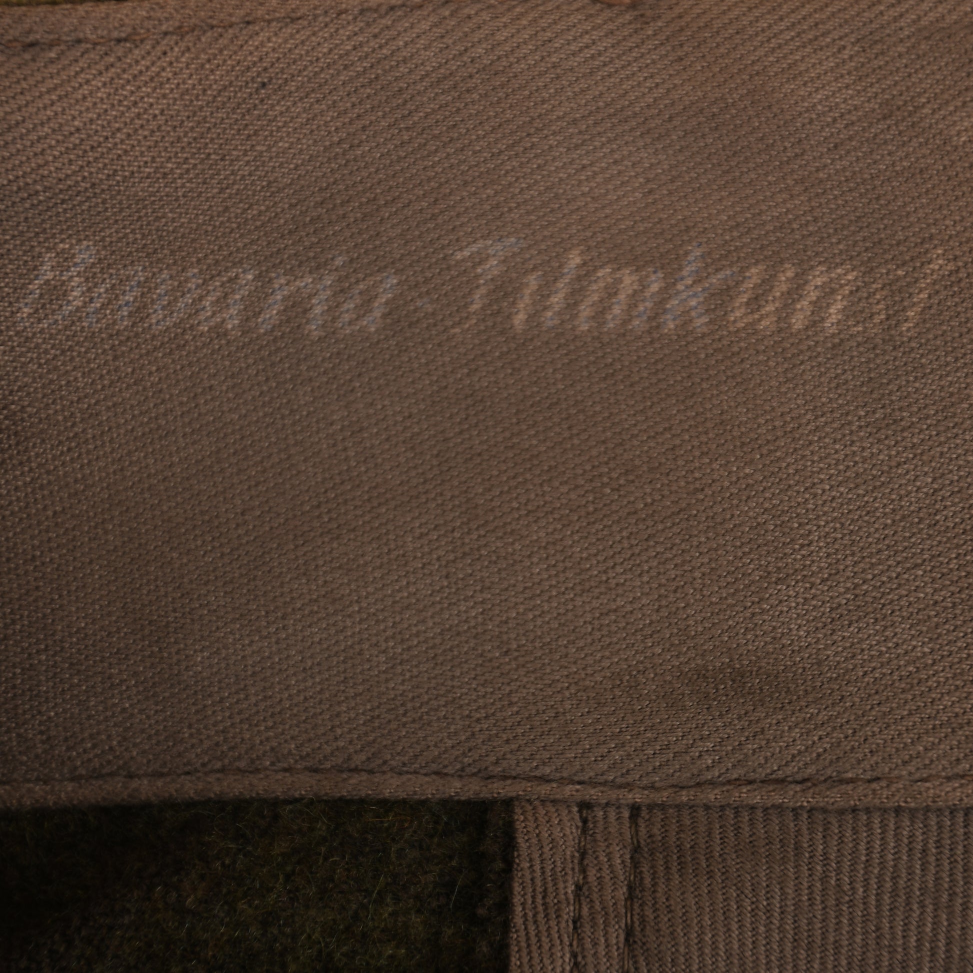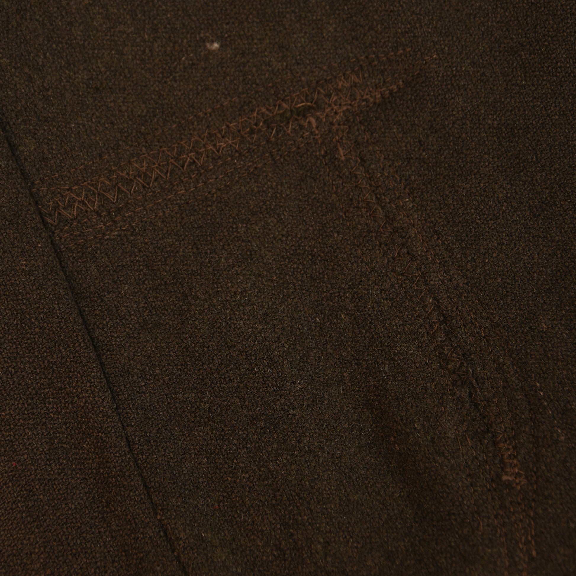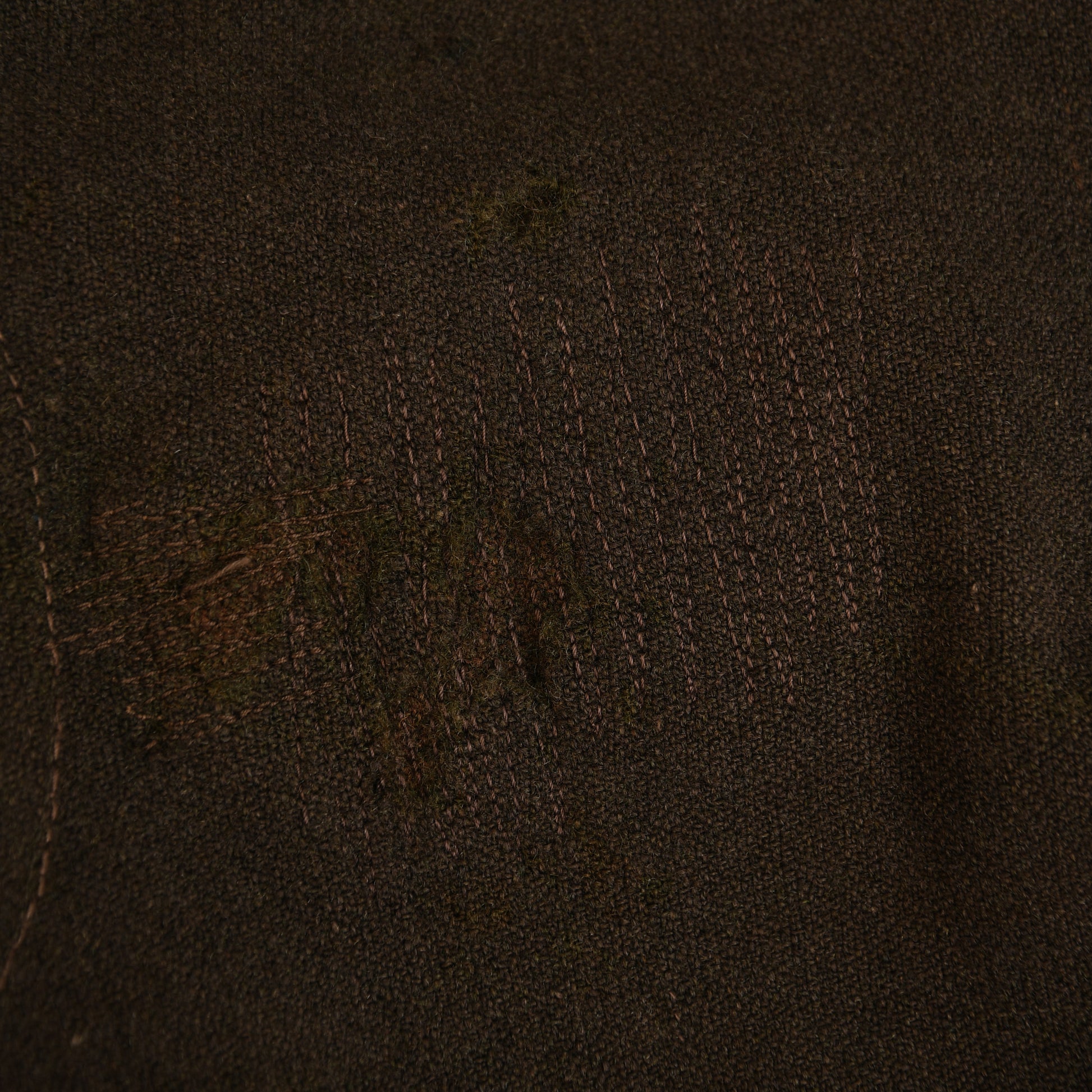 A good example of the standard issue German M.43 combat trousers. Constructed in the typical wartime configuration with two angled side pockets (without flaps but buttoned), a watch fob pocket with flap, and wide belt loops. The reinforced seat section has been removed, showing evidence of long service use.