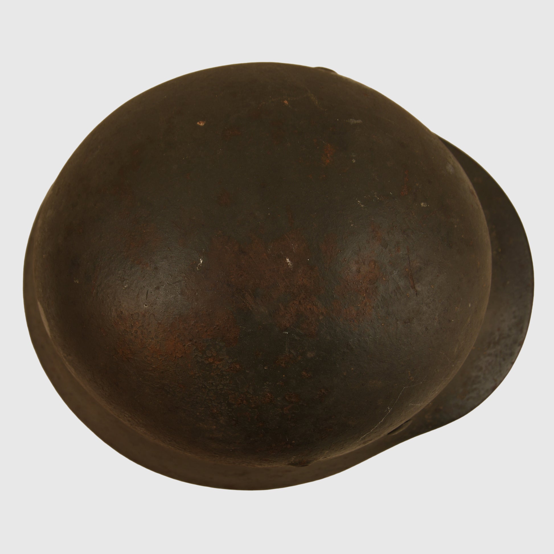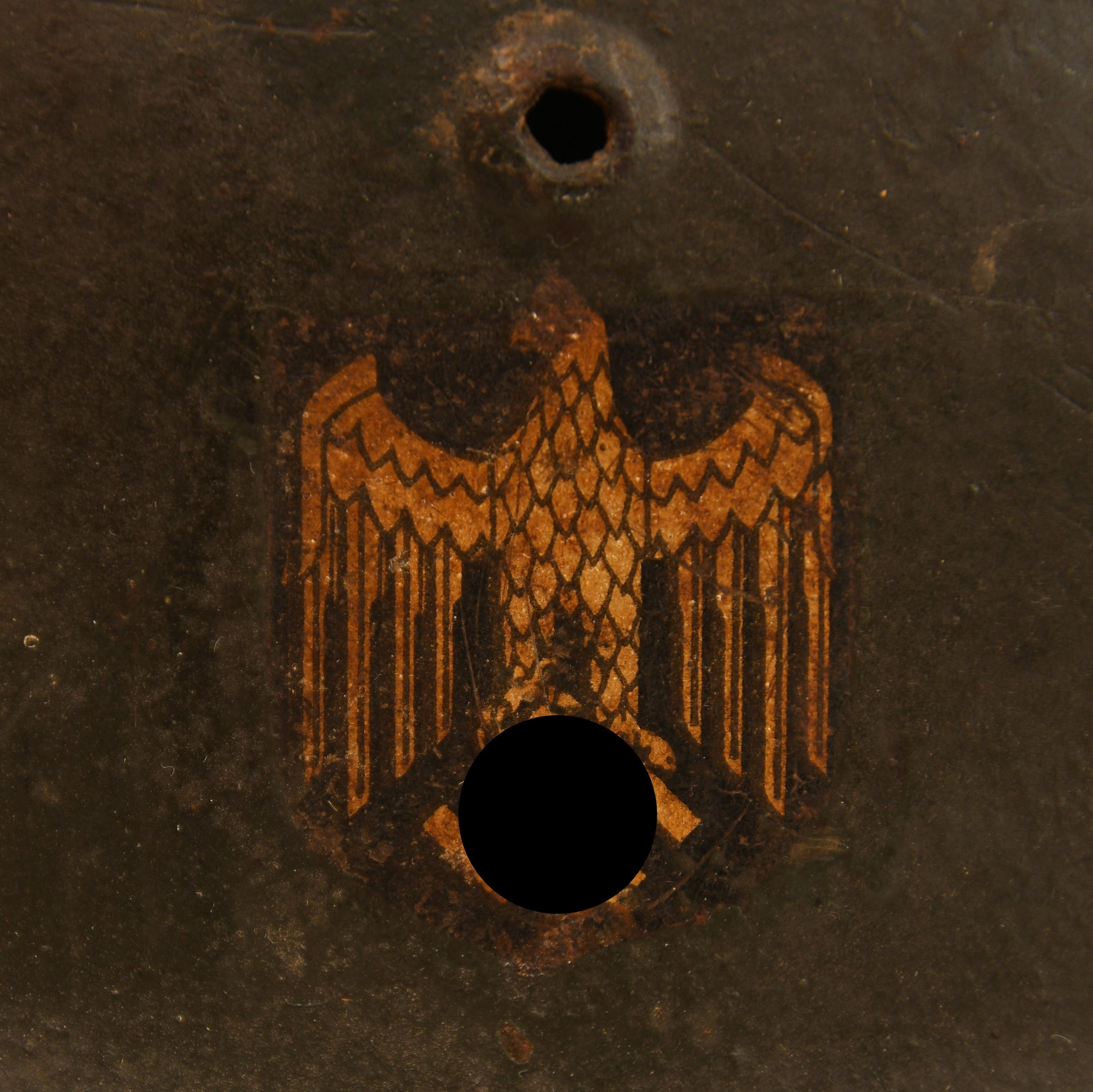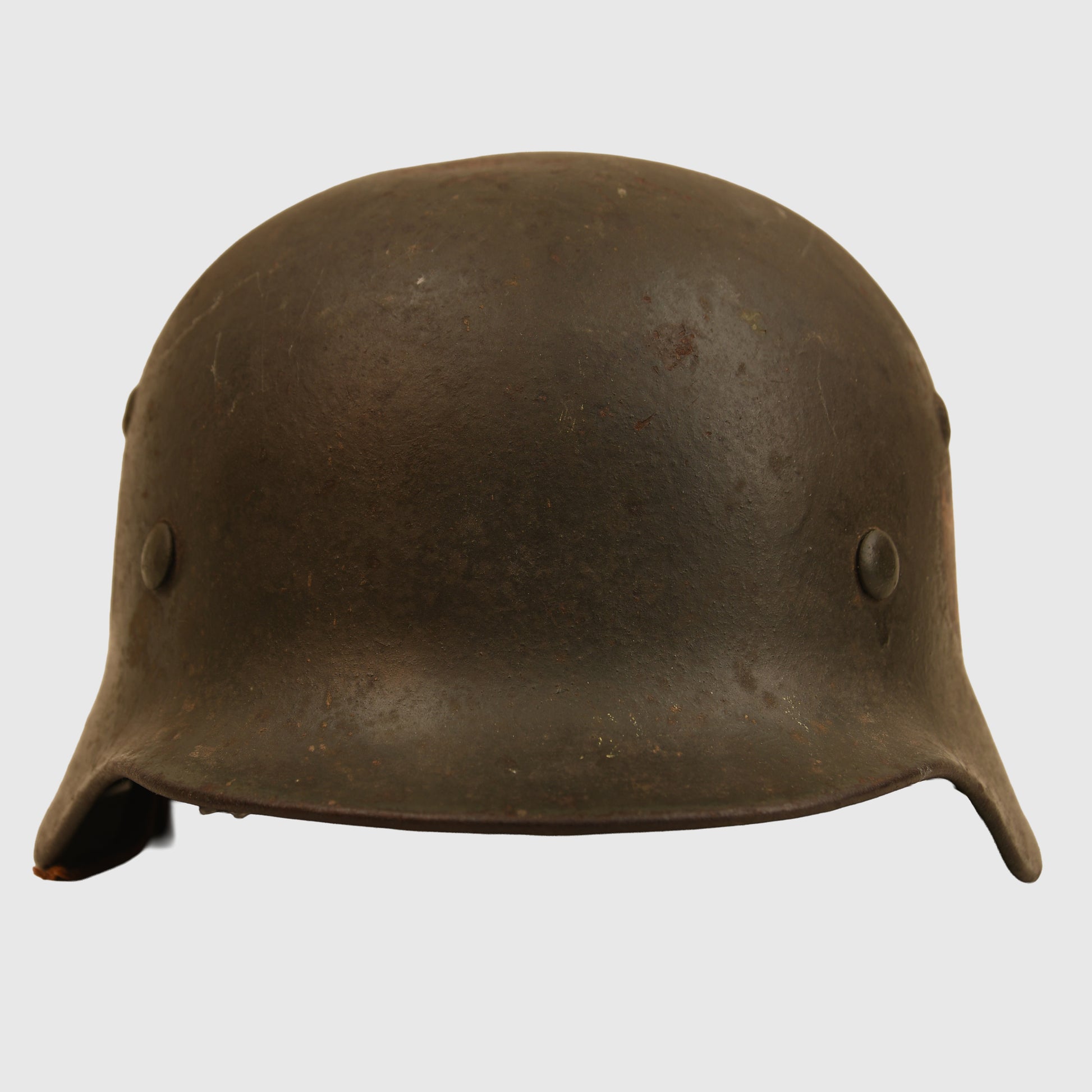 A size 62 M35 pattern shell, originally a double-decal helmet, later reissued and depot-repainted with the army decal left exposed. The decal has toned to an attractive gold hue and remains clear, while the outline of the original tricolour decal is still faintly visible beneath the overpaint.