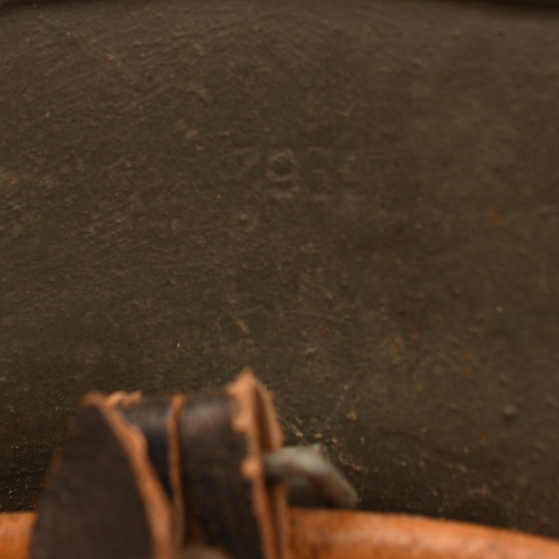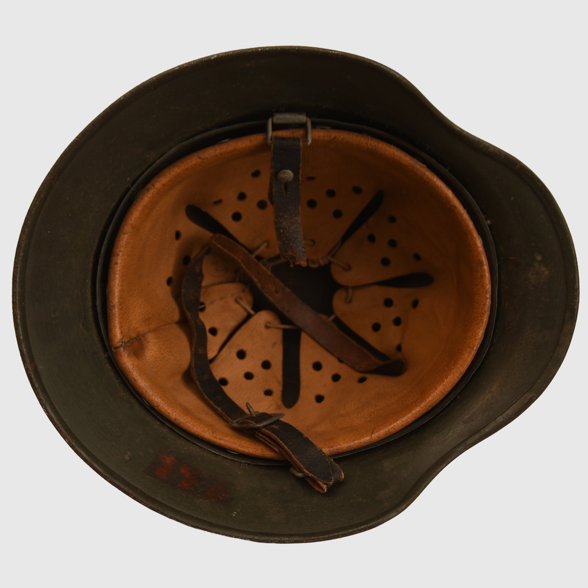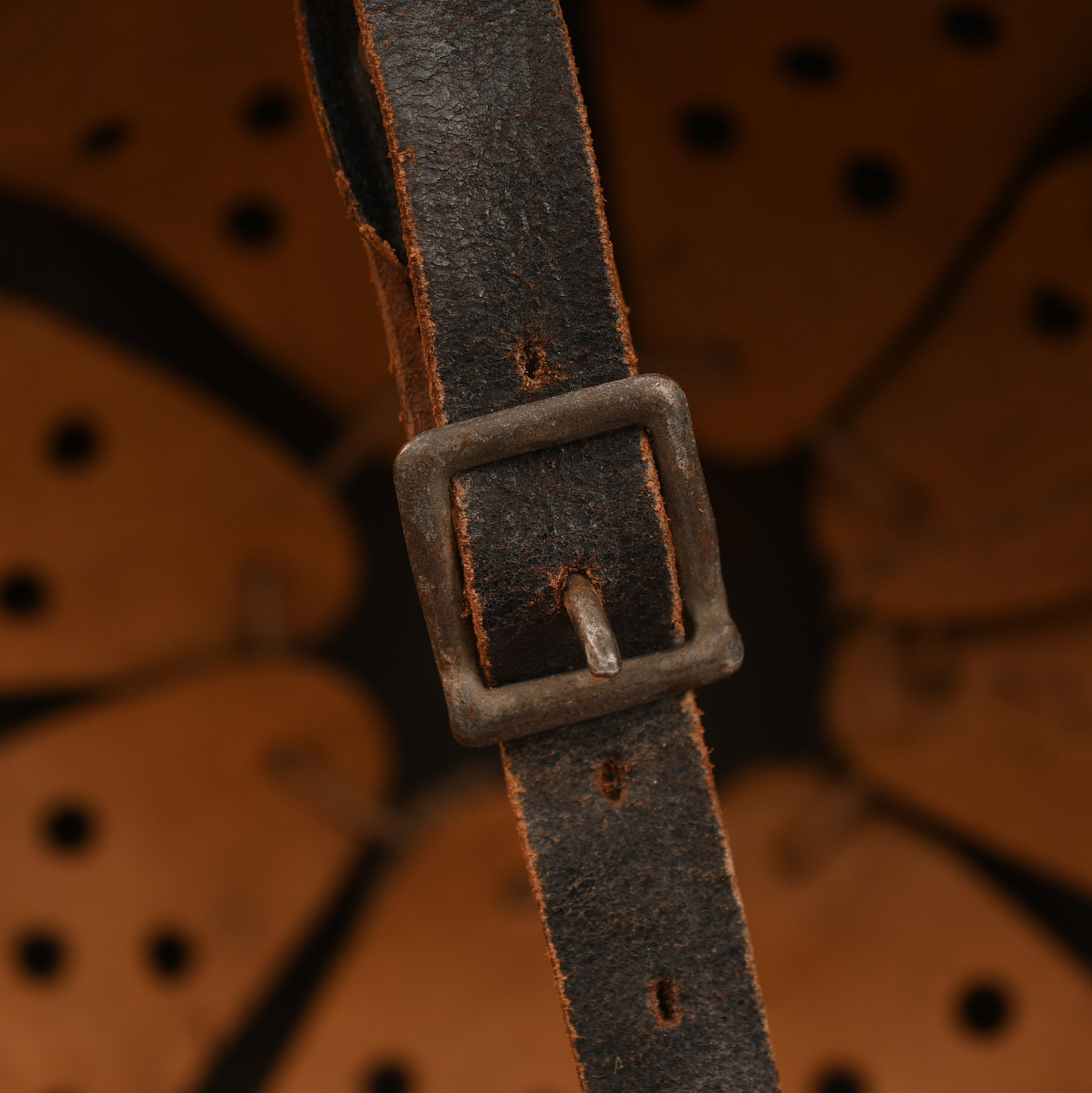 The interior features an M40 zinc-banded liner, the leather stamped 54, showing excellent colour and complete with its original drawstring. The original chinstrap is present but has unfortunately split. Traces of a red three-digit number are visible on the inner skirt.