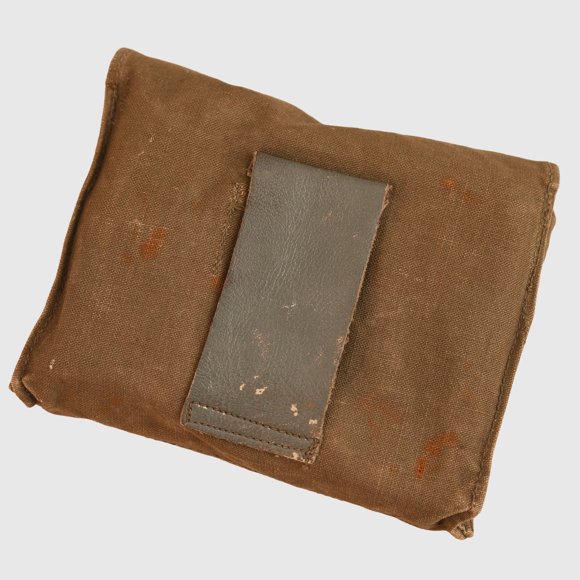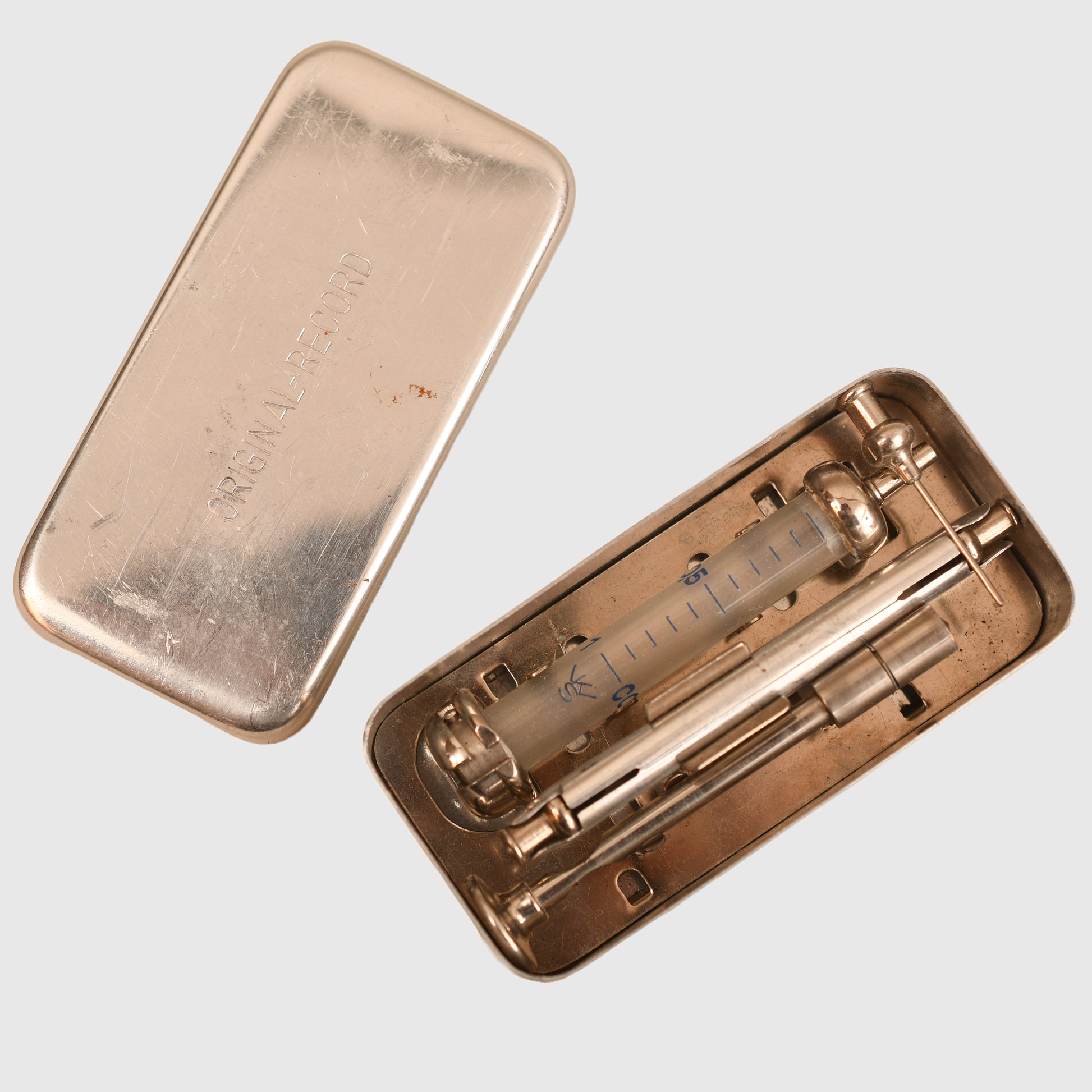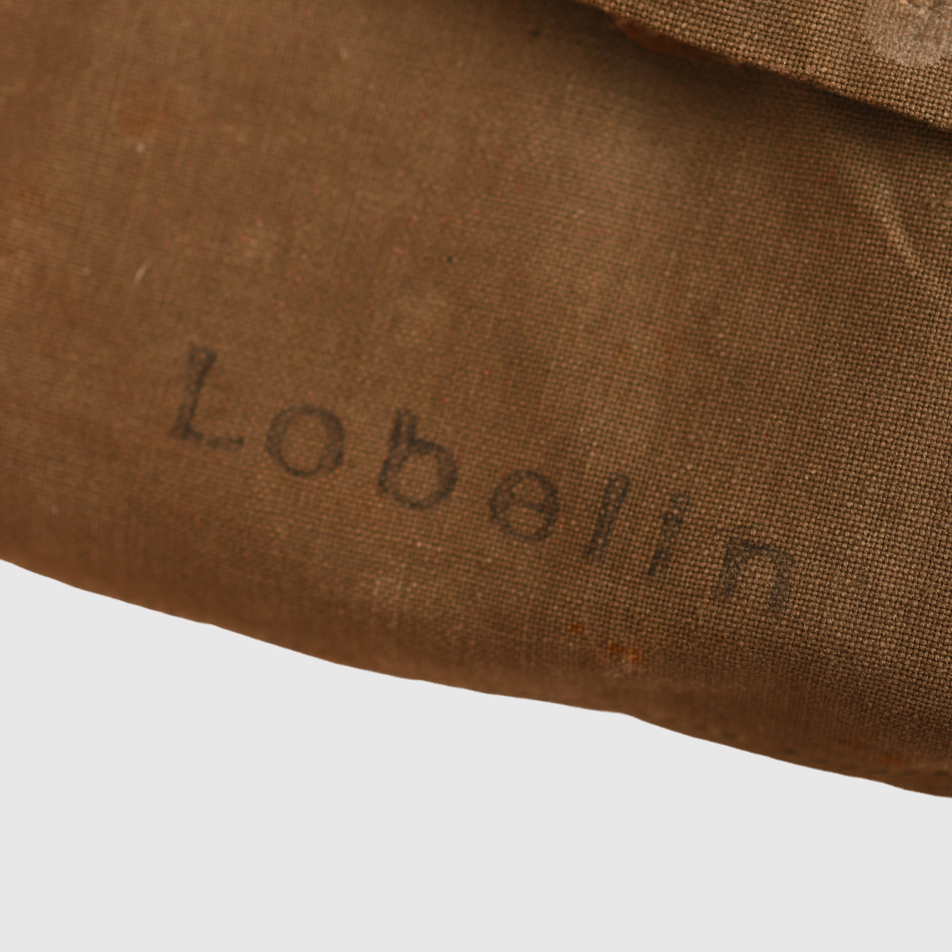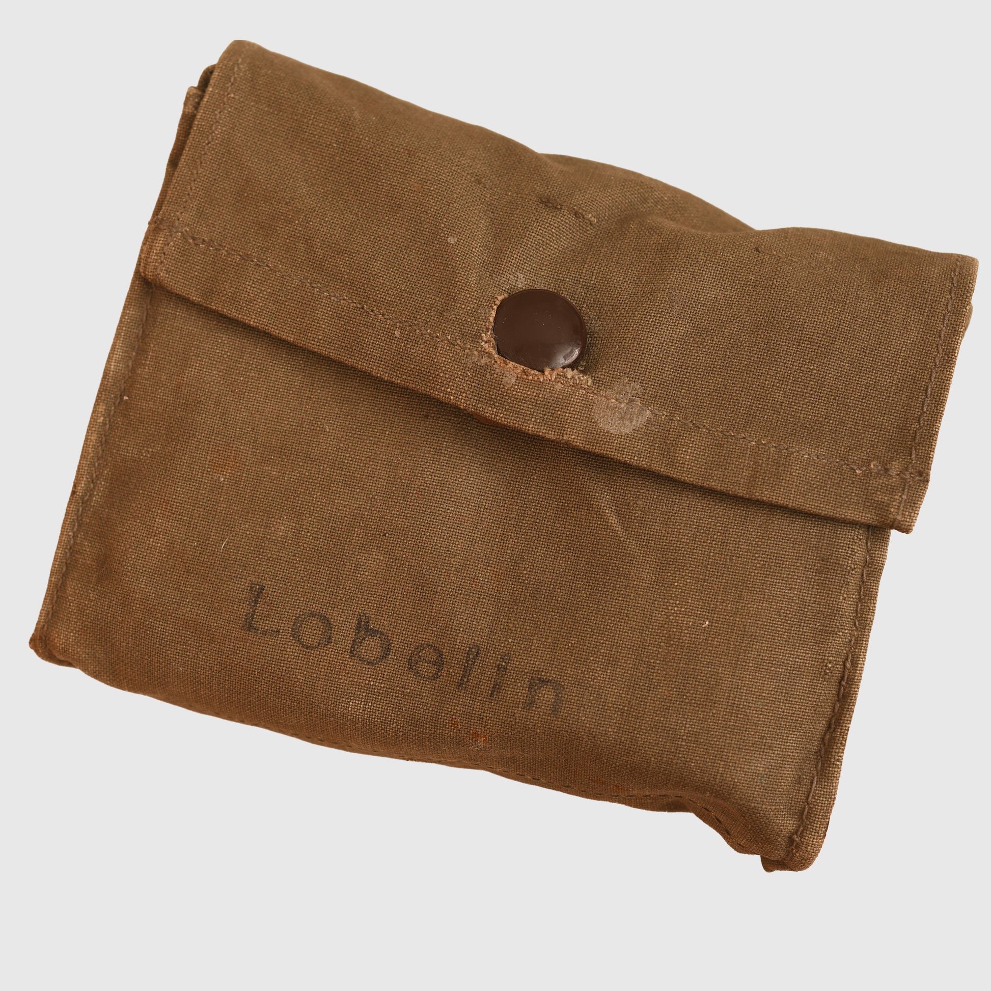 An olive drab pouch with lid closure secured by male/female press stud, ink stamped “LOBELINE” to the exterior. The kit contains one glass bottle, one tin, and a cardboard case holding two ampoules of an unidentified medical substance. Also included is a small tin containing a syringe. A section of translated instructions inside the pouch notes that Lobeline was used as a respiratory aid administered by injection.