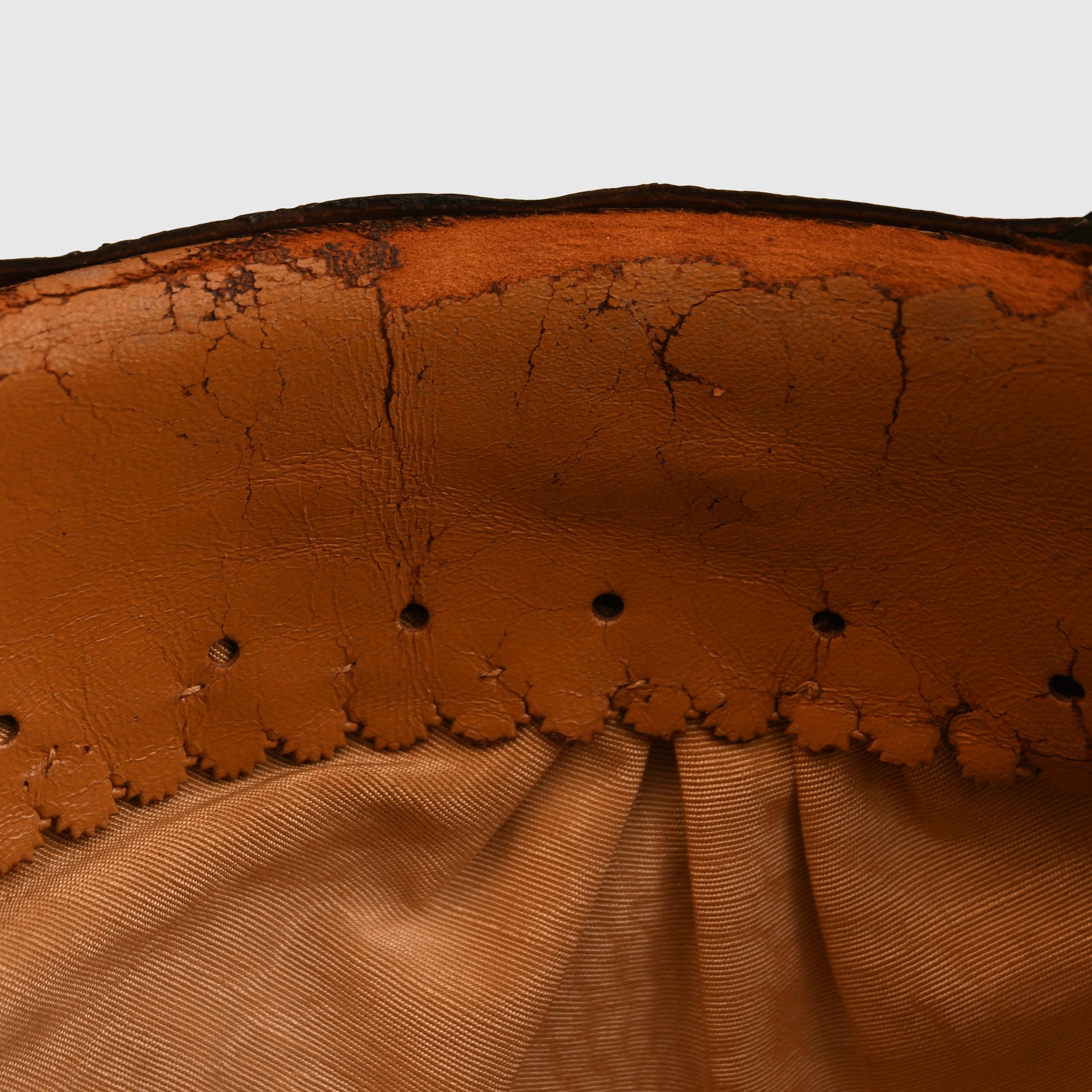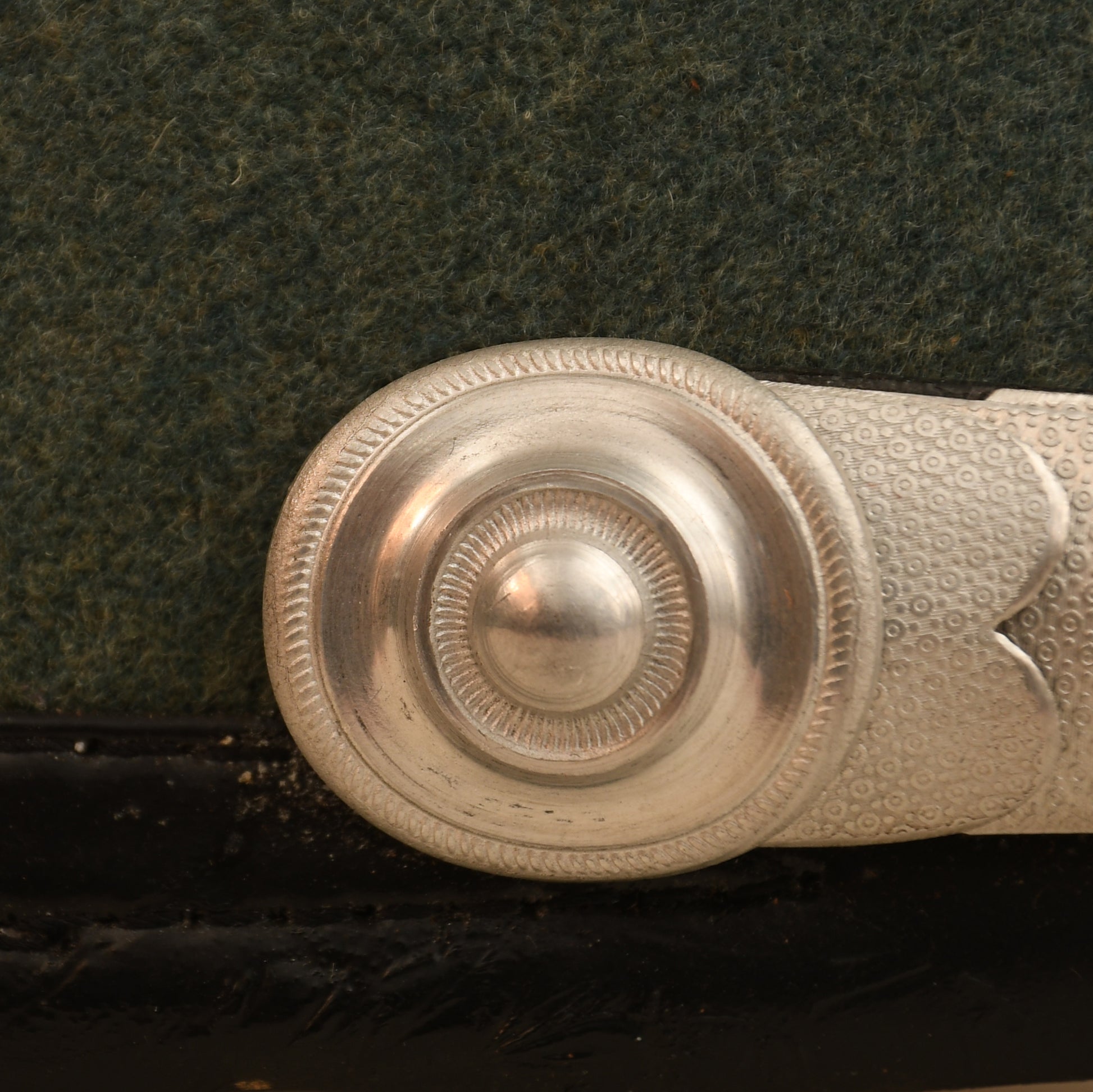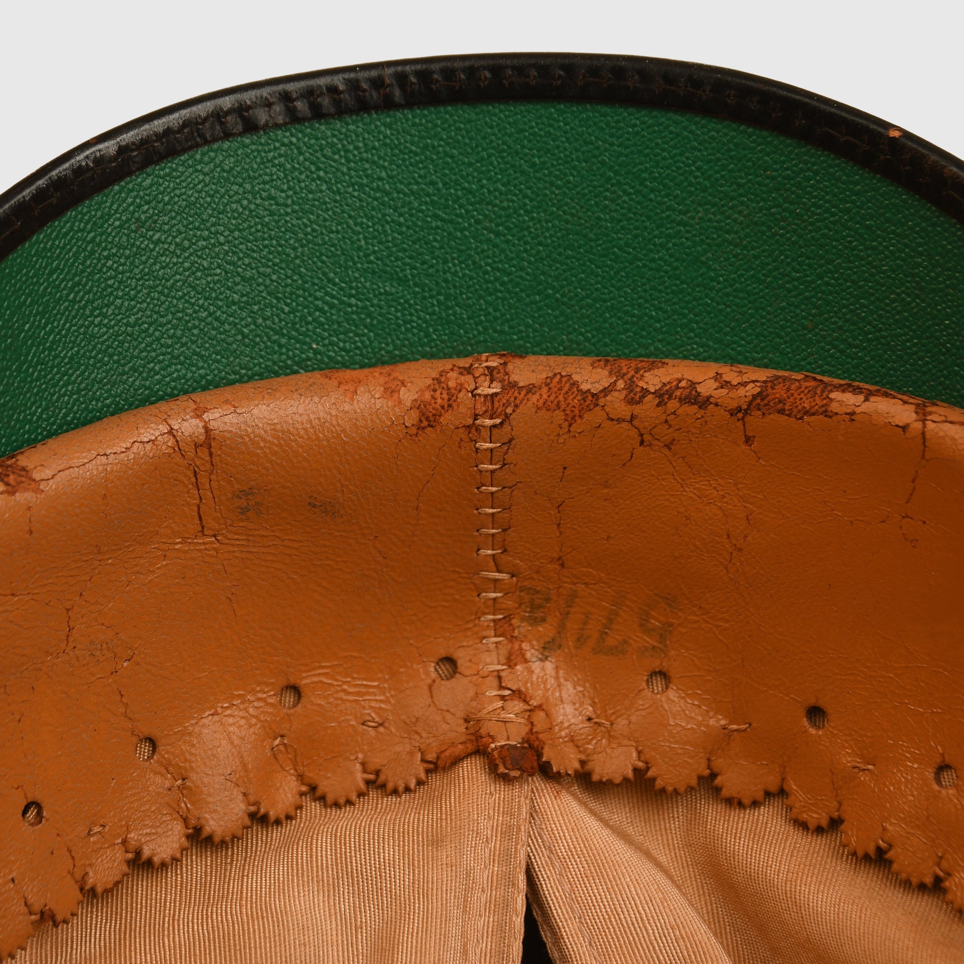 The black patent leather crown, along with the front and rear peaks, retains a high-gloss finish. The headgear is fitted with its correct aluminium cross-hatched domed chin scales and a matching three-dimensional officer's eagle. It also features the correct bullion wire field cockade and a white horsehair parade plume. While the original elastic band for the plume has perished over time, the plume is currently secured with a small section of lightweight wire.