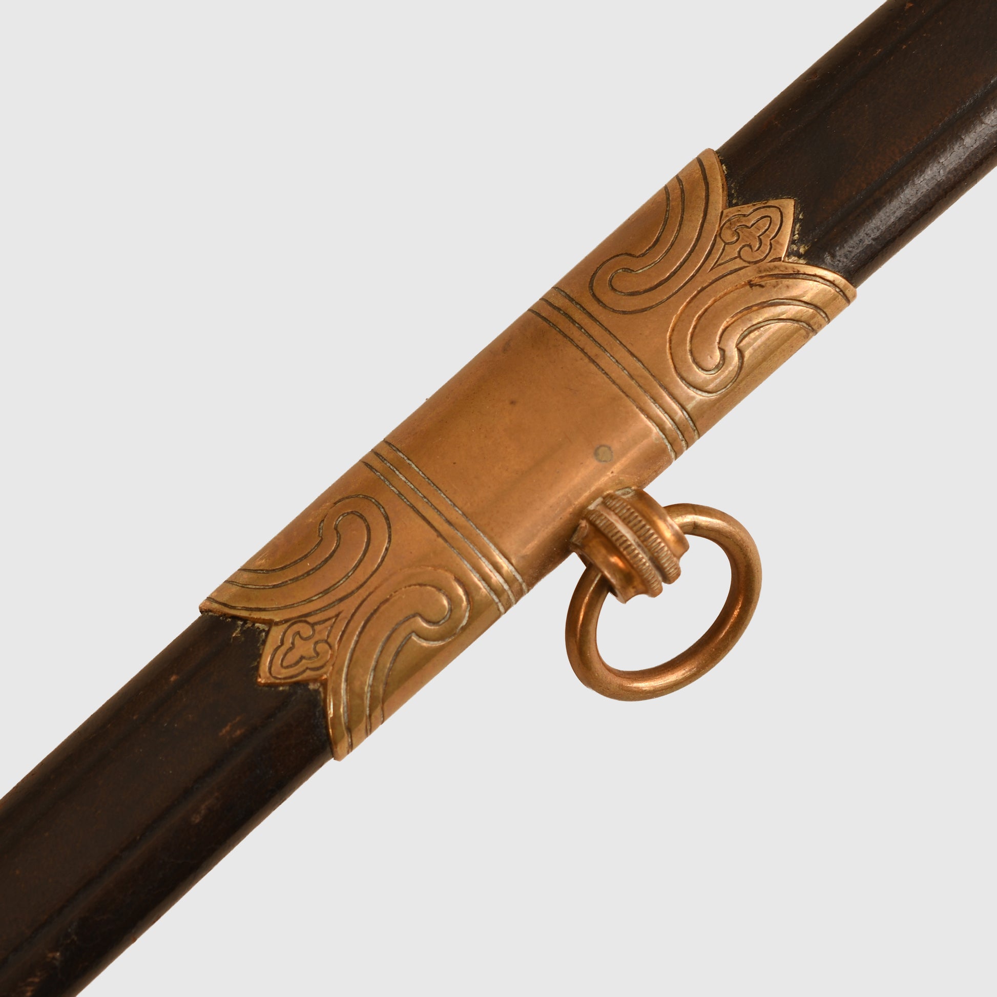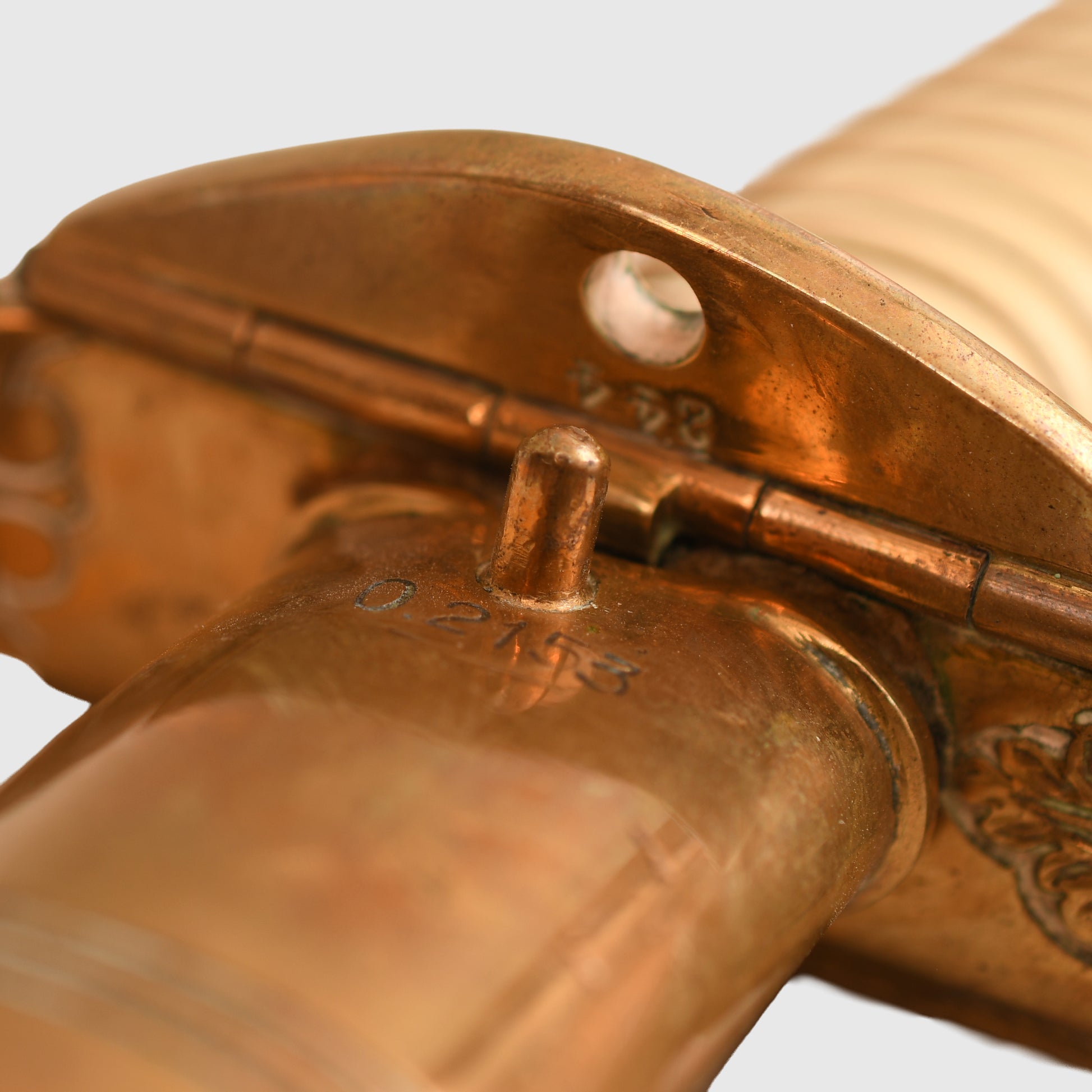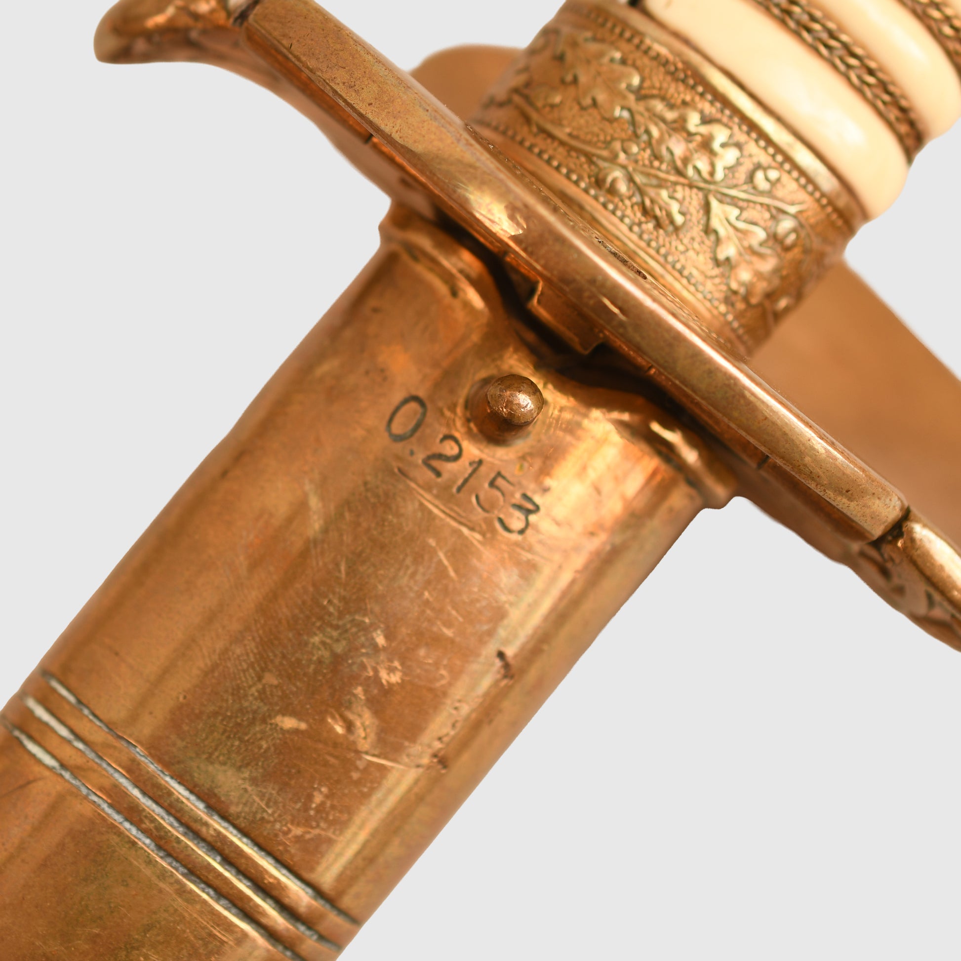 The grip, of imitation ivory, shows only minor surface cracks and retains all its grip wire intact. The lion’s head hilt, without glass eyes, displays fine detail, while the small folding shell guard bears the East Sea number O.2153, and the opposite larger guard remains fully functional. The leather scabbard is in excellent condition with only light abrasions, and the drag of the lower mount is clearly Third Reich marked.