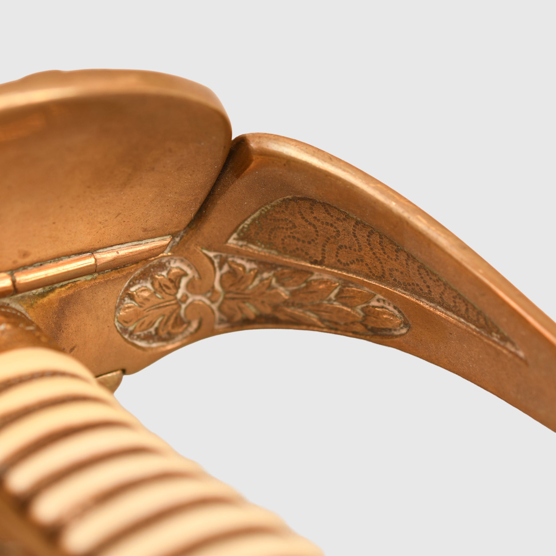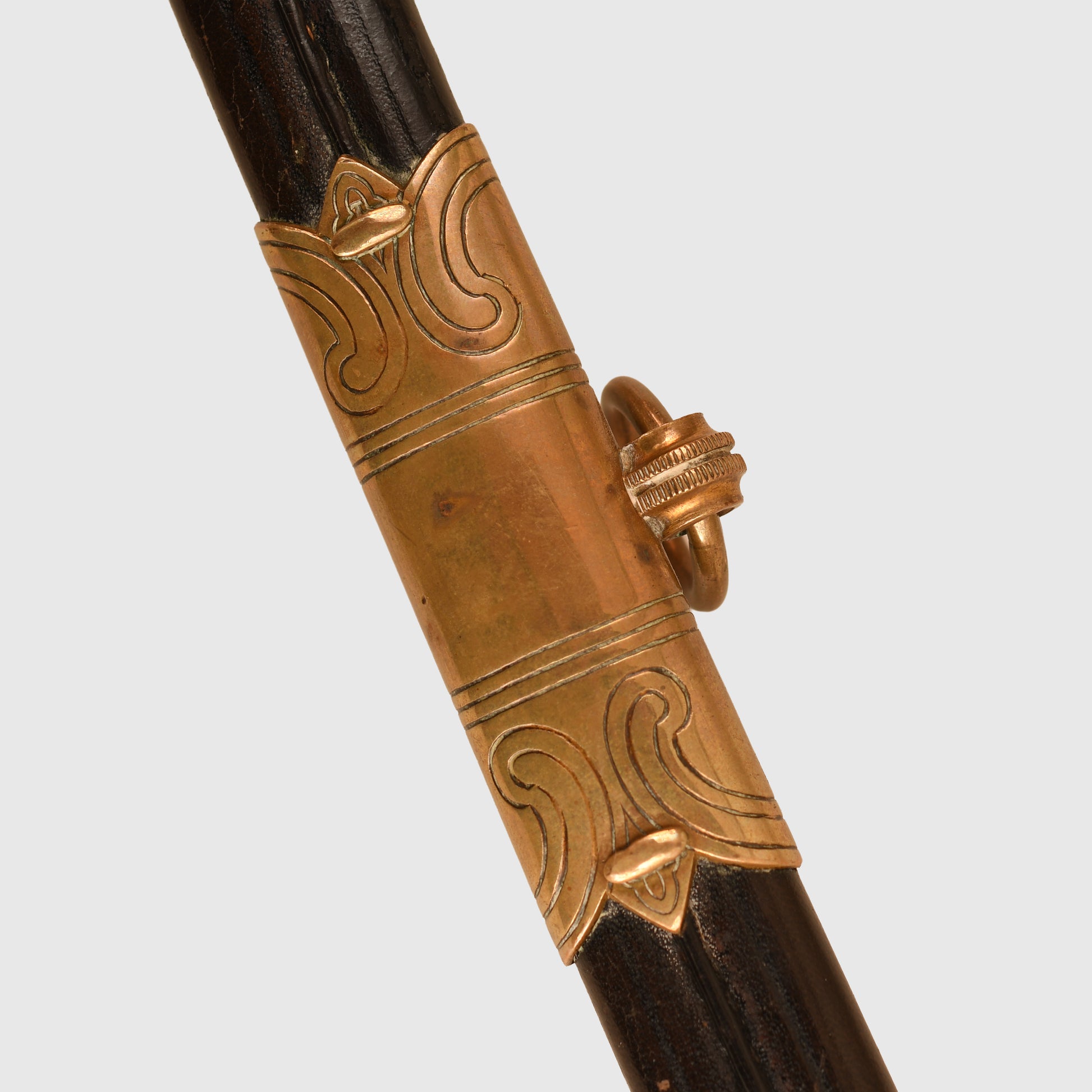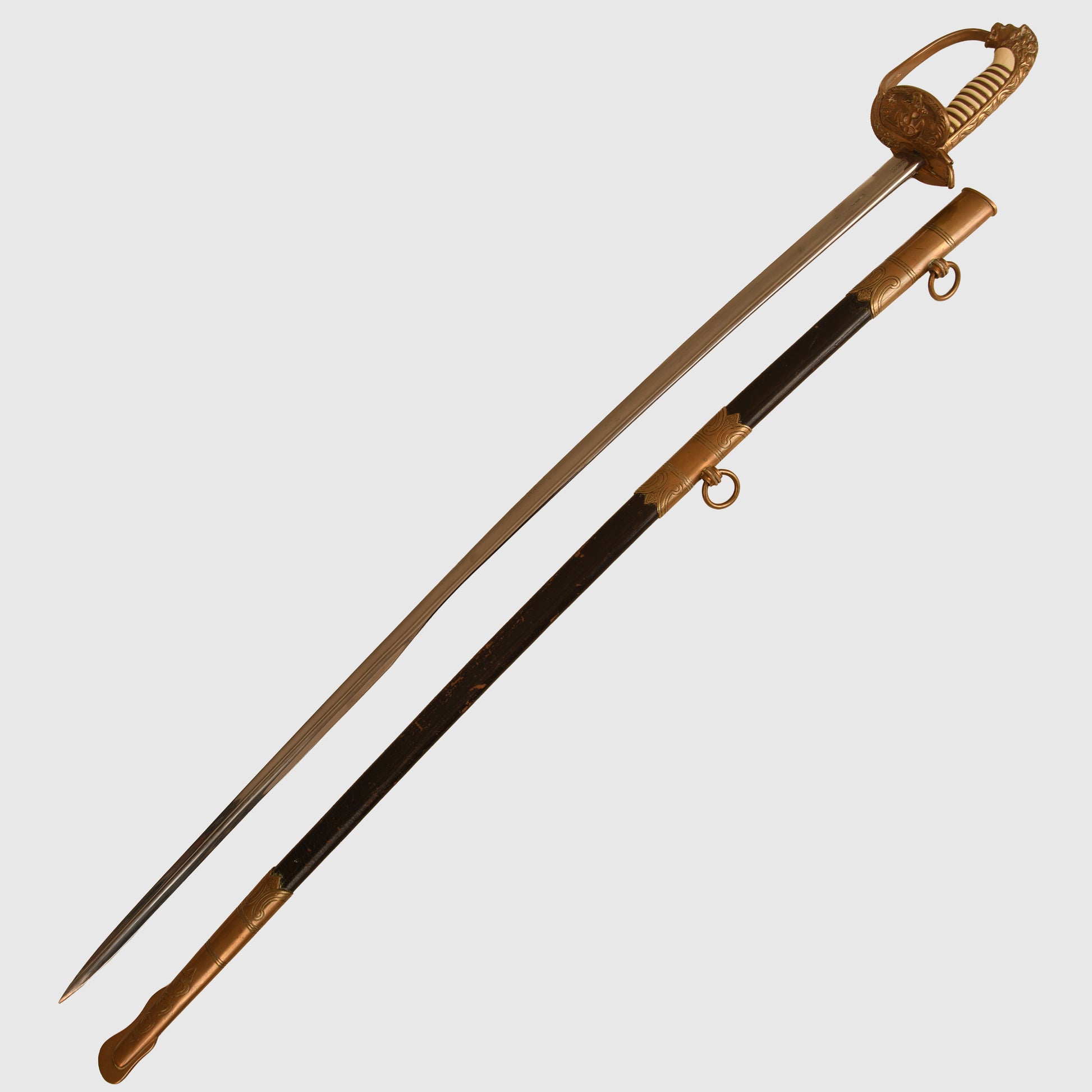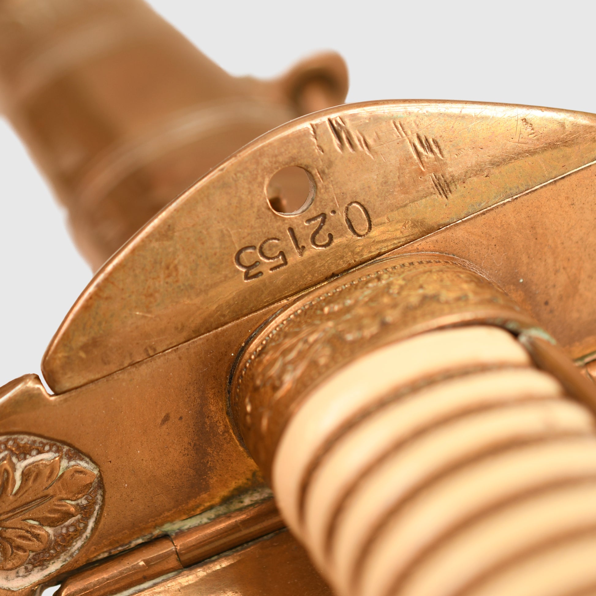 The grip, of imitation ivory, shows only minor surface cracks and retains all its grip wire intact. The lion’s head hilt, without glass eyes, displays fine detail, while the small folding shell guard bears the East Sea number O.2153, and the opposite larger guard remains fully functional. The leather scabbard is in excellent condition with only light abrasions, and the drag of the lower mount is clearly Third Reich marked.
