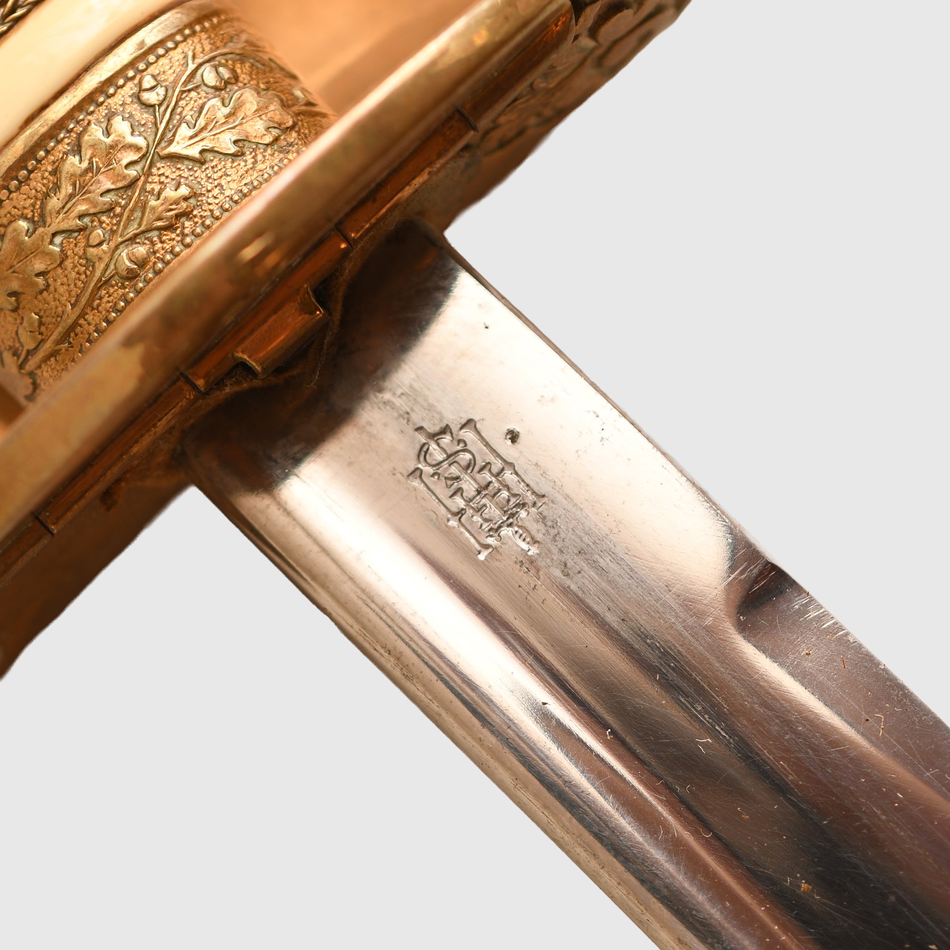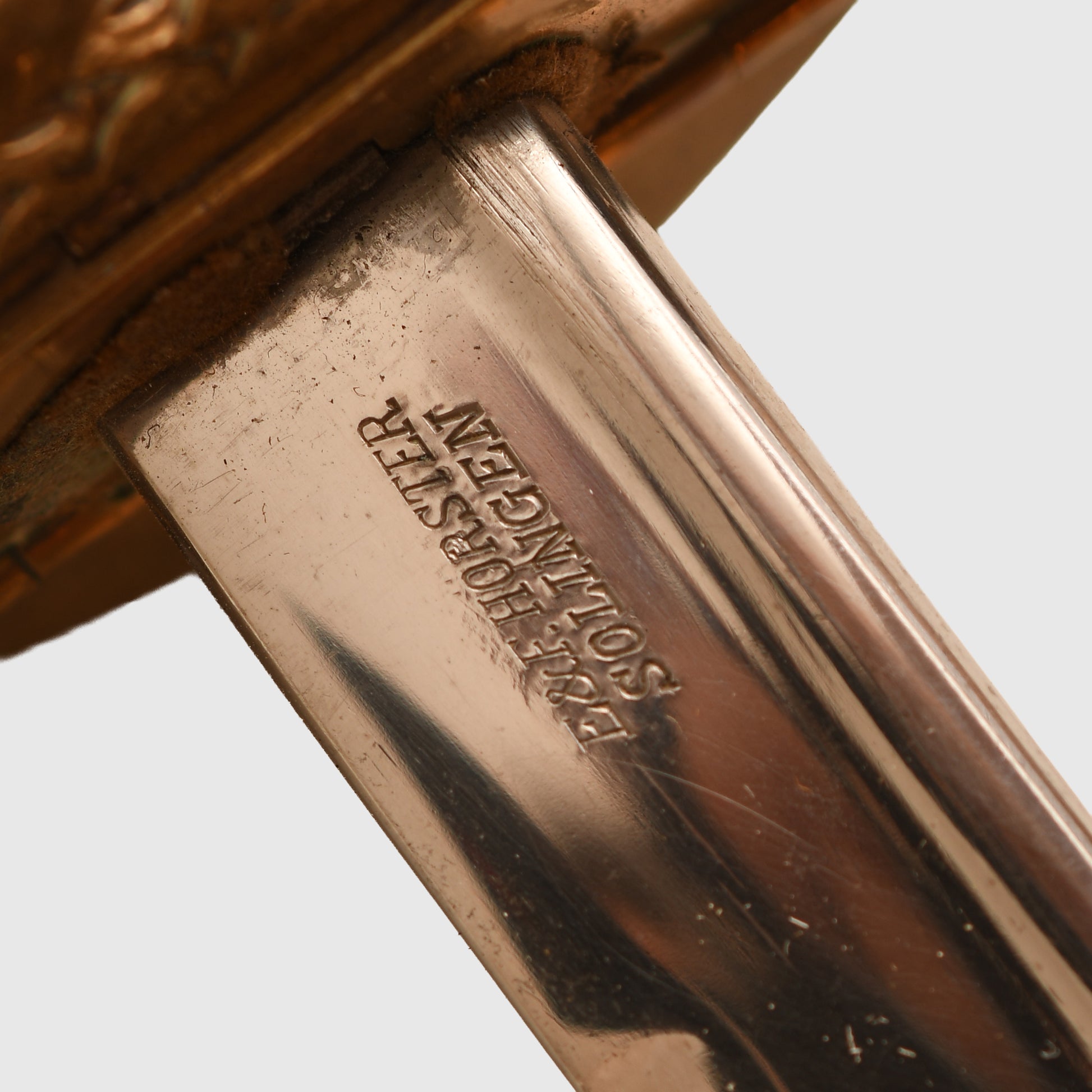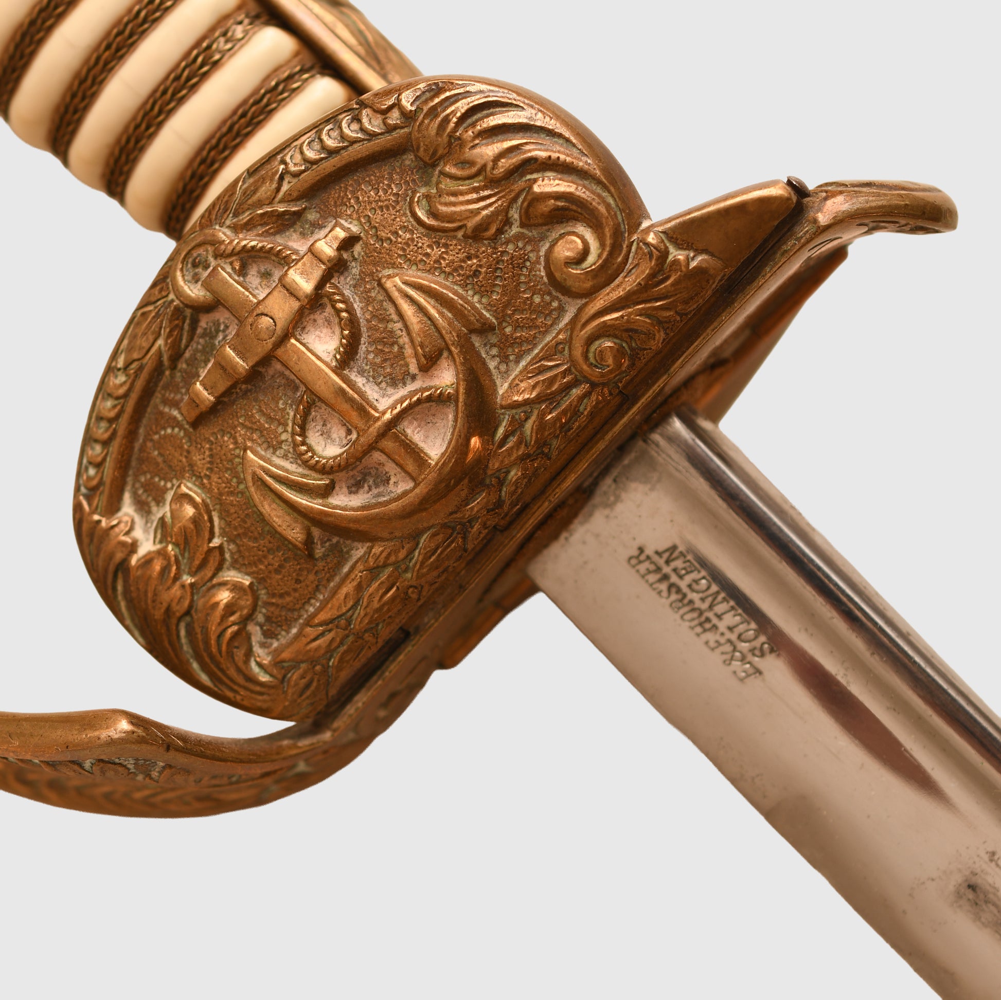 A fine and well-preserved example of a Third Reich period naval officer’s display piece. This is a true depot-issued model — far rarer than the more commonly encountered Weimar-era types often misrepresented as Third Reich issue. The plated, plain, pipe-backed surface remains excellent and is marked E. & F. Hörster, Solingen, with a clear Third Reich eagle stamp to the upper section.