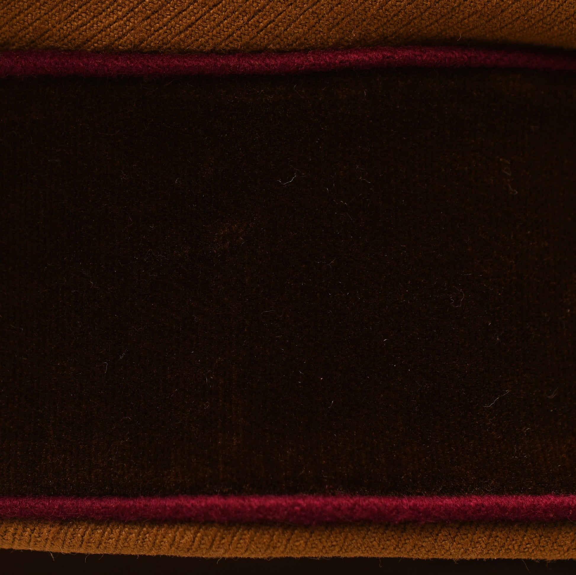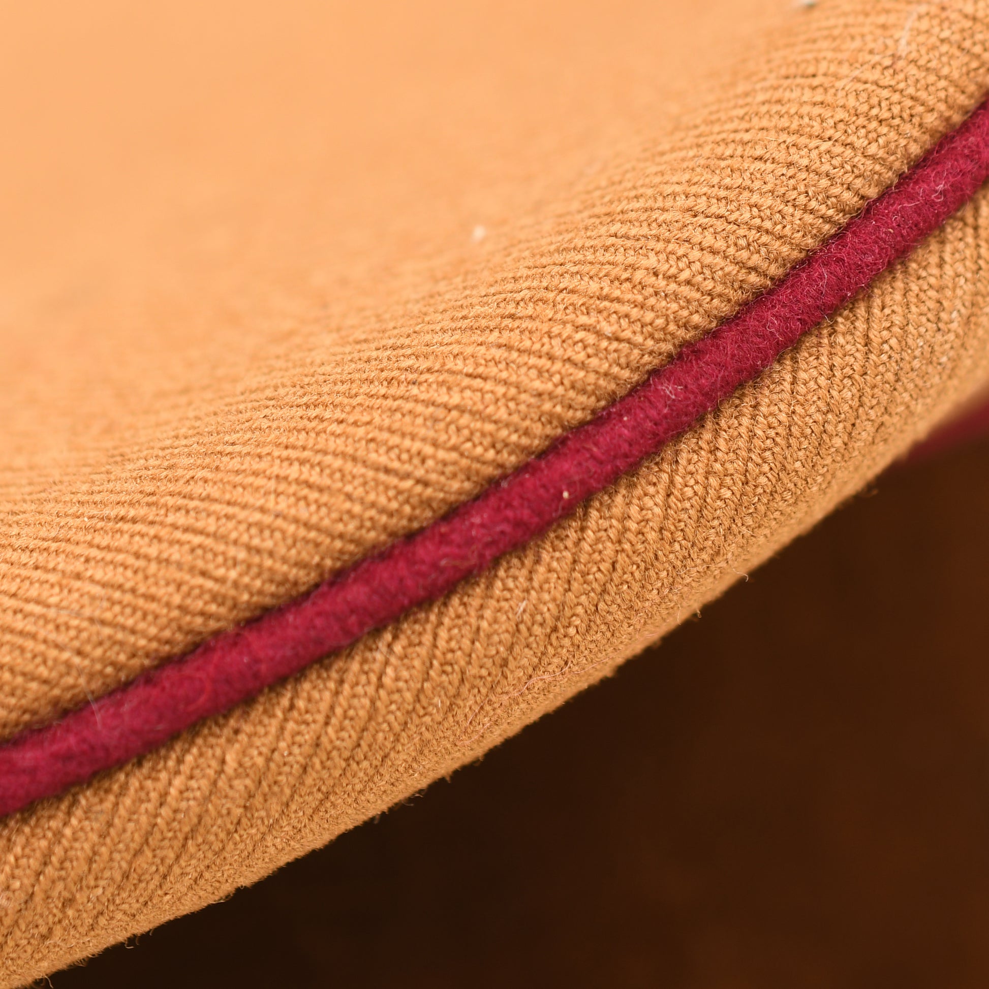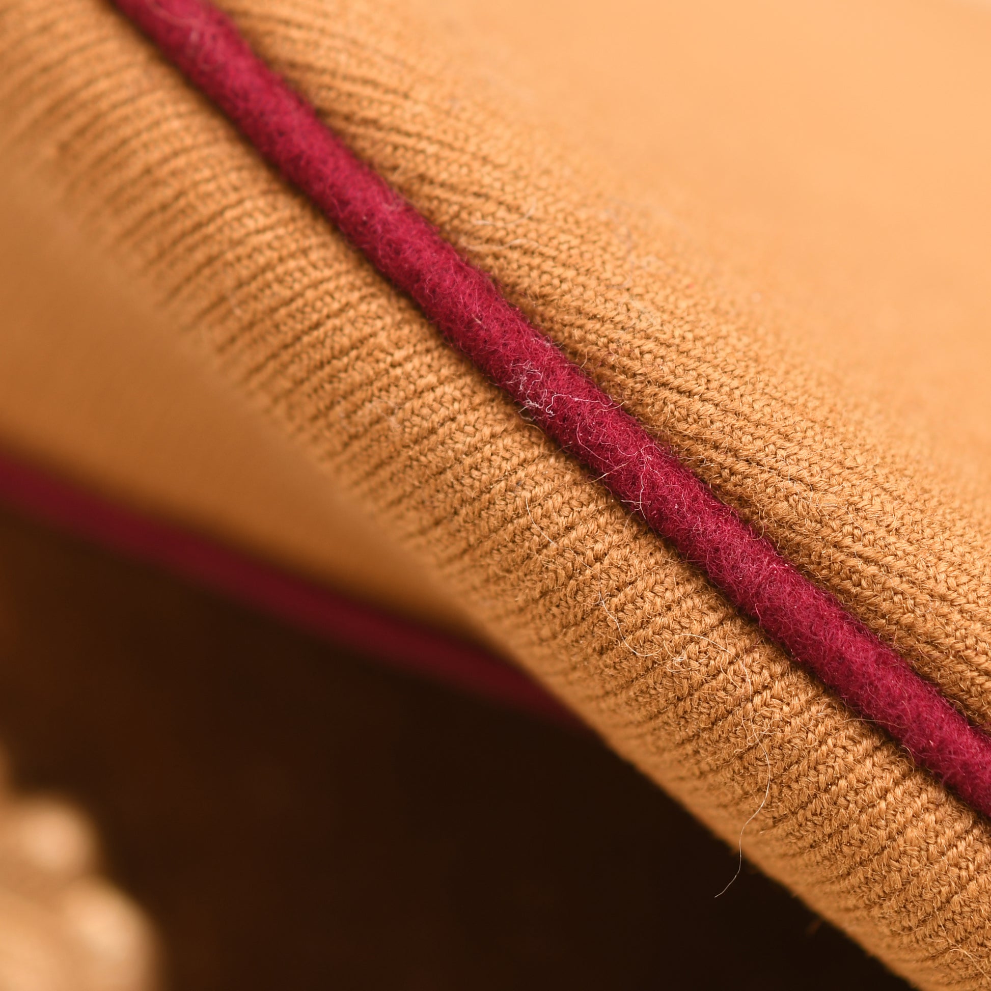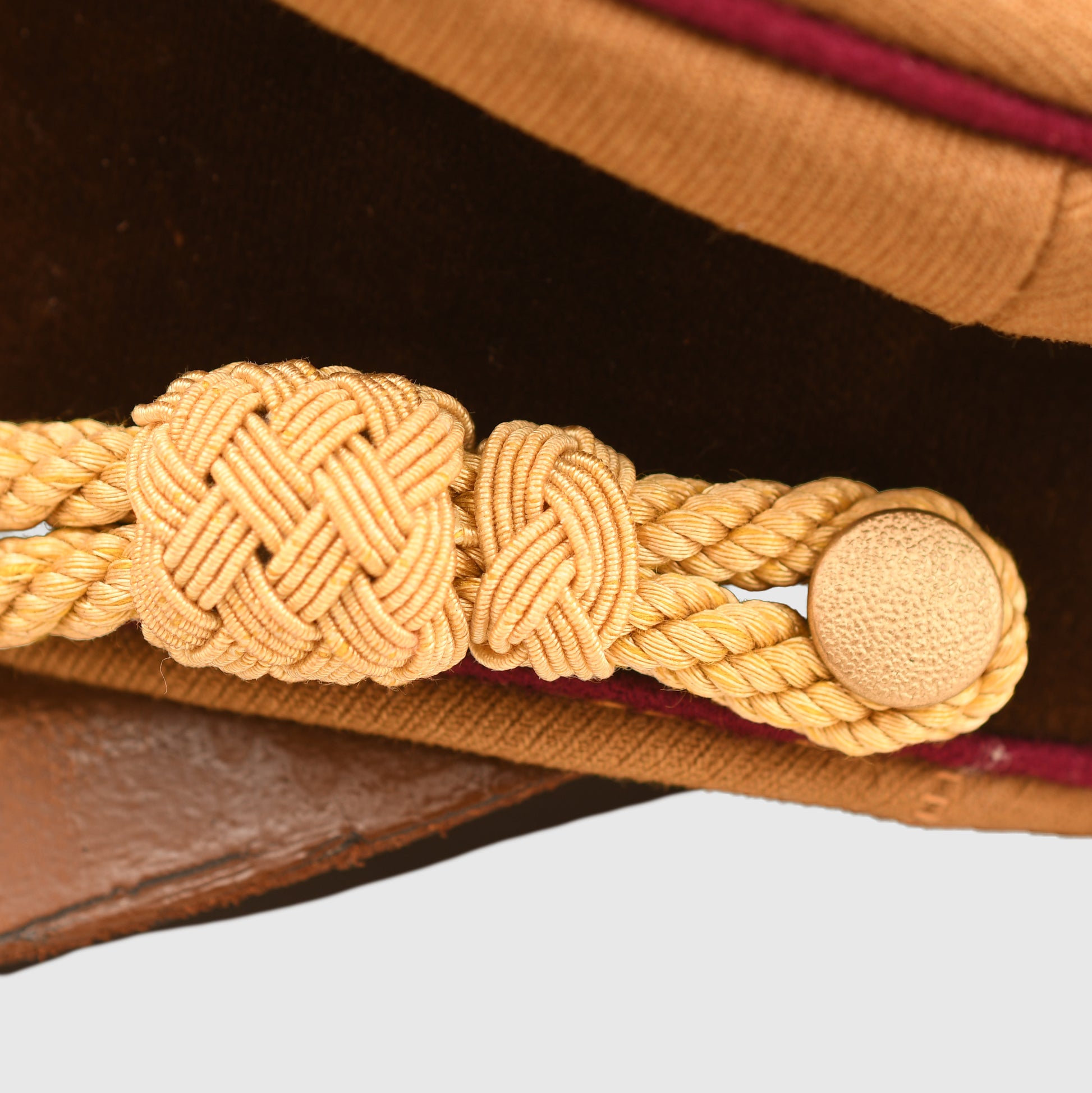 The cap is constructed from high-quality golden-brown ribbed material with a dark brown velvet centre band. It features the distinctive wine-red piping to the crown and both edges of the centre band, signifying the Gau level of administration. The gilt finish on the eagle and wreath insignia remains bright, and the enamel on the central cockade is entirely undamaged. The cap is fitted with gold-coloured chin cords secured by matching side buttons and features a flexible, leather crushable-style peak.