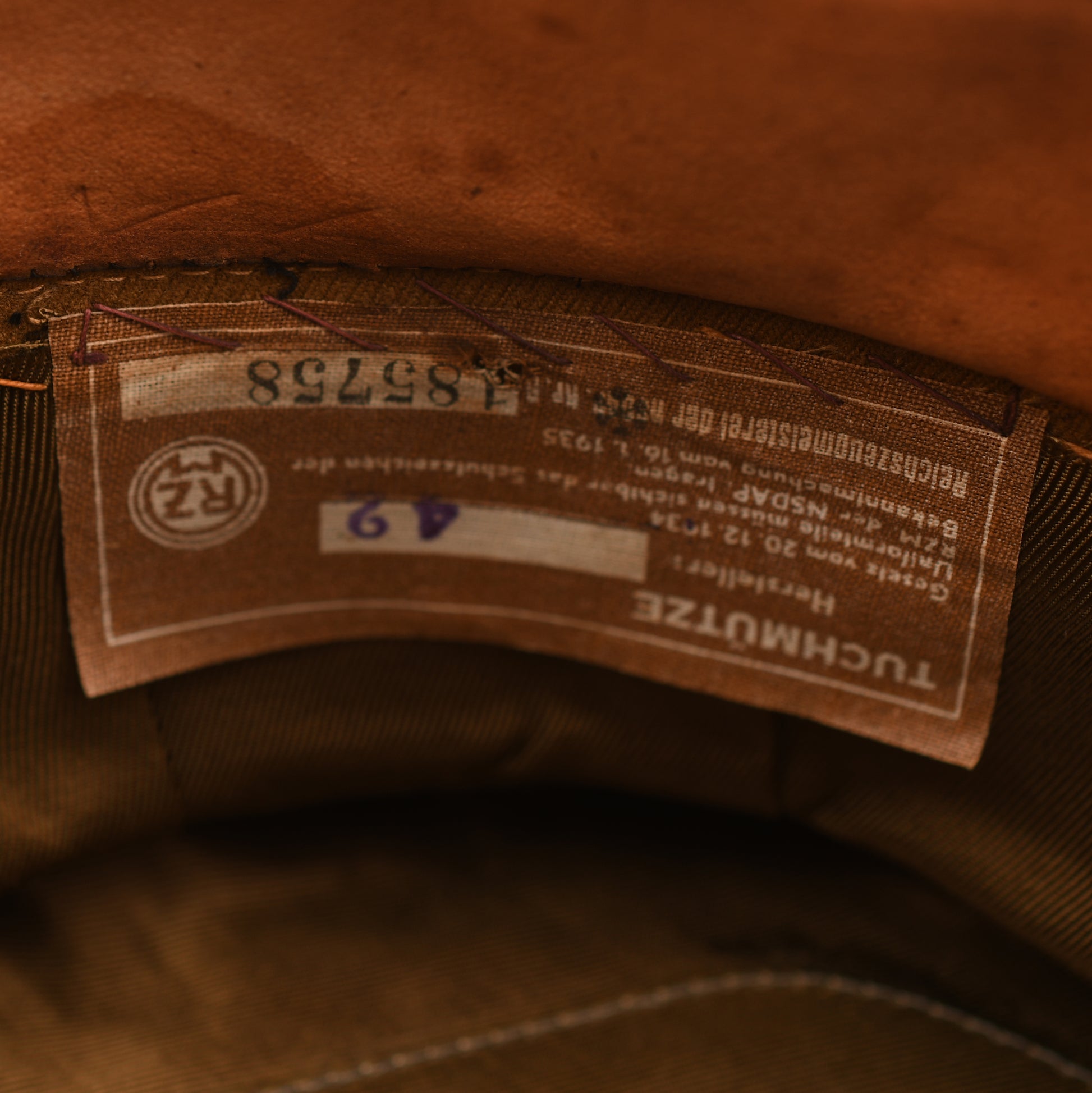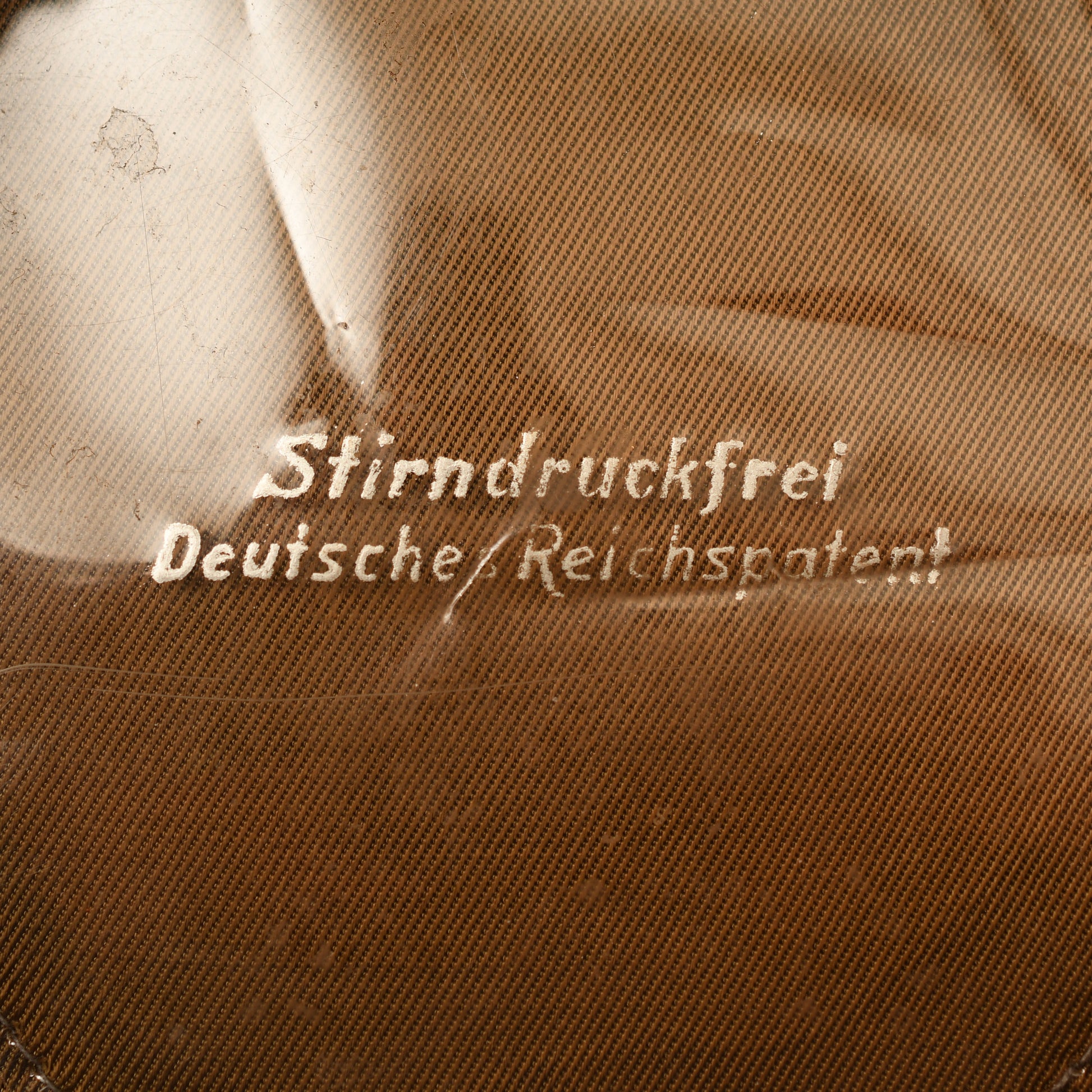 The interior is lined with golden-brown rayon and includes a complete, undamaged celluloid lozenge. The lozenge is silver-imprinted with the patent mark Stirndruckfrei Deutsche Reich Patent, indicating a pressure-free forehead design. The mid-tan leather sweatband is fully intact and retains the original canvas RZM acceptance label stitched beneath it. While not explicitly size stamped, the cap fits approximately as a size 58 or 59. This example is free from moth damage, staining, or visible imperfections, representing a premier piece of political headgear.
