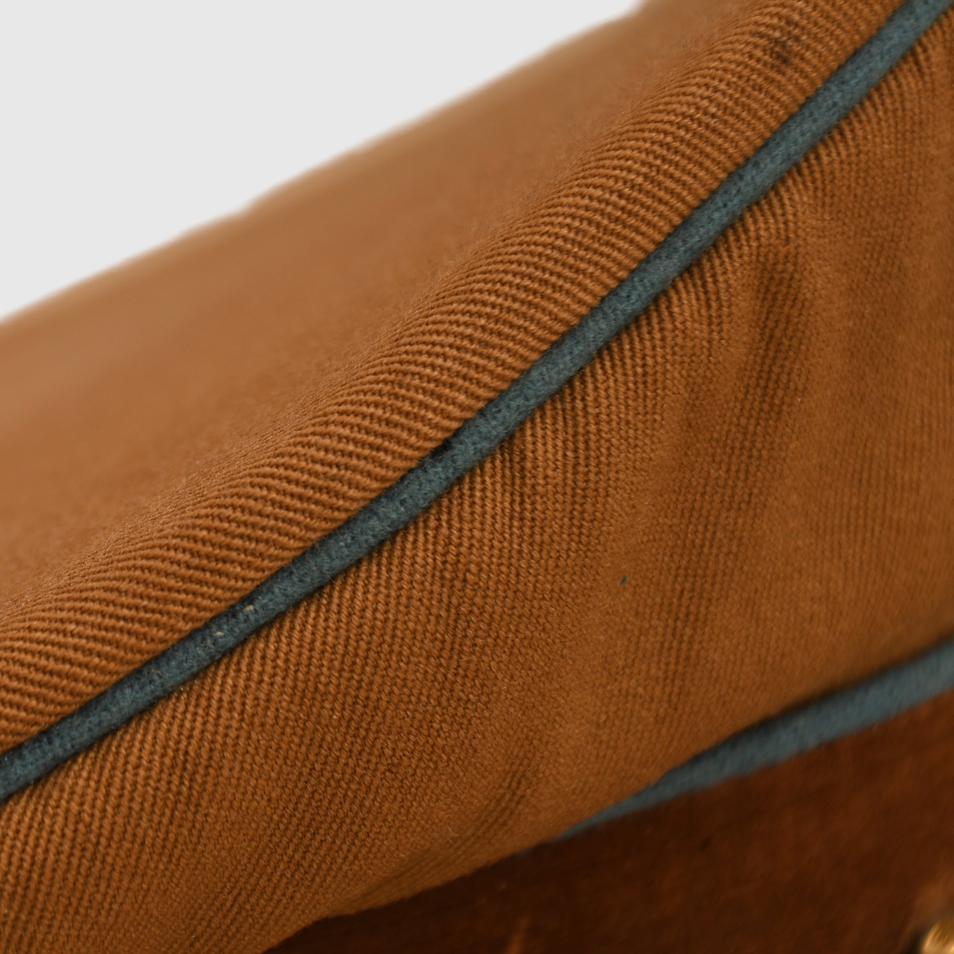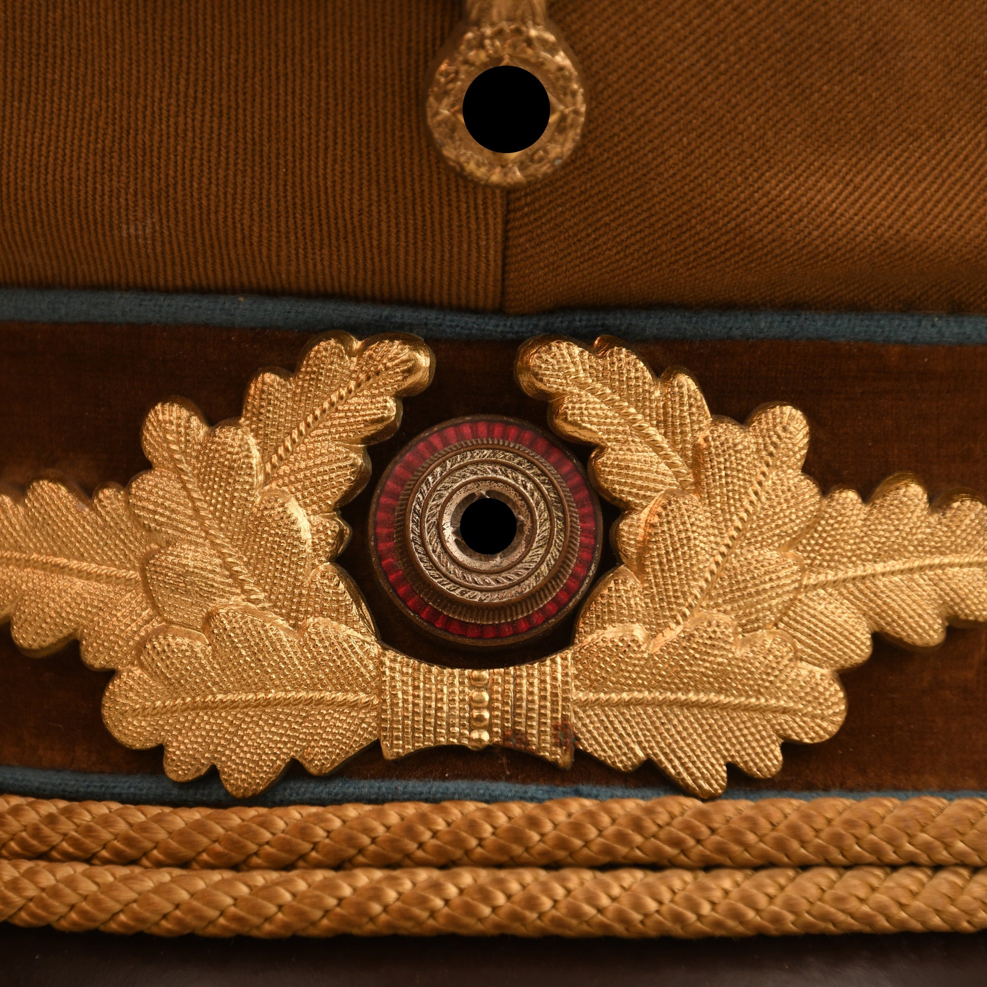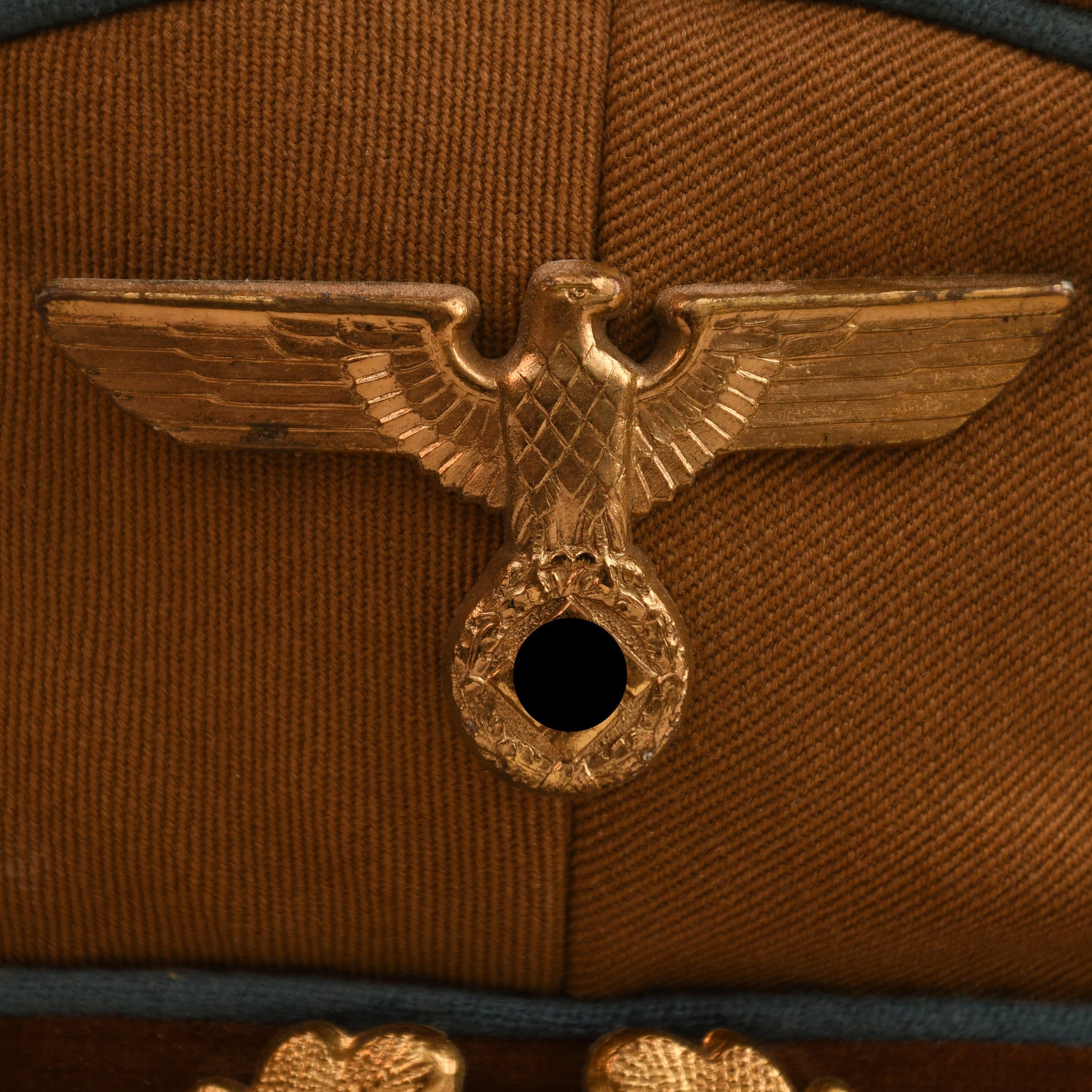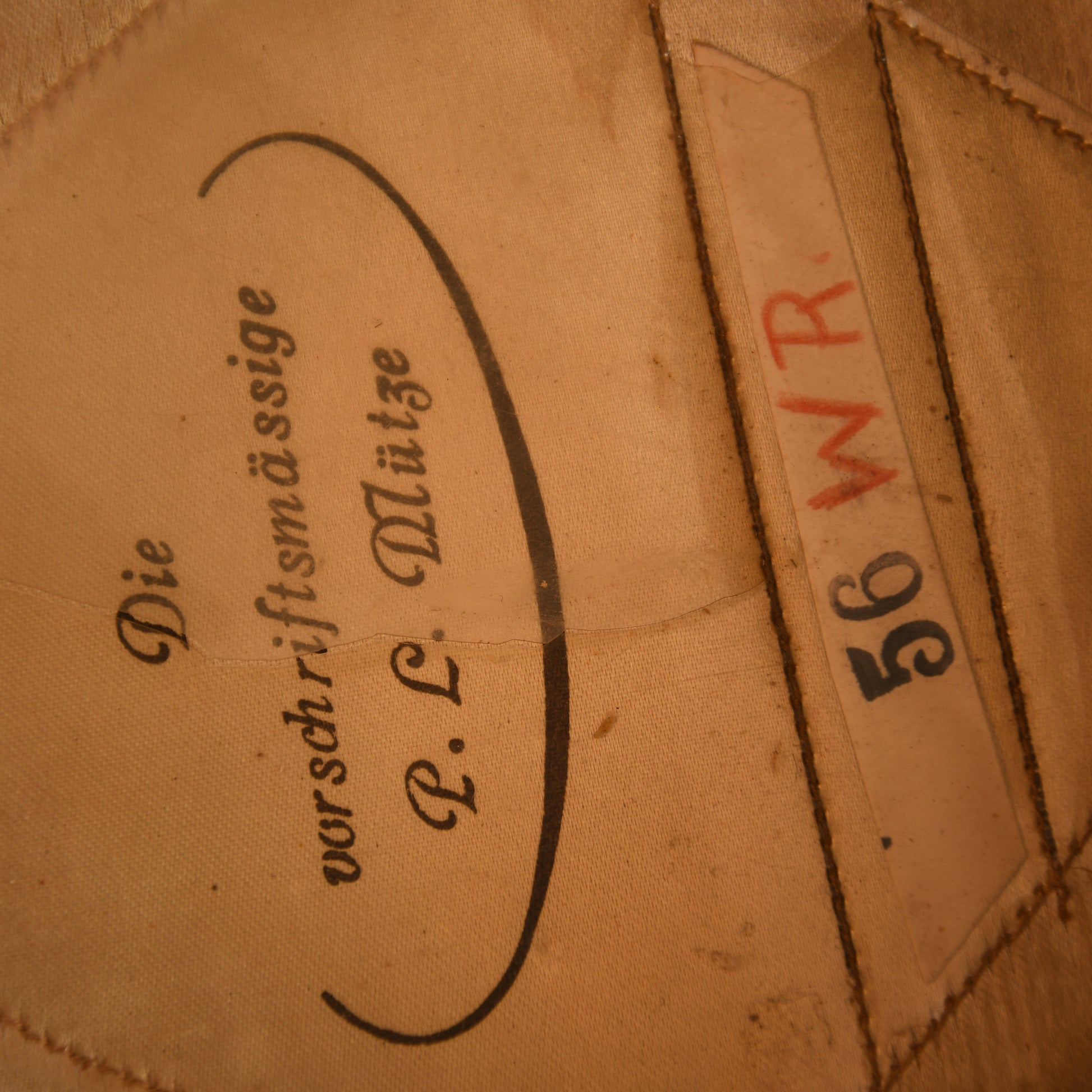 A size 56, service-used political officials cap in blue with piping, featuring a high saddle shape and constructed in typical political canvas-like material. The brown velvet centre band is complemented by bright gilt political eagle and cockade, with the enamel on the central political button undamaged. Blue piping indicates Orts Group, with gold cap cords present. The interior sweatband is of substitute leather, creased but intact, and the light cream silk lining retains a complete, though cracked, centre celluloid lozenge with maker’s name and size label (56) bearing the initials WR. One minor moth nip or snag to the lower rear inner edge. The inner foam forehead cushion is intact and soft.