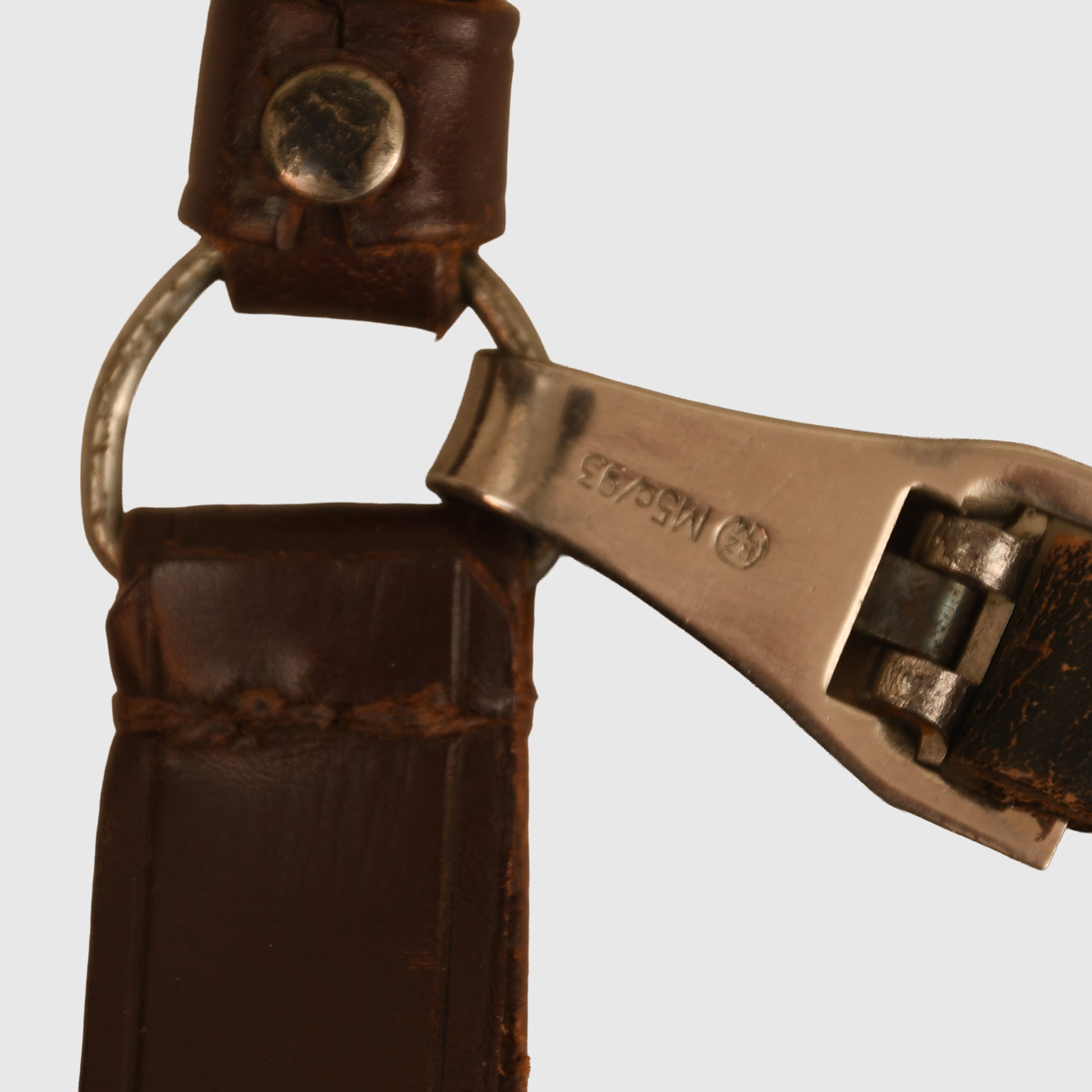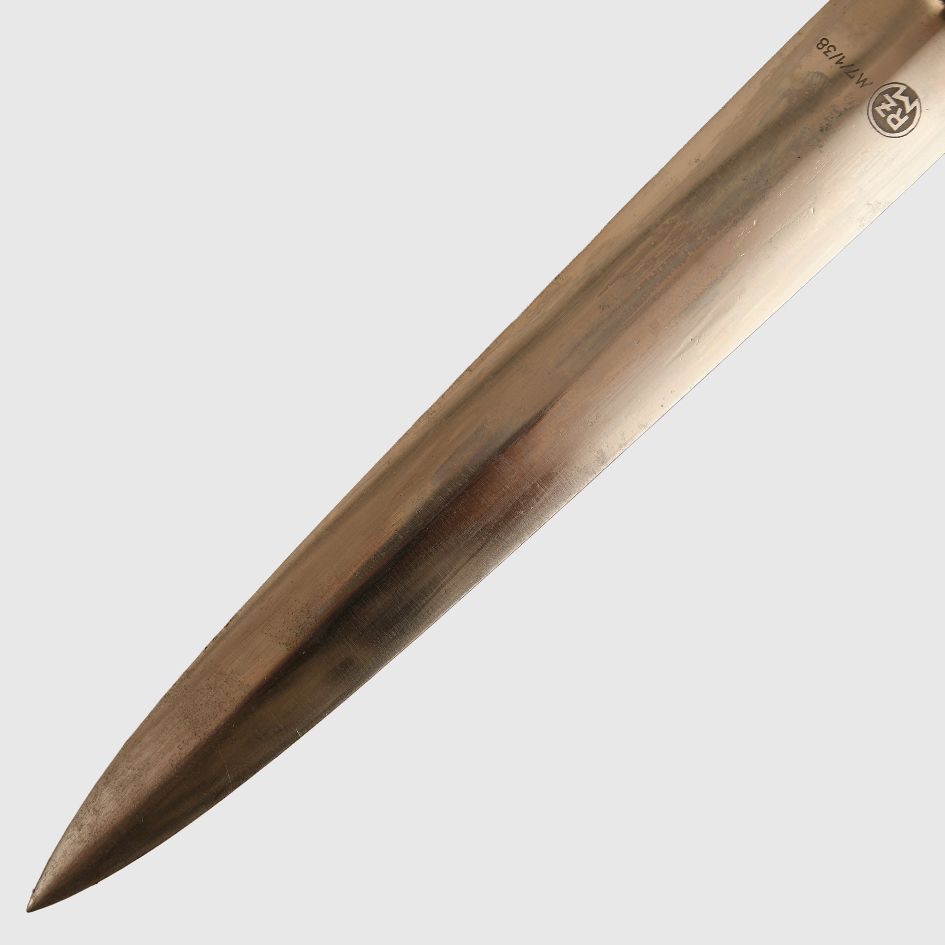 Fitted into its original black painted scabbard, which shows no chipping or damage to the mounts. Complete with its original triple hanger: a main black leather strap with an ‘RZM M5c/93’ stamped belt clip, accompanied by a brown belt loop and upper grip strap.