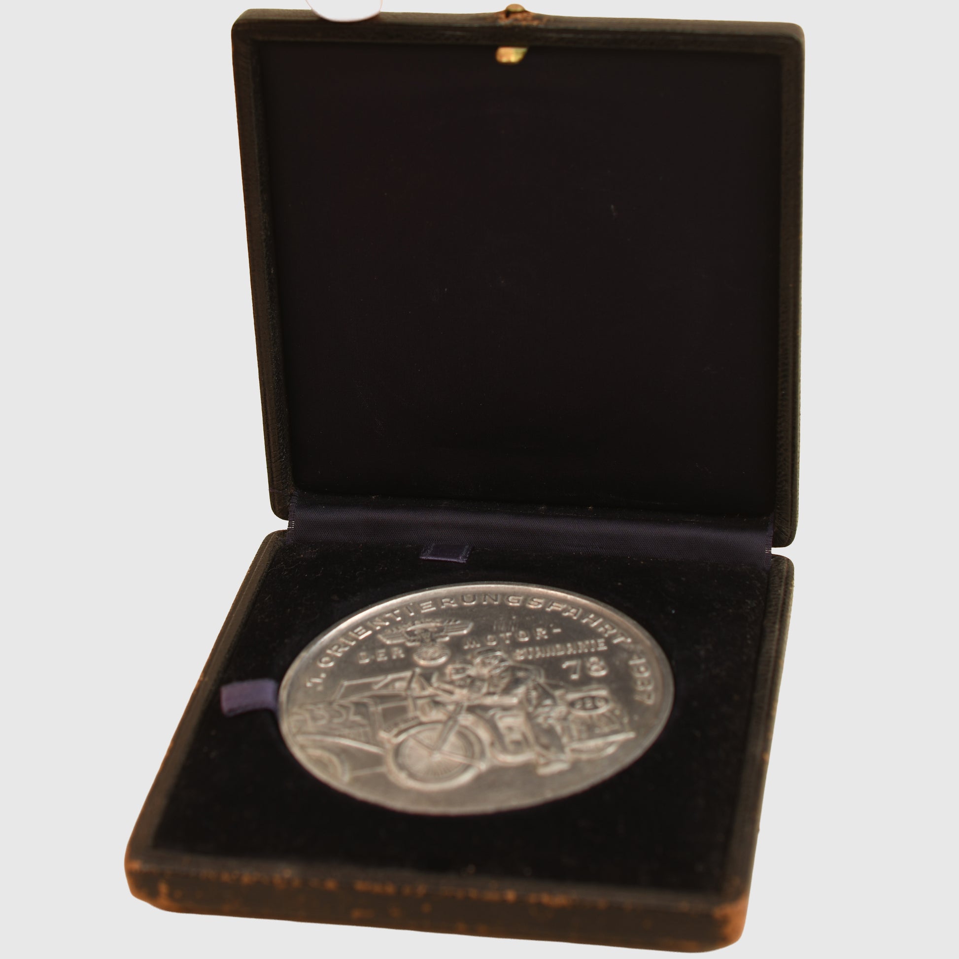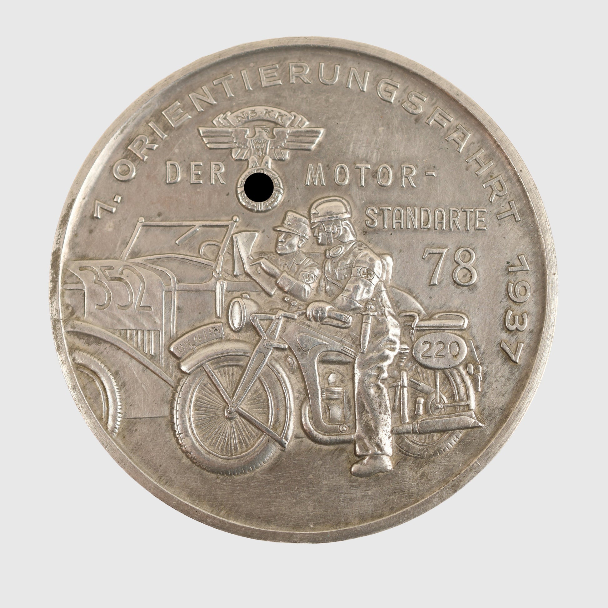 A deeply struck, heavy white metal circular plaque in excellent condition. The front depicts the 1937 Orientation Drive of Standarte 78, showing an NSKK motorcycle with a swastika armband speaking to an SA or NSKK man in a vehicle. Maker marked on the reverse ‘C. Balmberger, Nuremberg’. A highly unusual and attractive NSKK commemorative plaque.