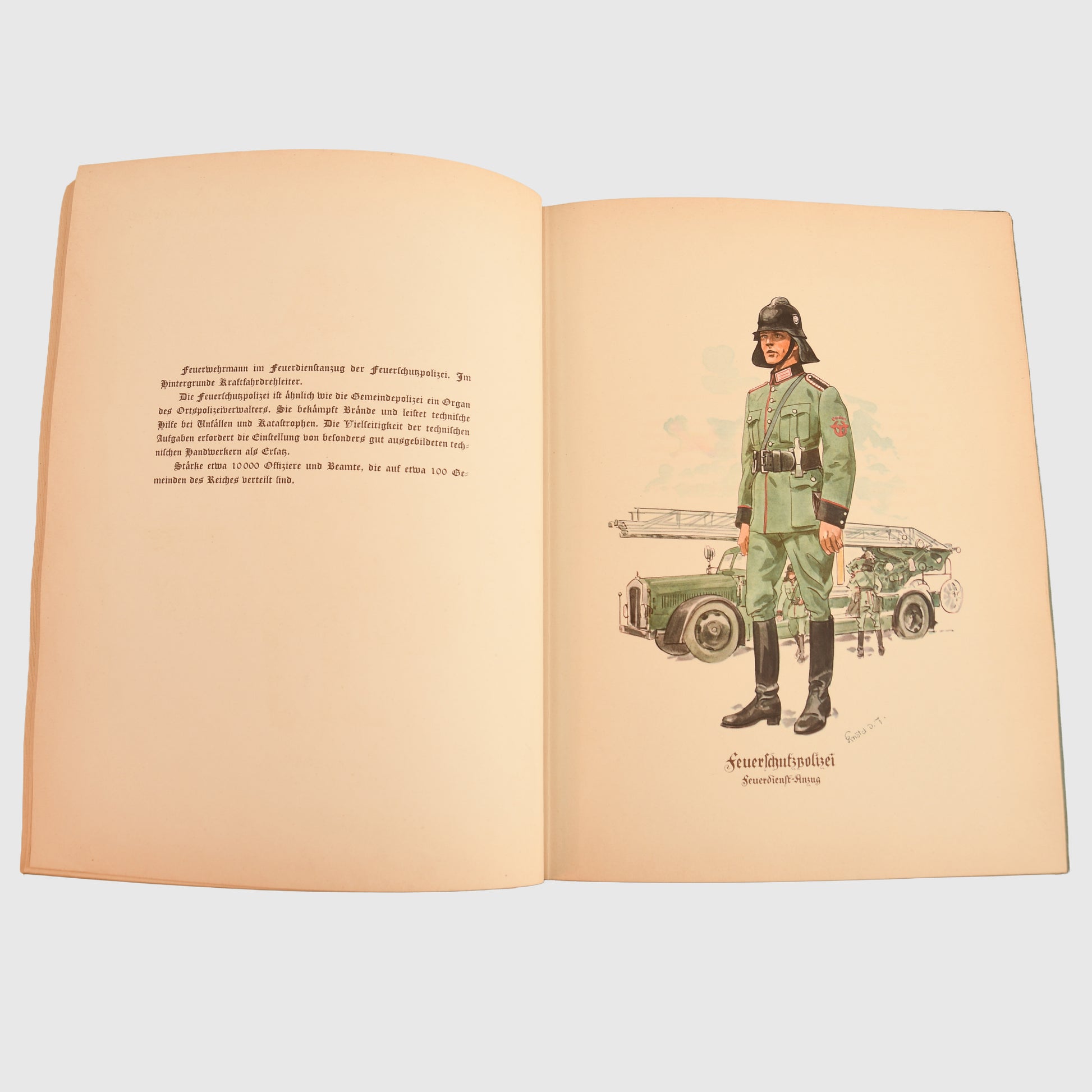 Between the colour plates are additional pages of text describing the uniforms and the departments they represent. The book concludes with a full-page section on the organisation of the Ordnungs Polizei system within Germany.