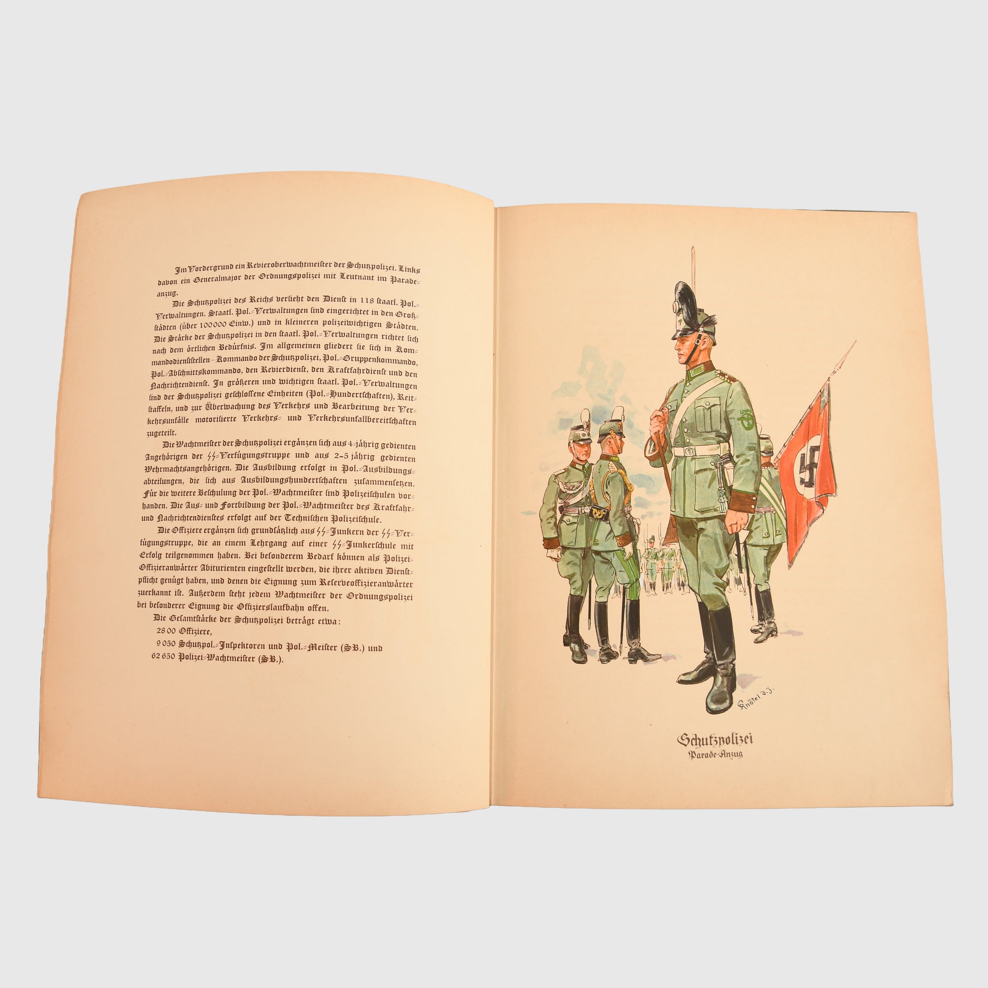 The plates depict every aspect of German Ordnungs Polizei uniforms, beginning with the carrying of the police standard and concluding with officers assembled together. The artistry and depth of colour are exceptional. All images are hand drawn by Herbert Knotel (1893–1963), a renowned military artist, and each plate is signed “Knotel.”