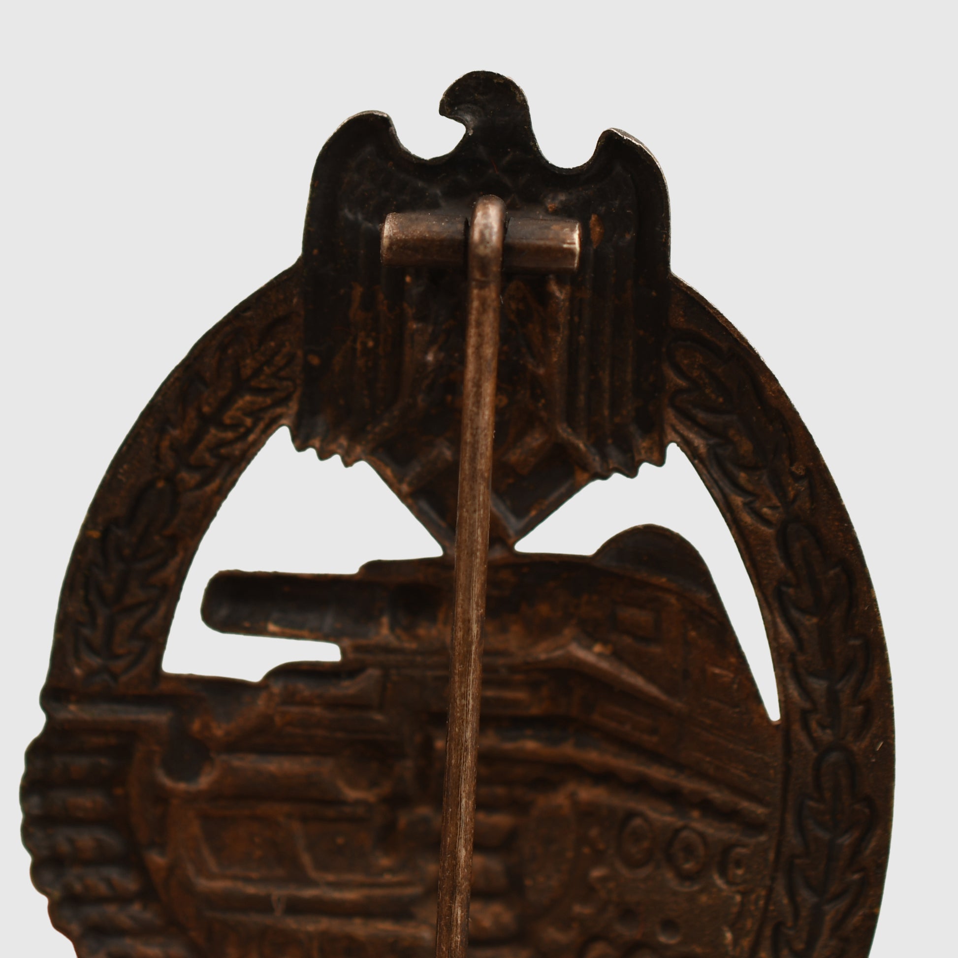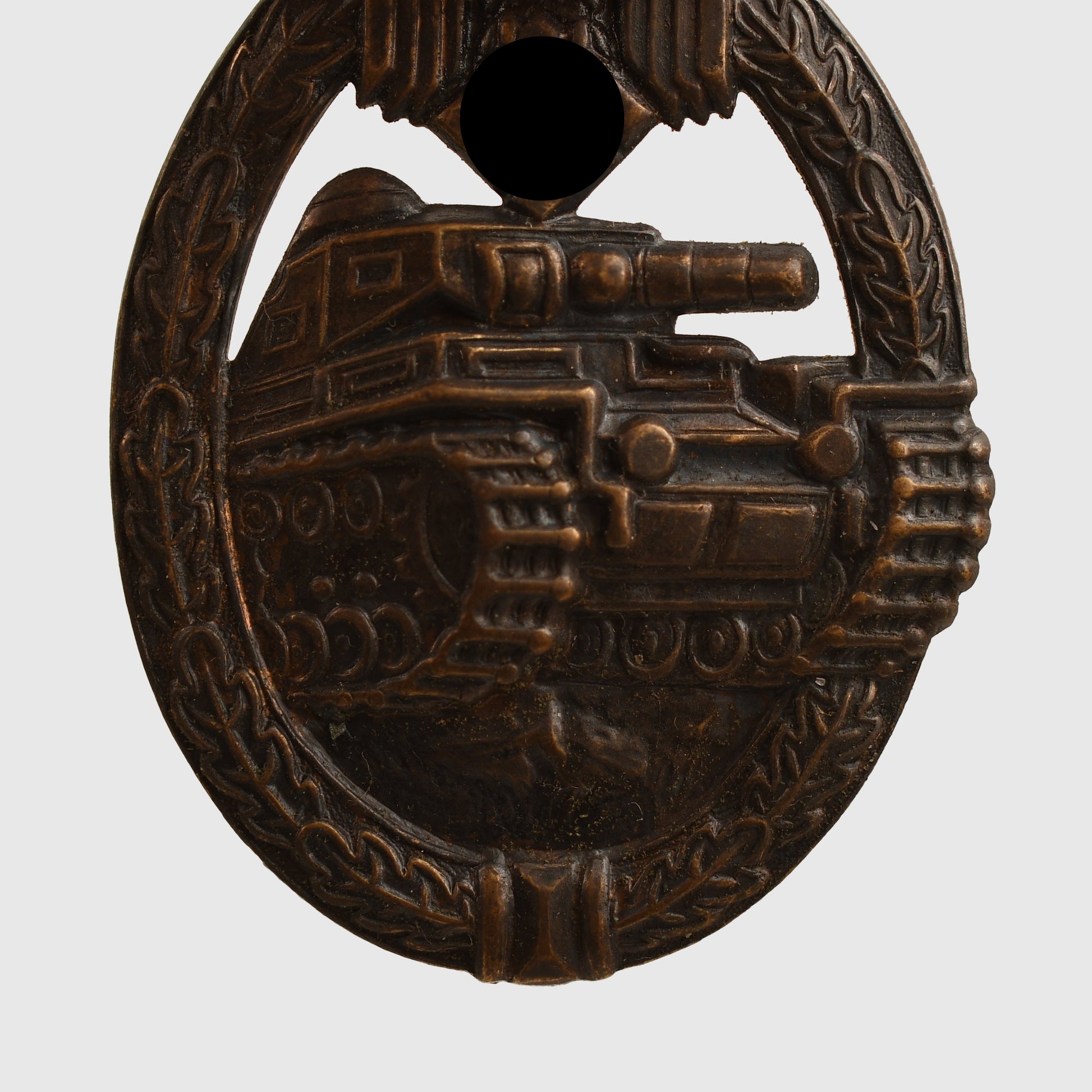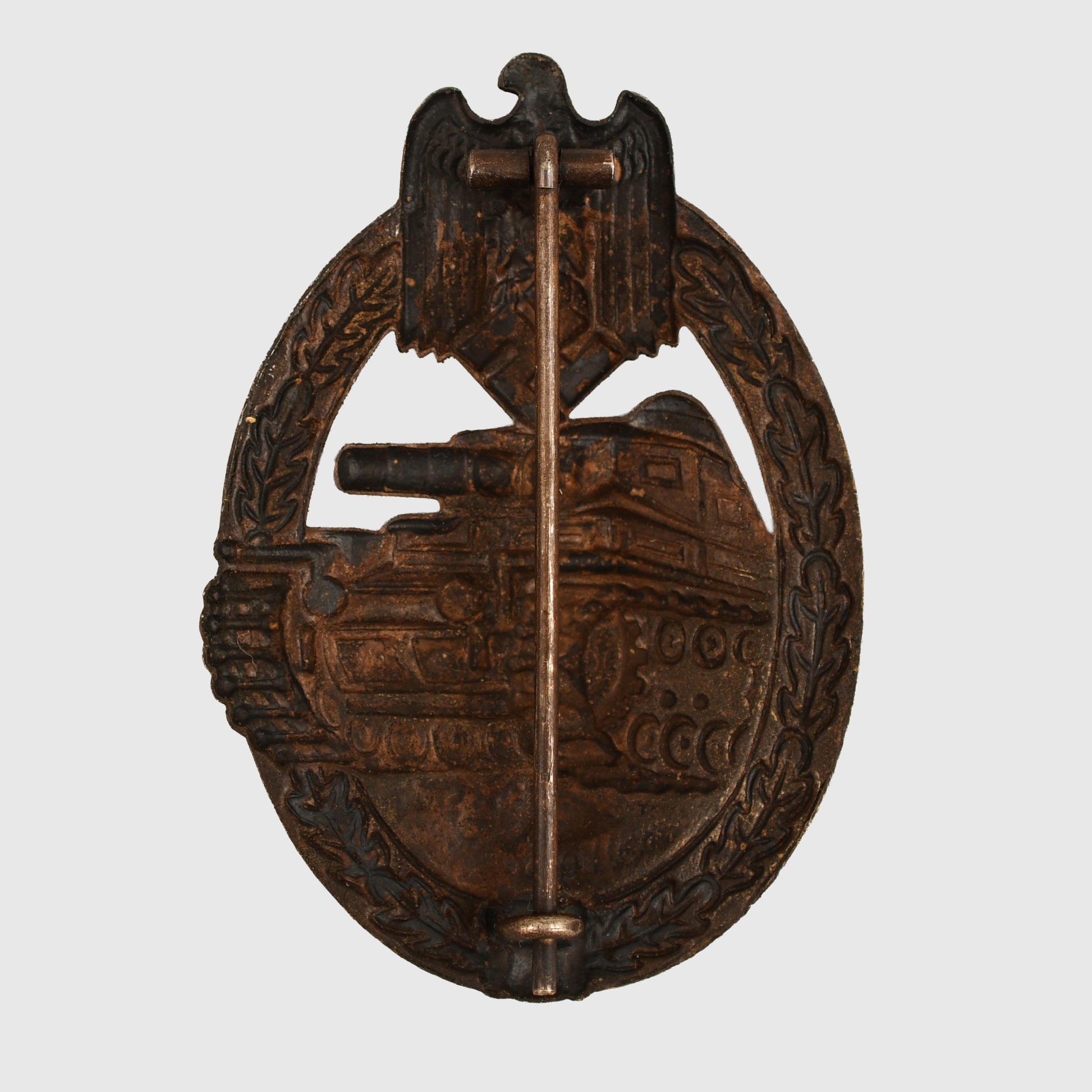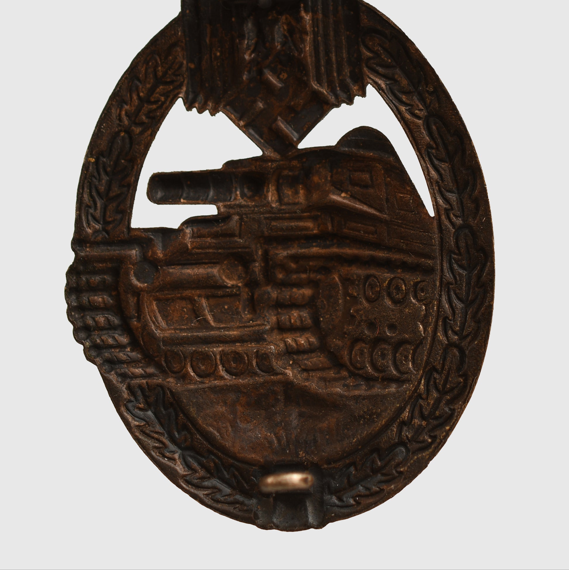 The one-piece stamped example, non-maker marked of the Panzer assault badge in bronze, complete with its original pin hook and hinge.