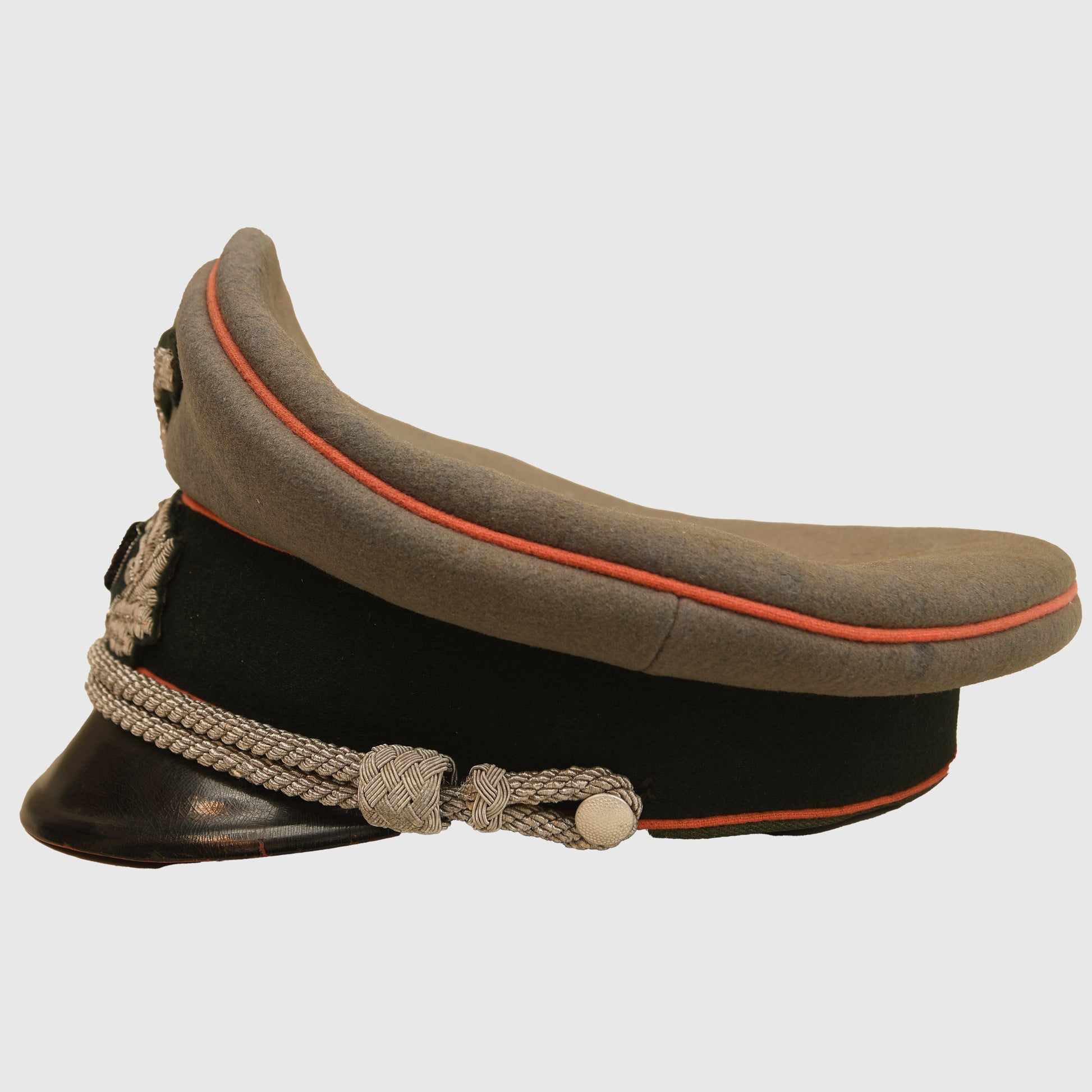 Fitted with a matched set of bullion wire national eagle and cockade, as well as standard officer’s silver cap cords. The fibre visor interior shows considerable wear from use. The ersatz sweatband displays some minor surface cracking over the canvas base. Inside, the gold satin lining is intact apart from a 1cm x 1.5cm section missing from the center celluloid lozenge. A solid, service-used example.