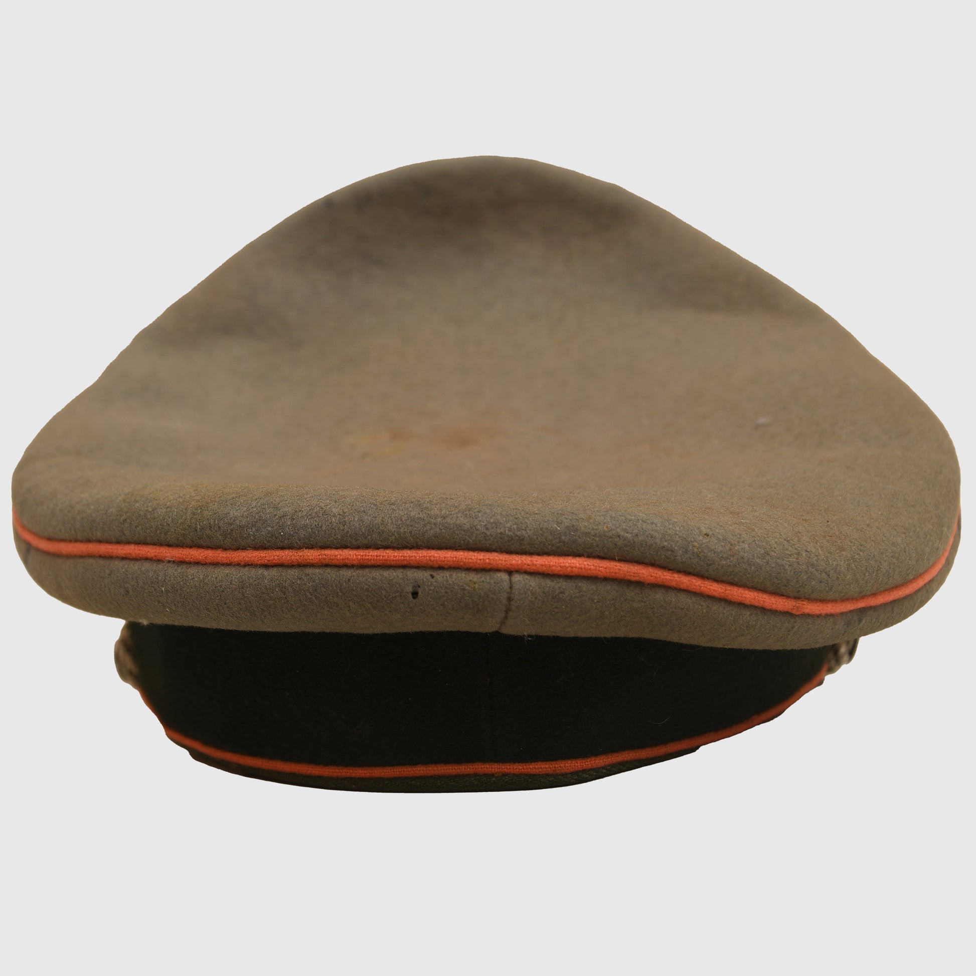 A well-worn example of a WWII German Panzer officer’s visor cap in the desirable high saddle shape, constructed from light grey Melton wool. The crown exhibits minor moth nips and tracking, with three small nips to the rear overhang. It features the standard dark green center band with a clear, strong pink waffenfarbe indicating Panzer service.