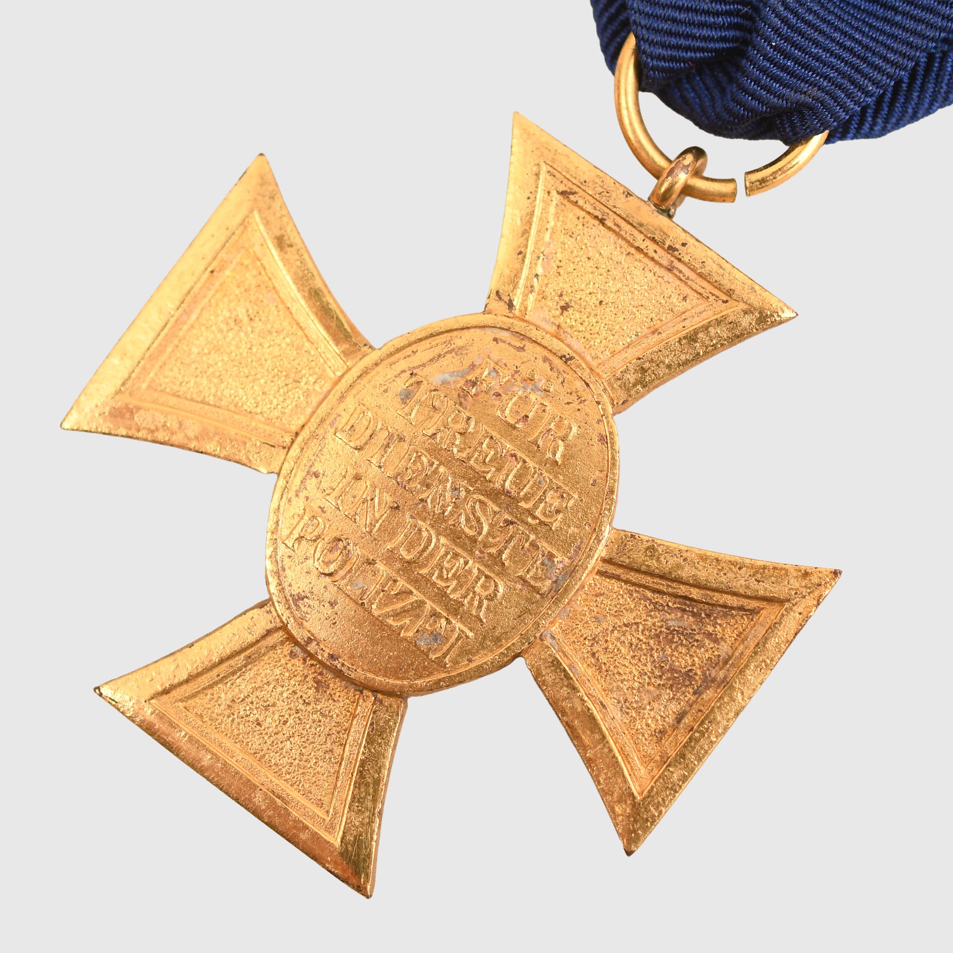 Excellent gilt to the cross, with its blue watered silk ribbon having an attached ribbon with the yellow embroidered police eagle.