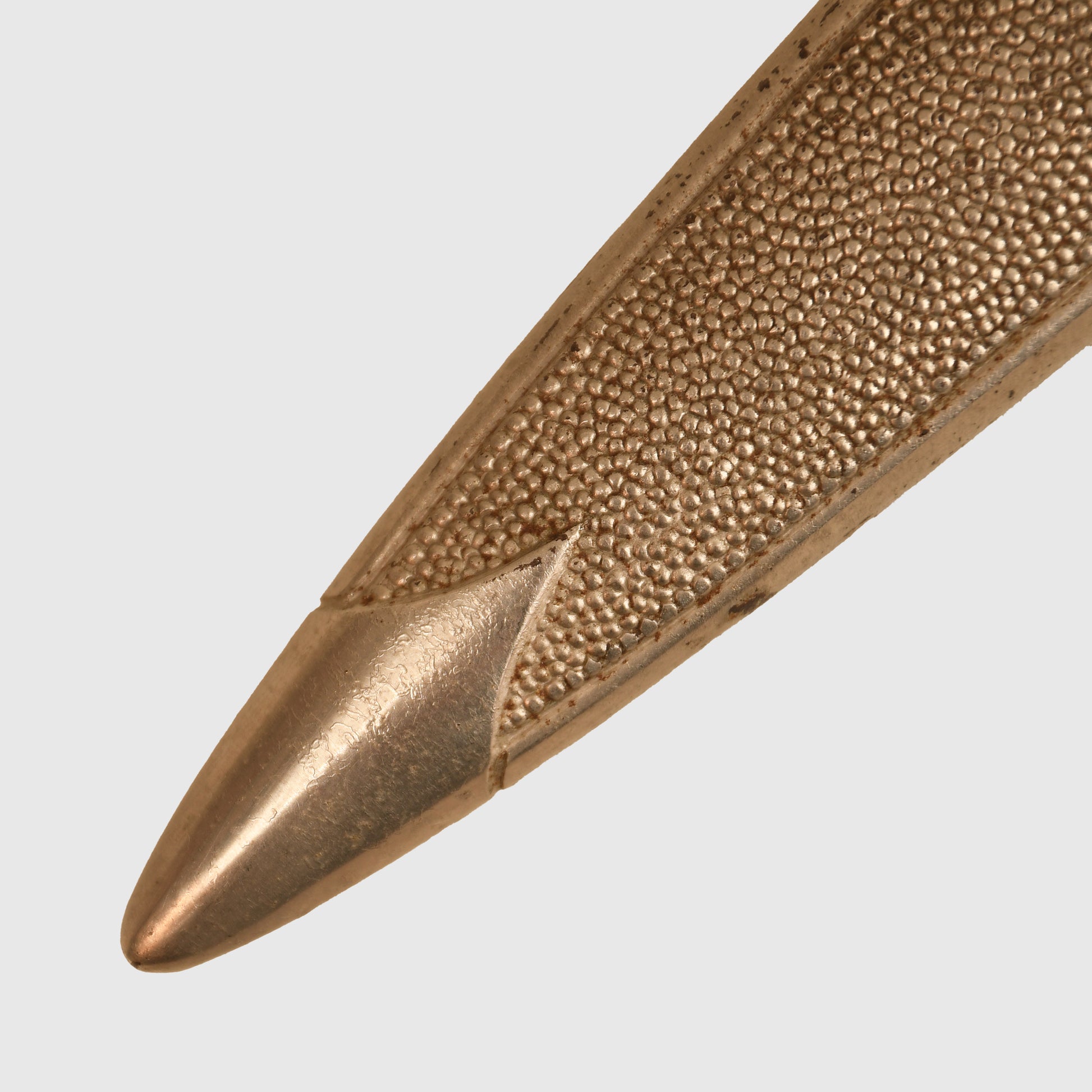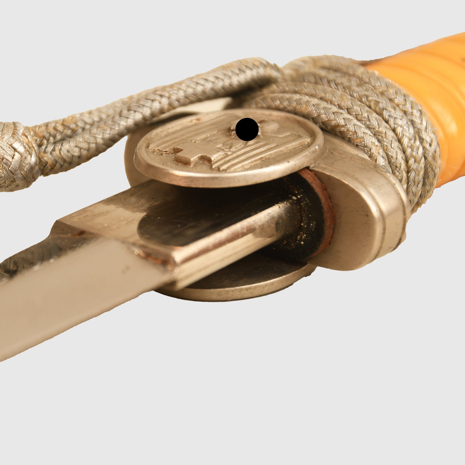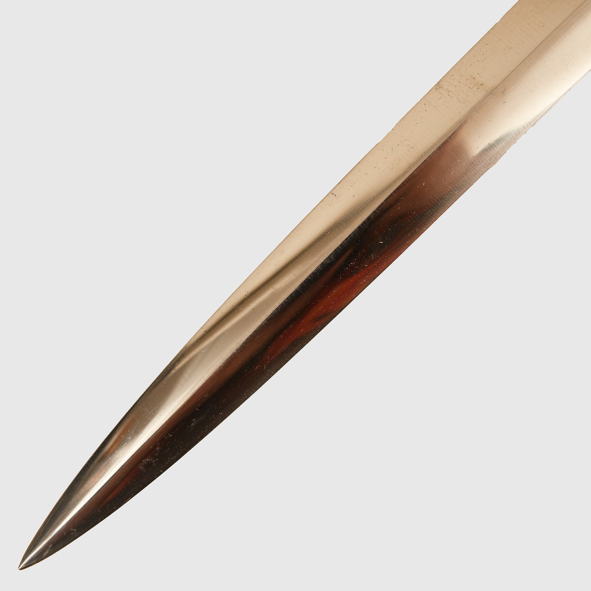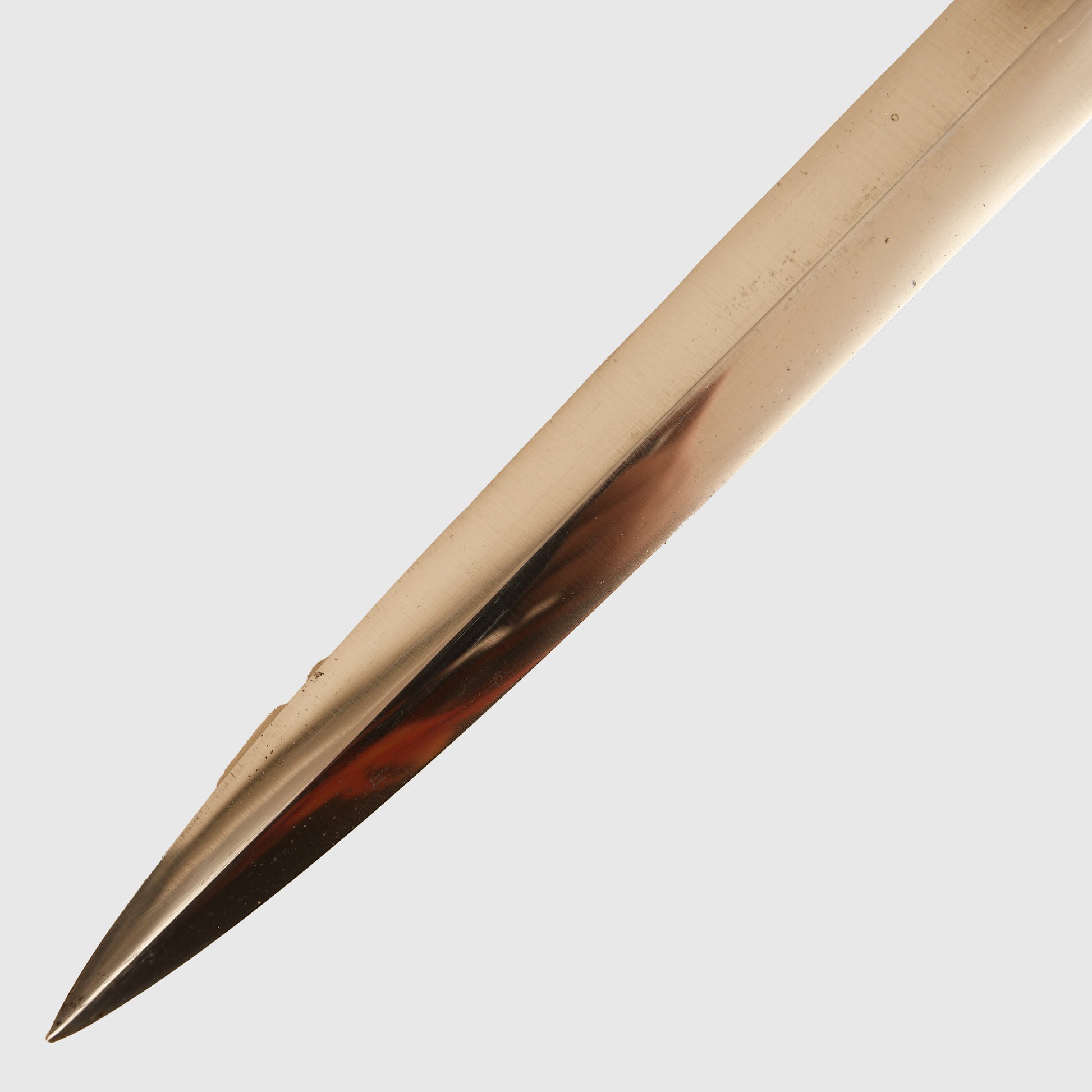 Complete with its original dress knot, the piece is housed in an undamaged scabbard. The scabbard shows light thinning to the plating on the side edges, two small discoloured spots on the lower front pebbled area, and some wear on the reverse side of the scabbard bands. Both upper screws at the throat are unturned.