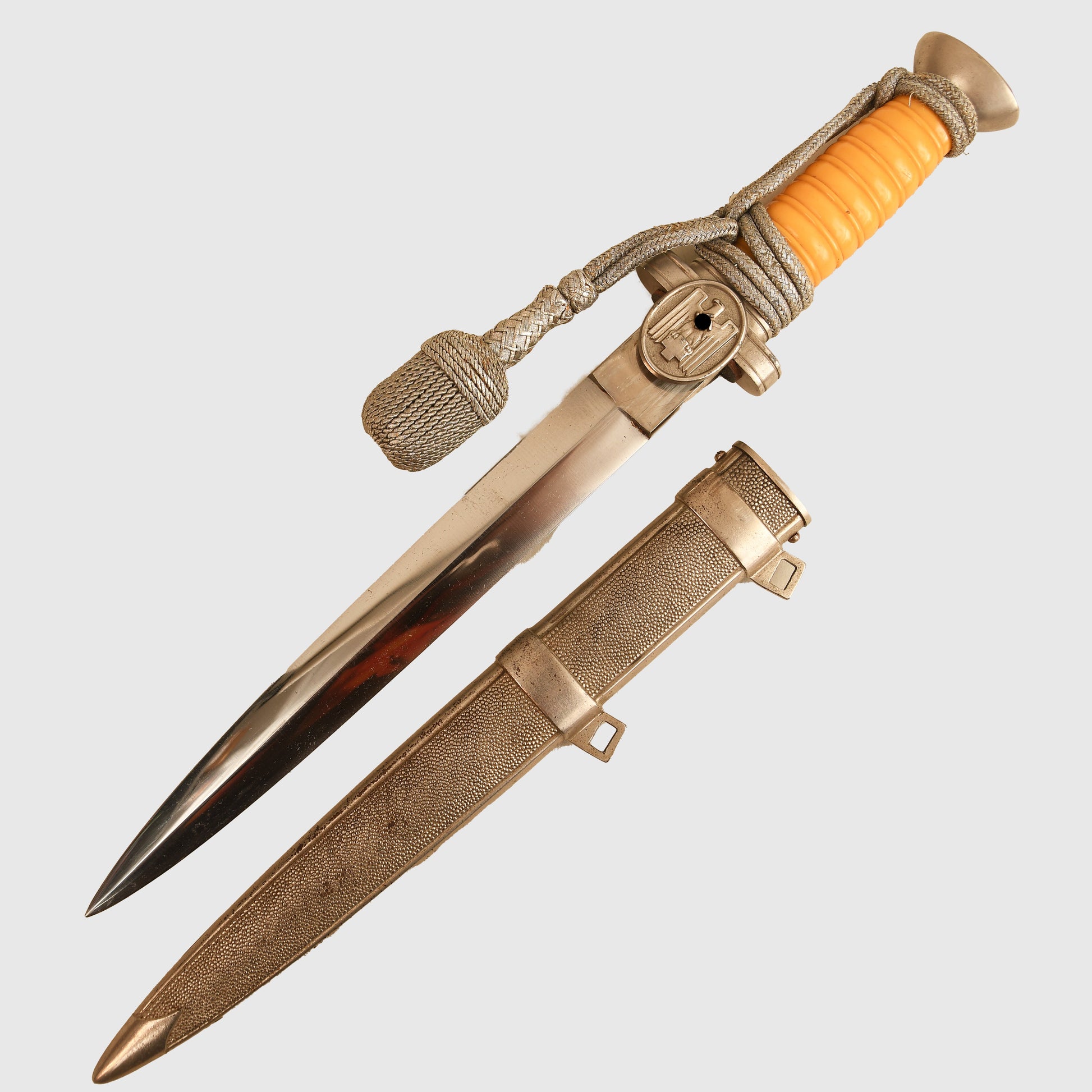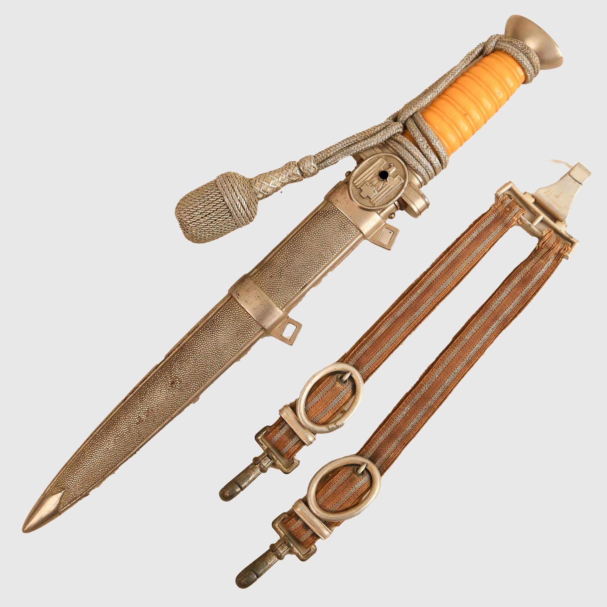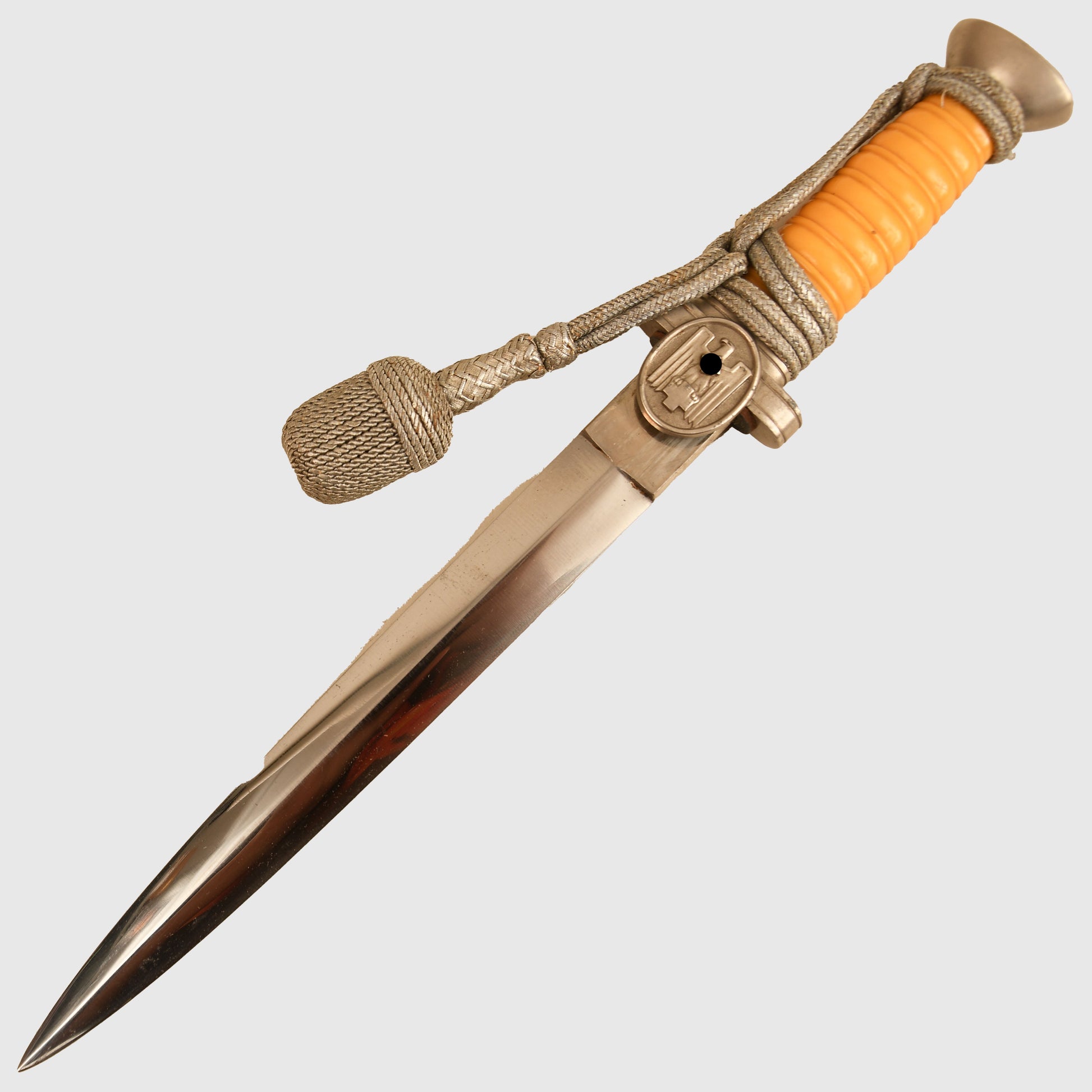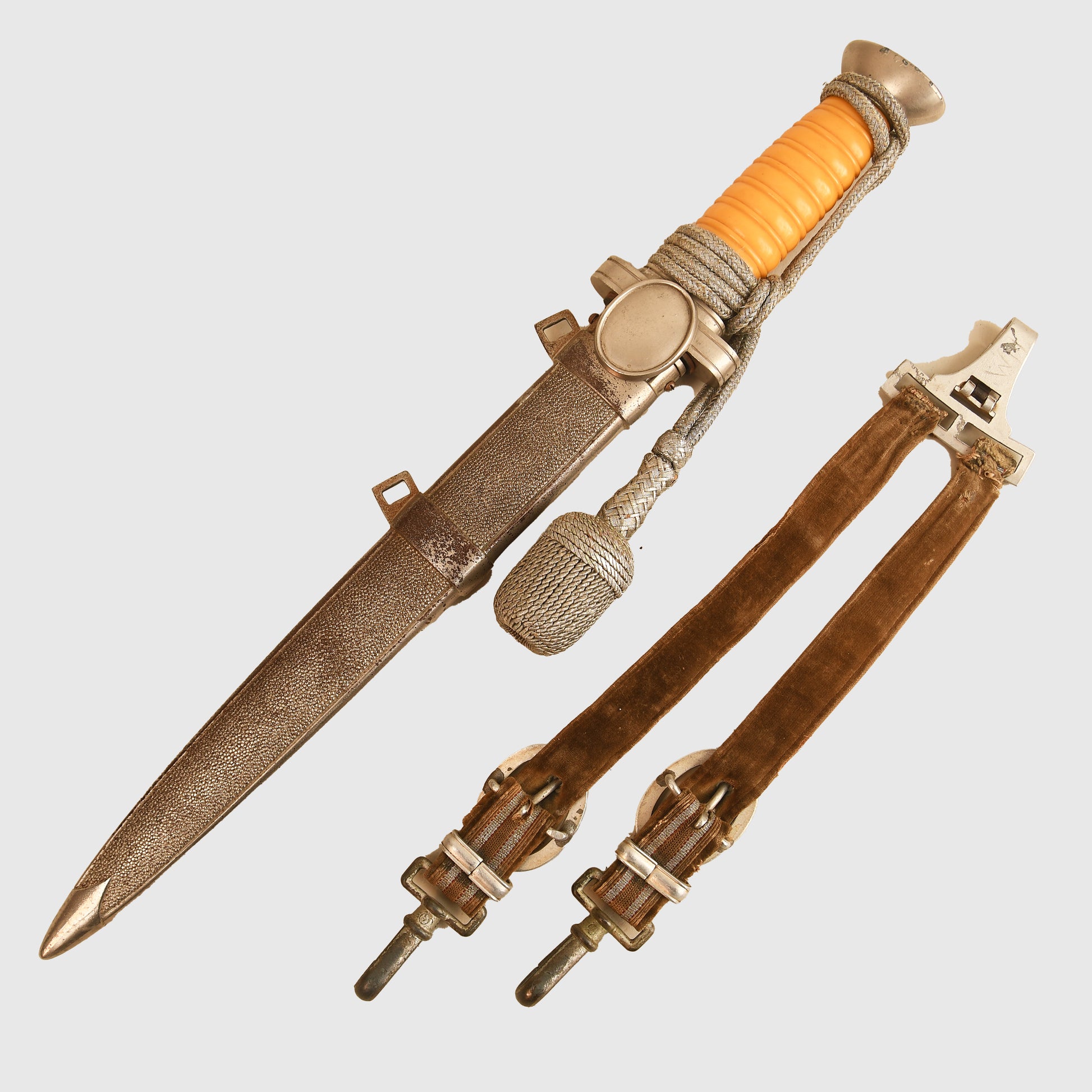 Complete with its original dress knot, the piece is housed in an undamaged scabbard. The scabbard shows light thinning to the plating on the side edges, two small discoloured spots on the lower front pebbled area, and some wear on the reverse side of the scabbard bands. Both upper screws at the throat are unturned.