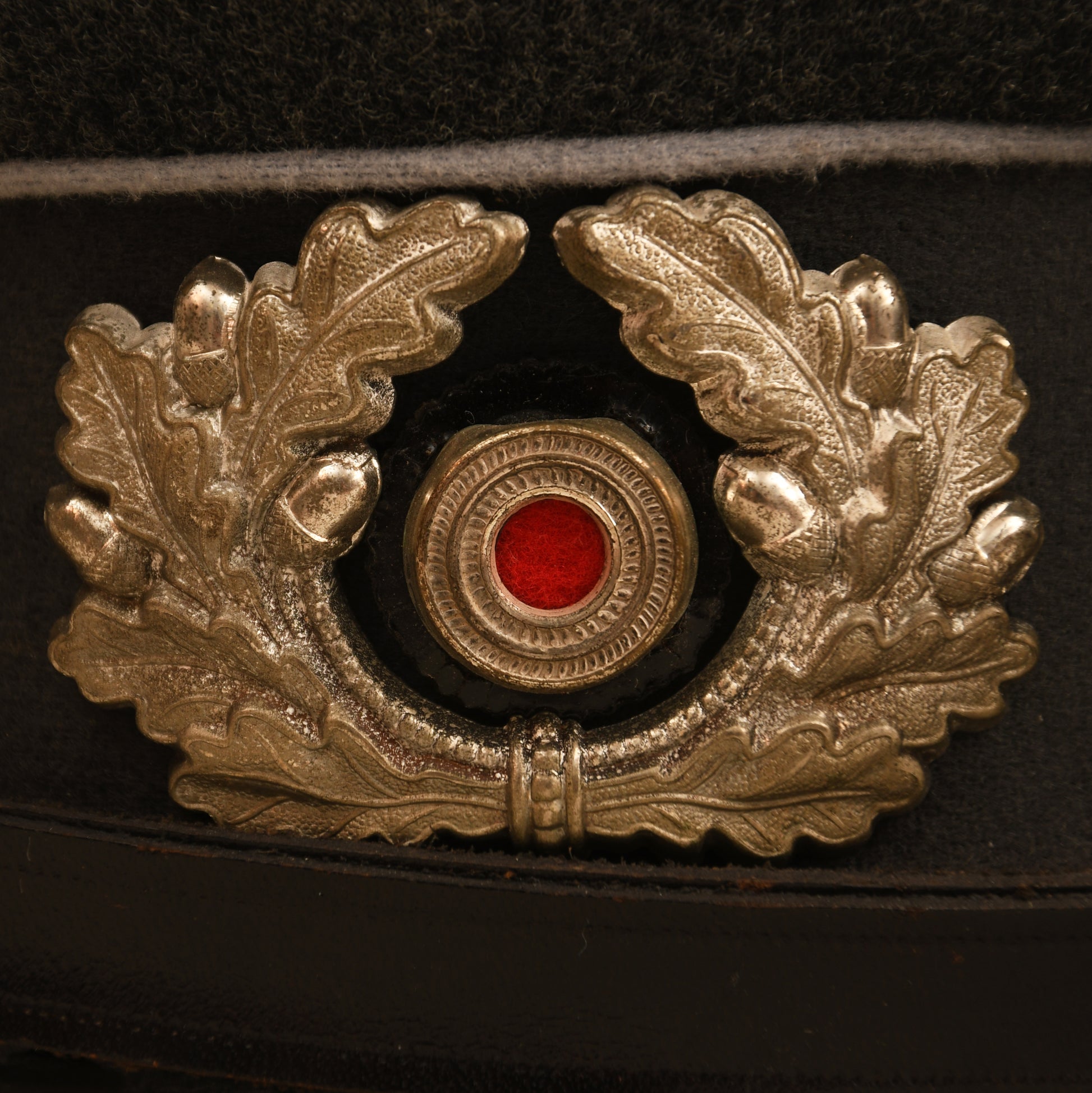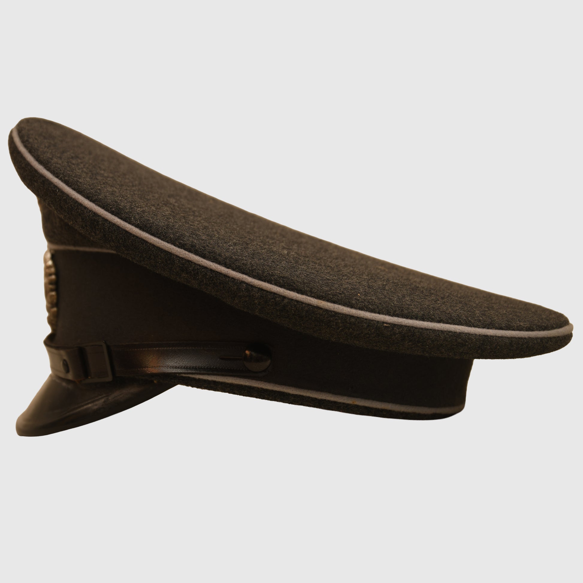 A very nice saddle-shaped visor cap for a Red Cross official, completely free of moth holes with just a small area of light tracking to the nap on the crown. The cap features grey piping to the crown and both edges of the grey centre band. The enamel Red Cross badge remains untouched, and the national wreath retains its original frosted acorns. Fitted with the correct leather chinstrap. The interior has an undamaged, unmarked centre celluloid lozenge, with size ‘56’ stamped to the upper inner russet-brown waterproof lining. The original sweatband shows only minor use at the forehead, with one of the owner’s initials pinned to the band. Housed in its original travelling box with the maker Fritz App print-blocked to the lid. A superb and complete example.