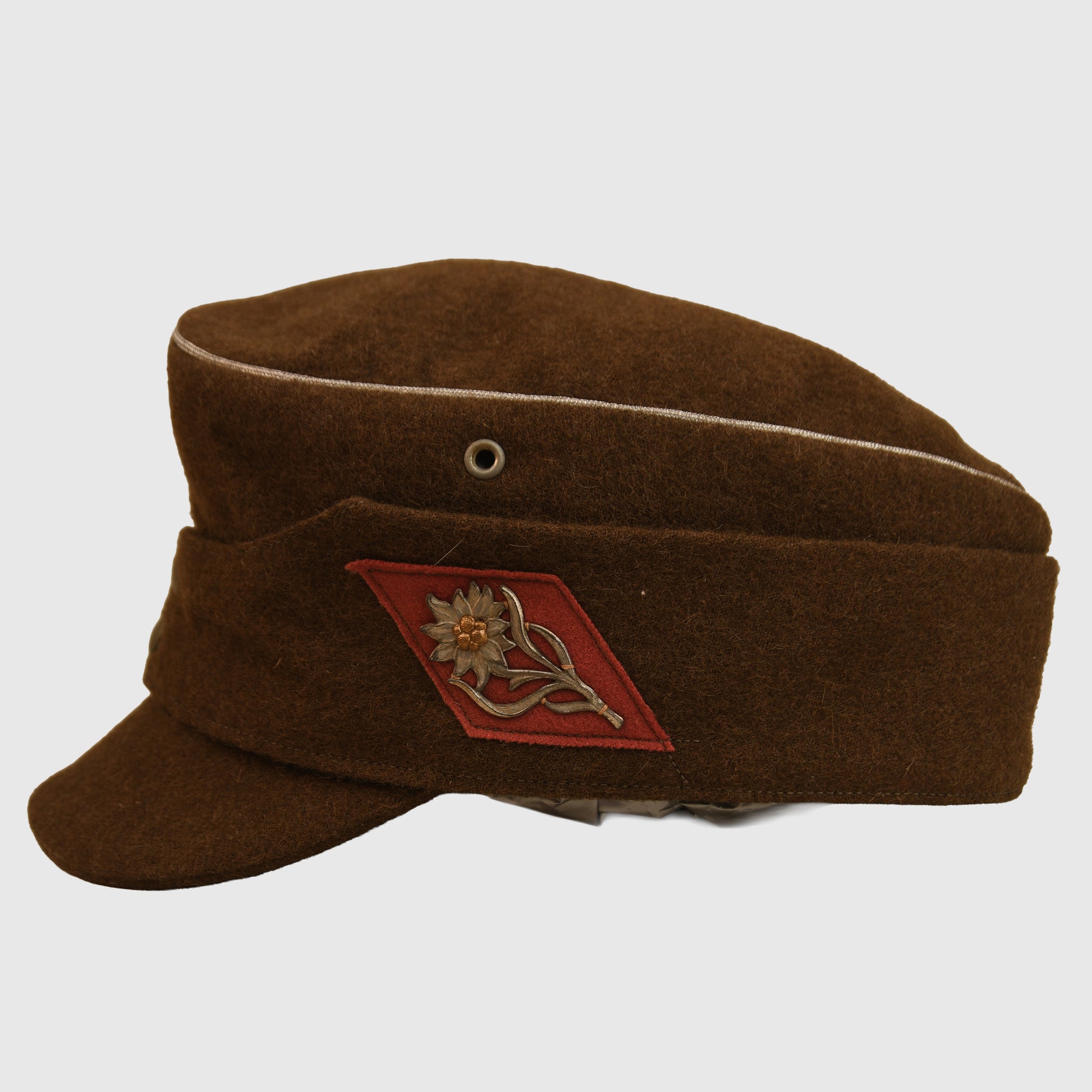 To the left side is an edelweiss flower on a pink lozenge backing, paired with a matching-backed Bevo-woven political style silver eagle. Two-button front with silver officer-grade crown piping. Brown leather sweatband fitted with its original RZM issue label stitched into the crown.