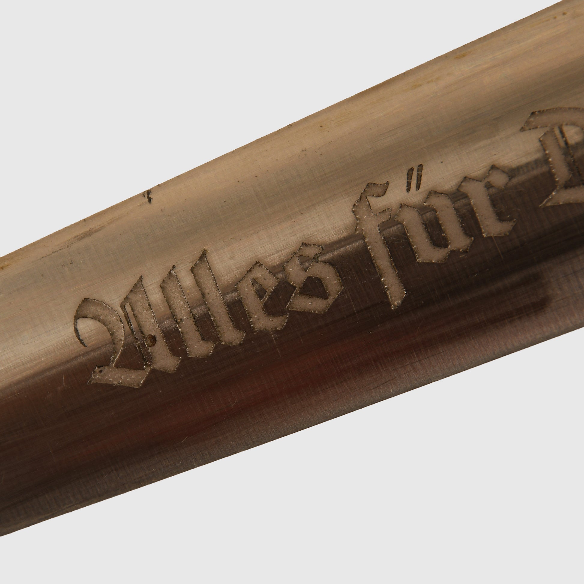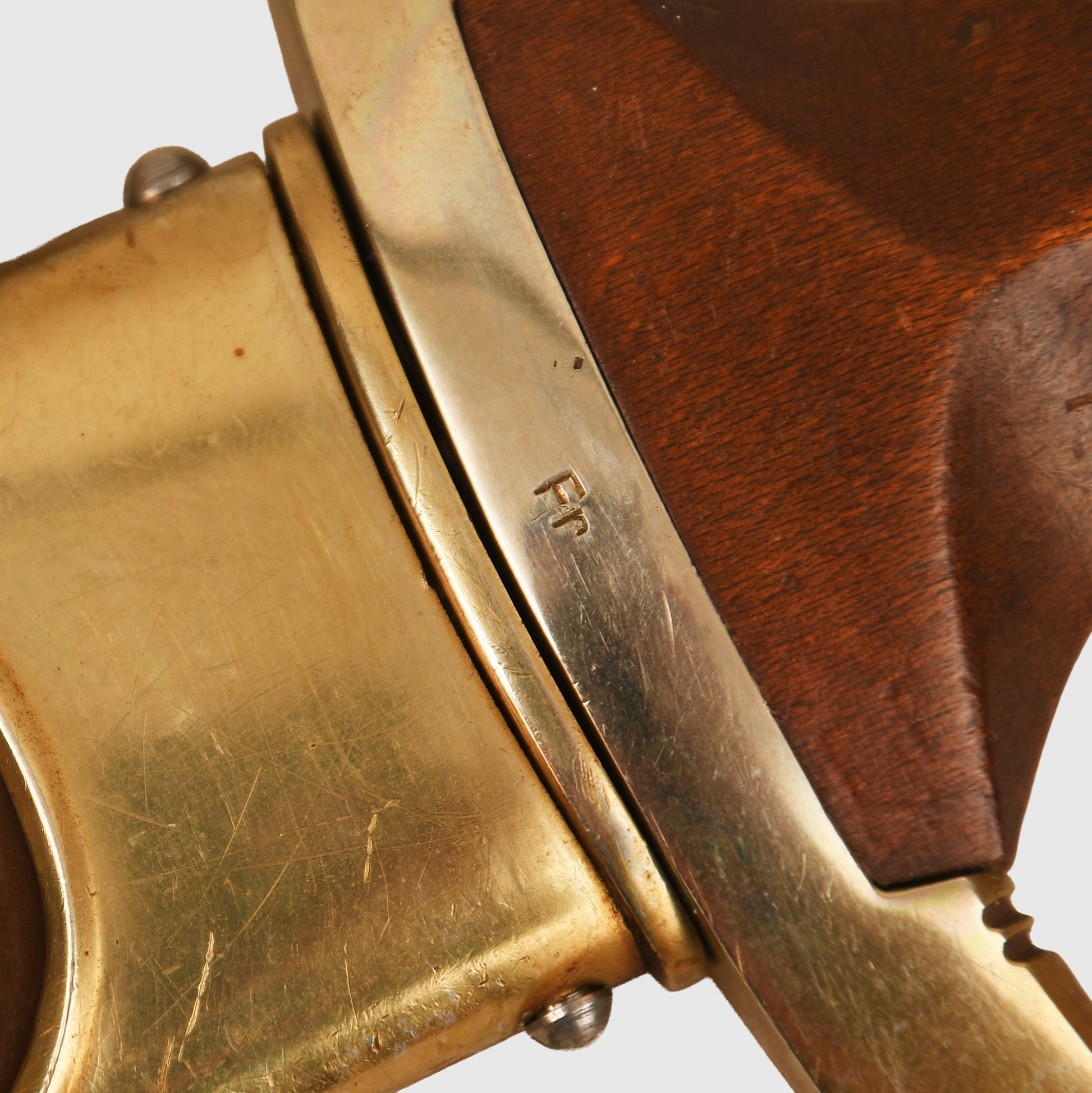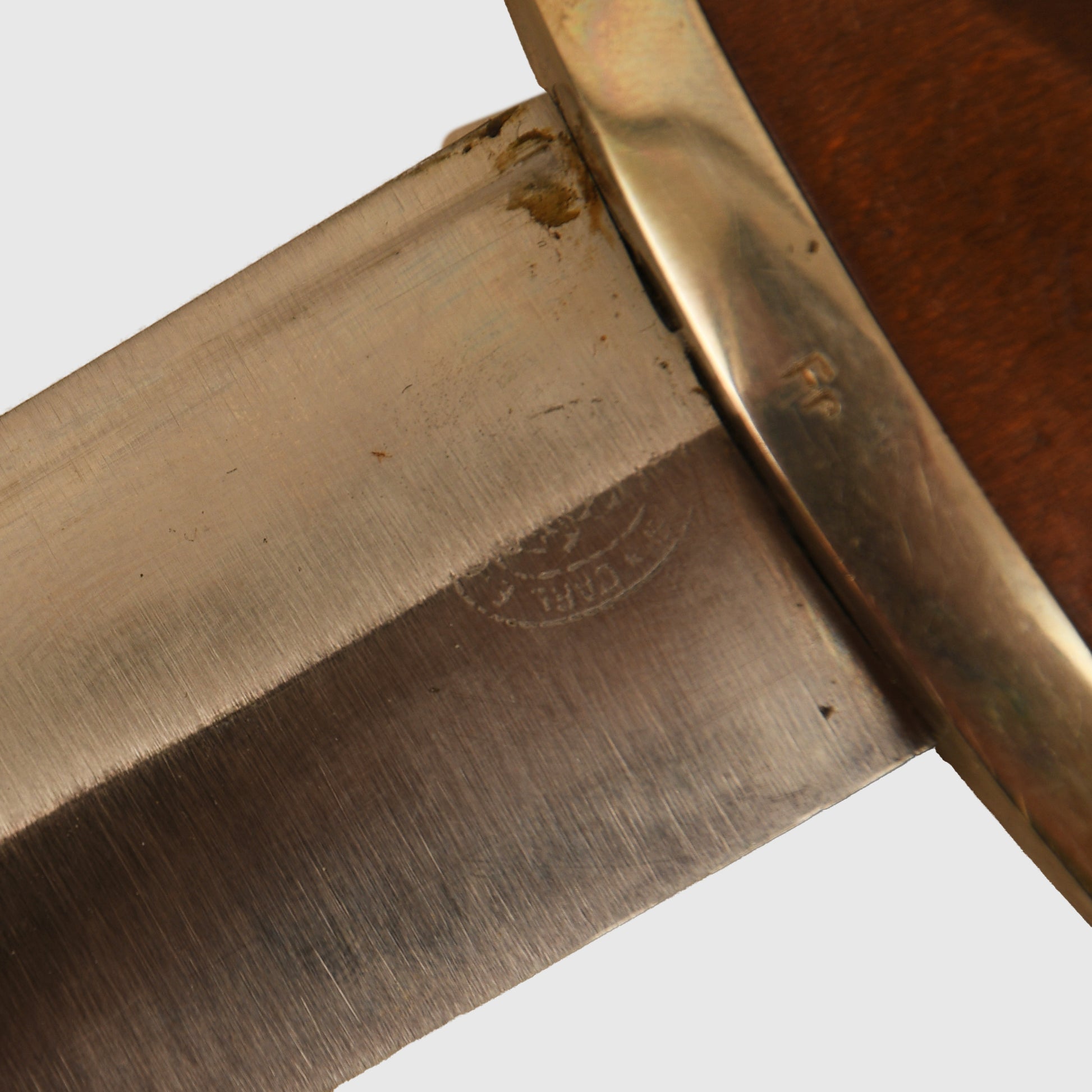 The lower rear cross guard is group-marked ‘FR’. The upper and lower mounts show heavy nicotine staining, with the lower scabbard exhibiting two minor indentations. The anodised finish to the scabbard has been sympathetically restored, though age lines remain visible. The lower ball has a single indentation, and all original screws are fitted.