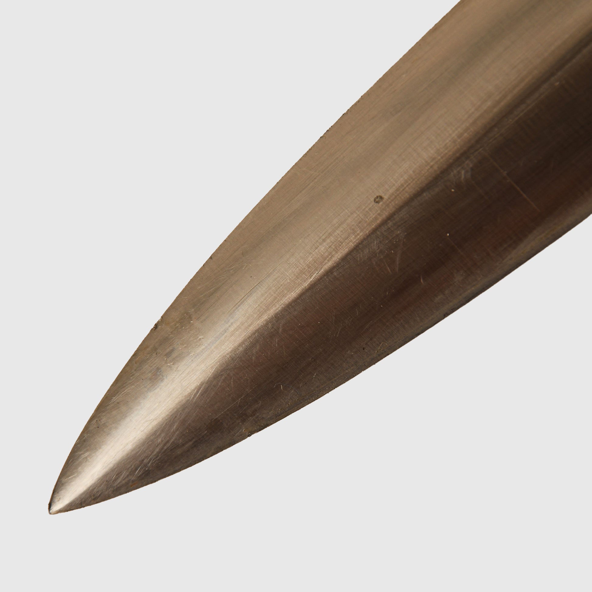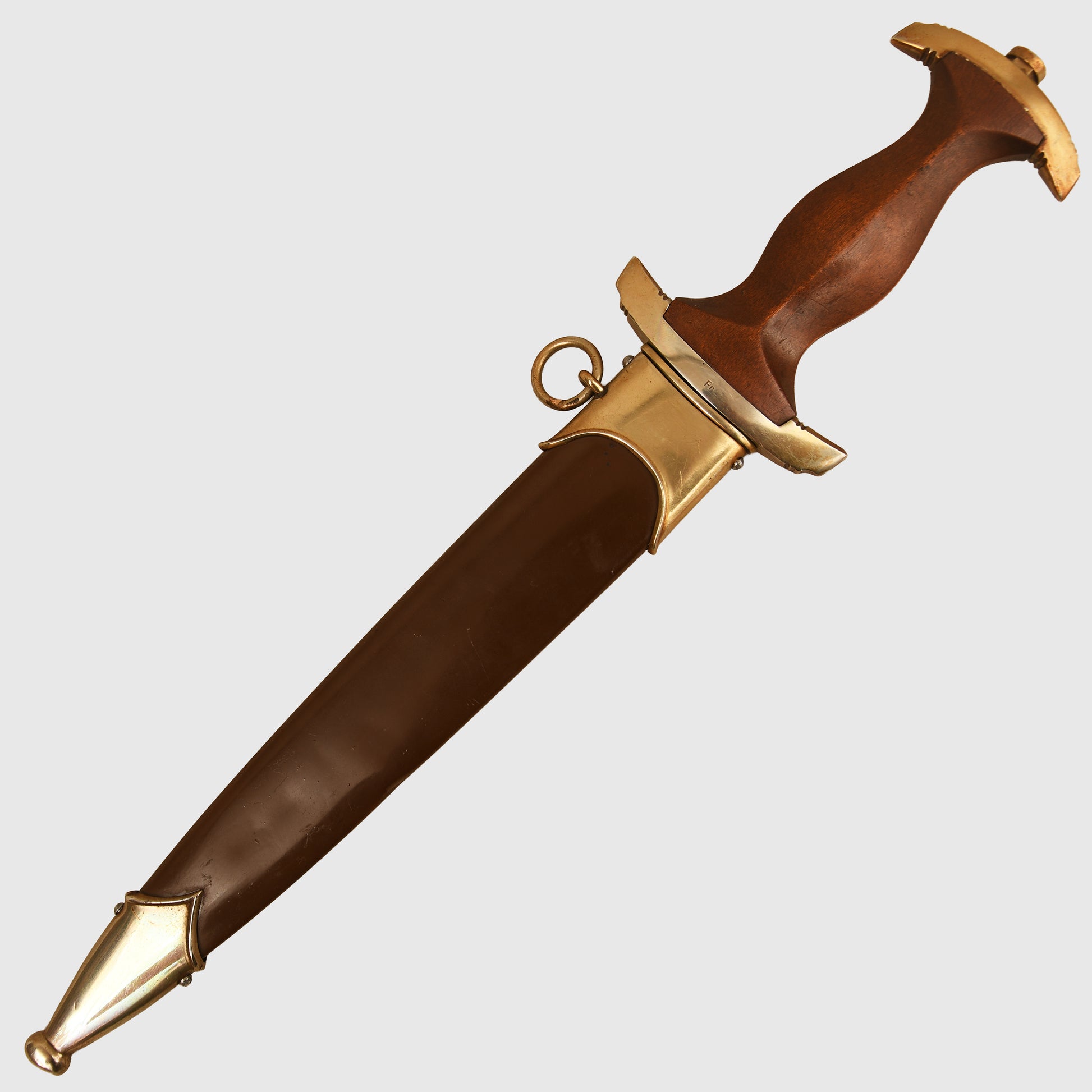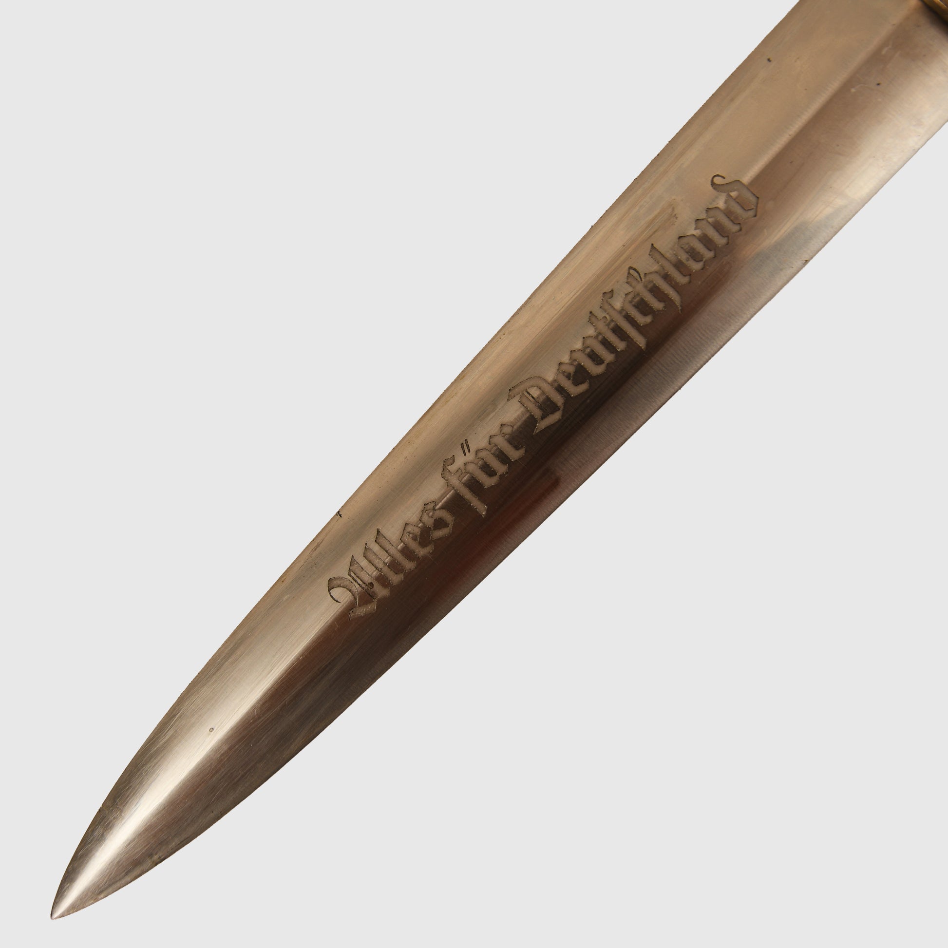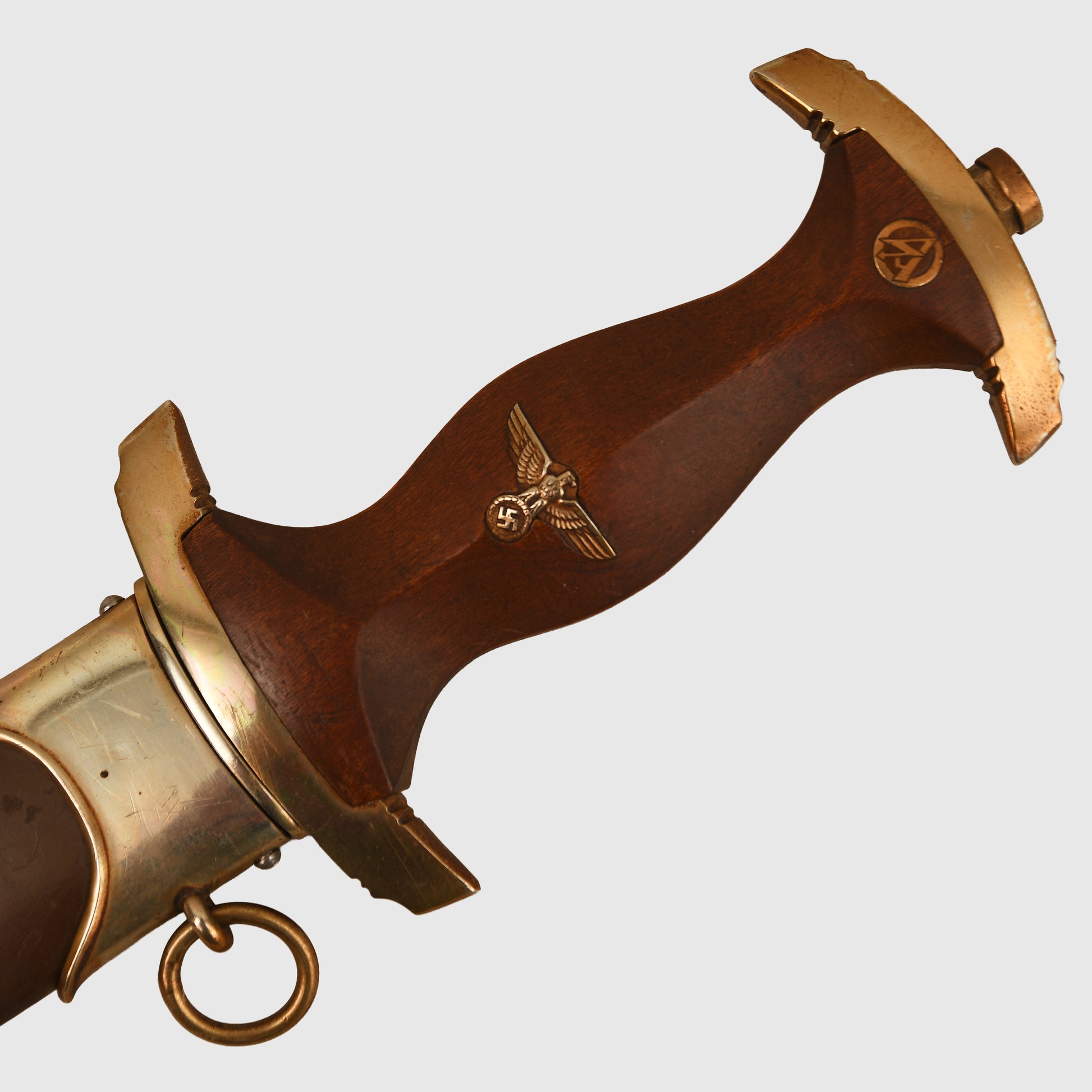 The lower rear cross guard is group-marked ‘FR’. The upper and lower mounts show heavy nicotine staining, with the lower scabbard exhibiting two minor indentations. The anodised finish to the scabbard has been sympathetically restored, though age lines remain visible. The lower ball has a single indentation, and all original screws are fitted.