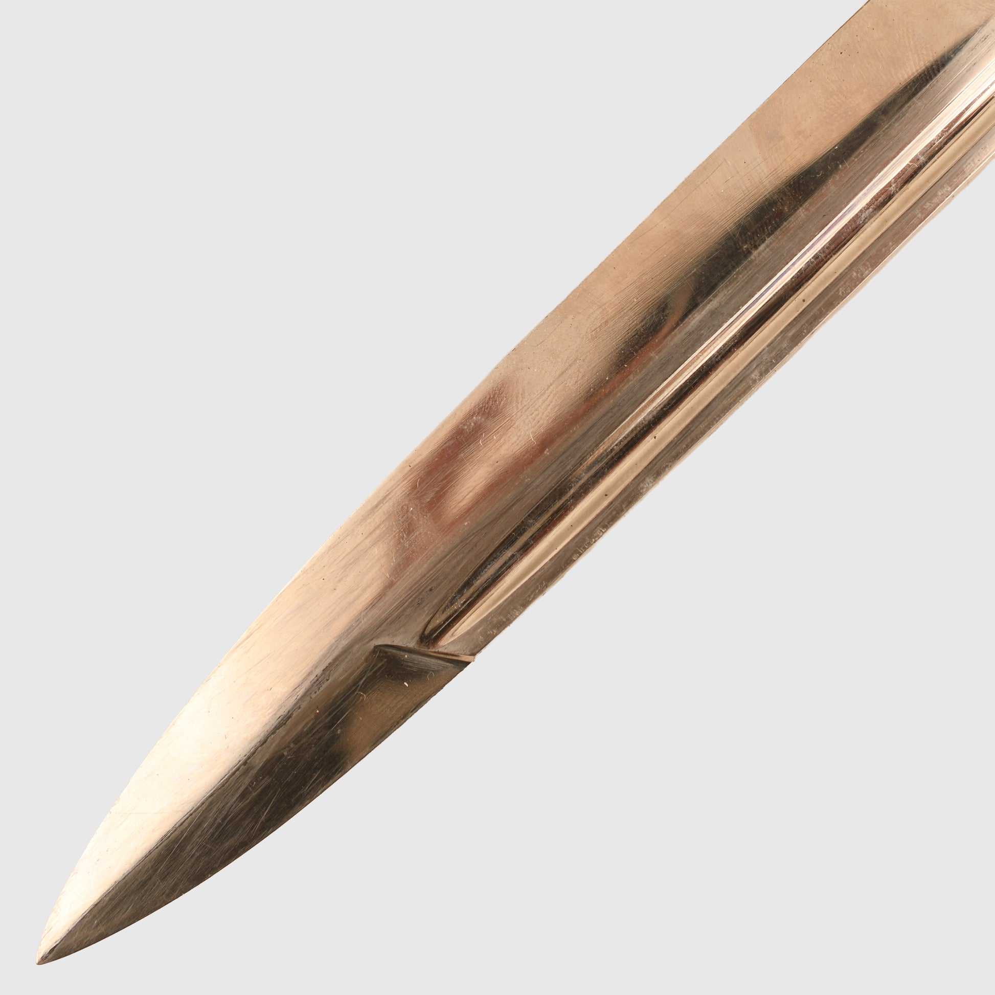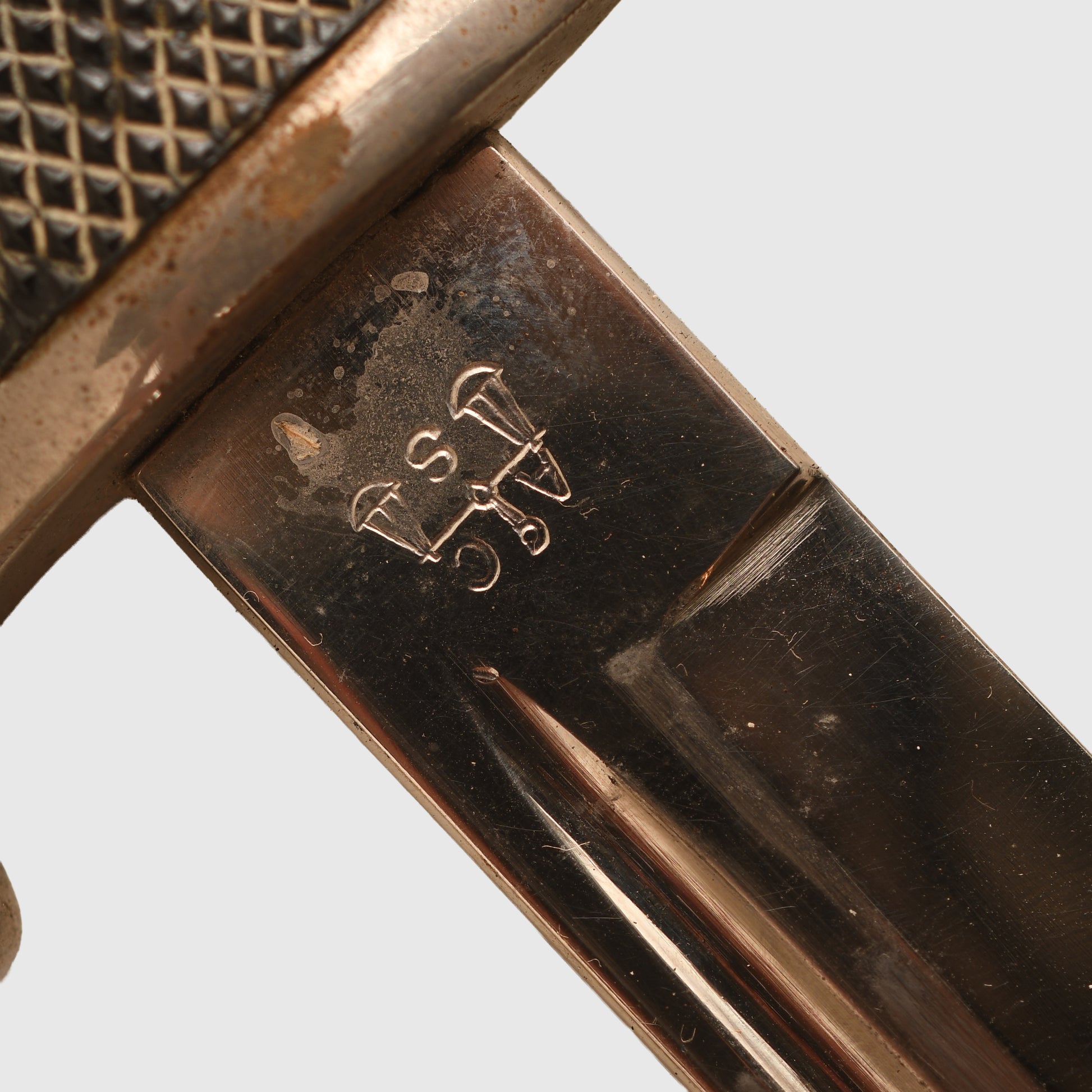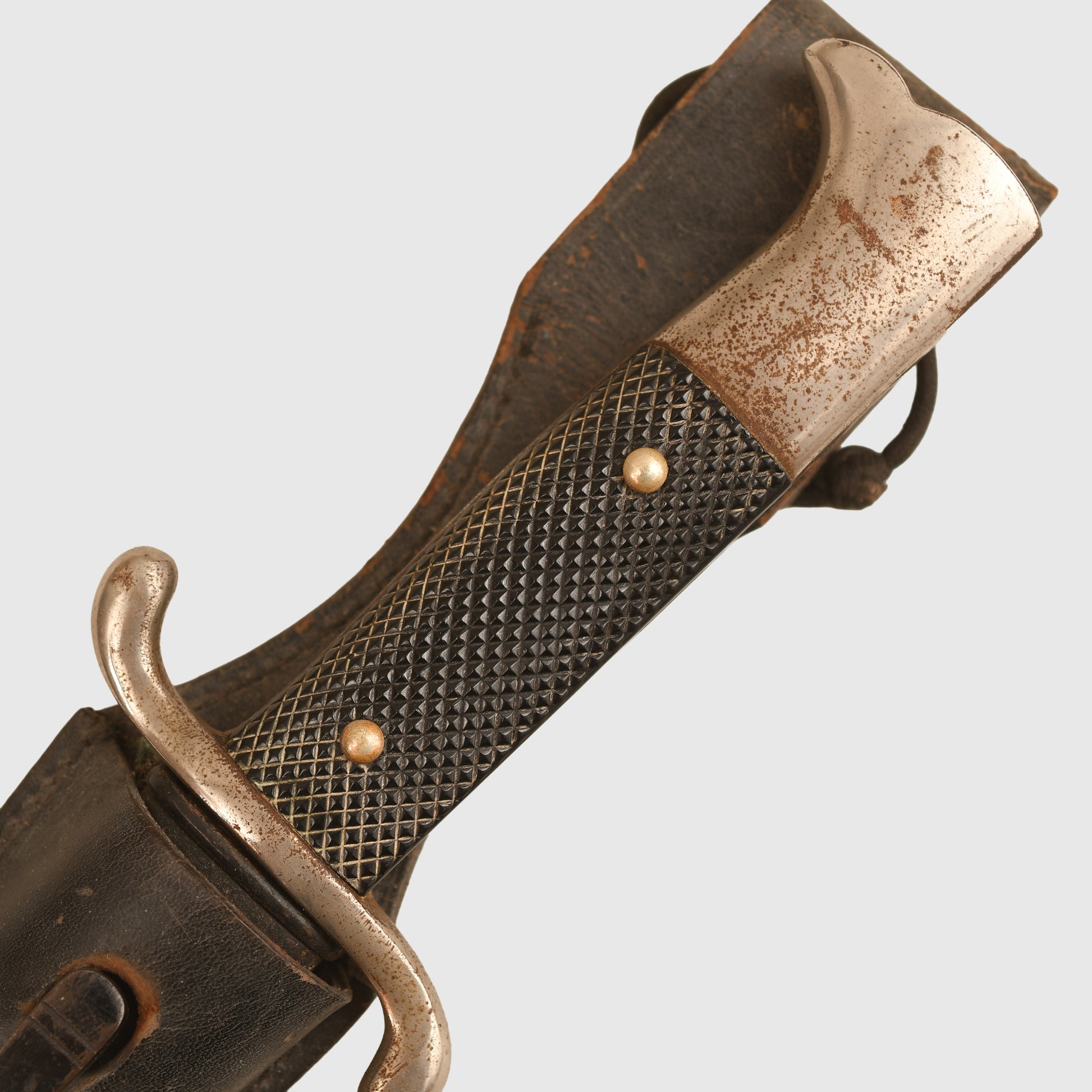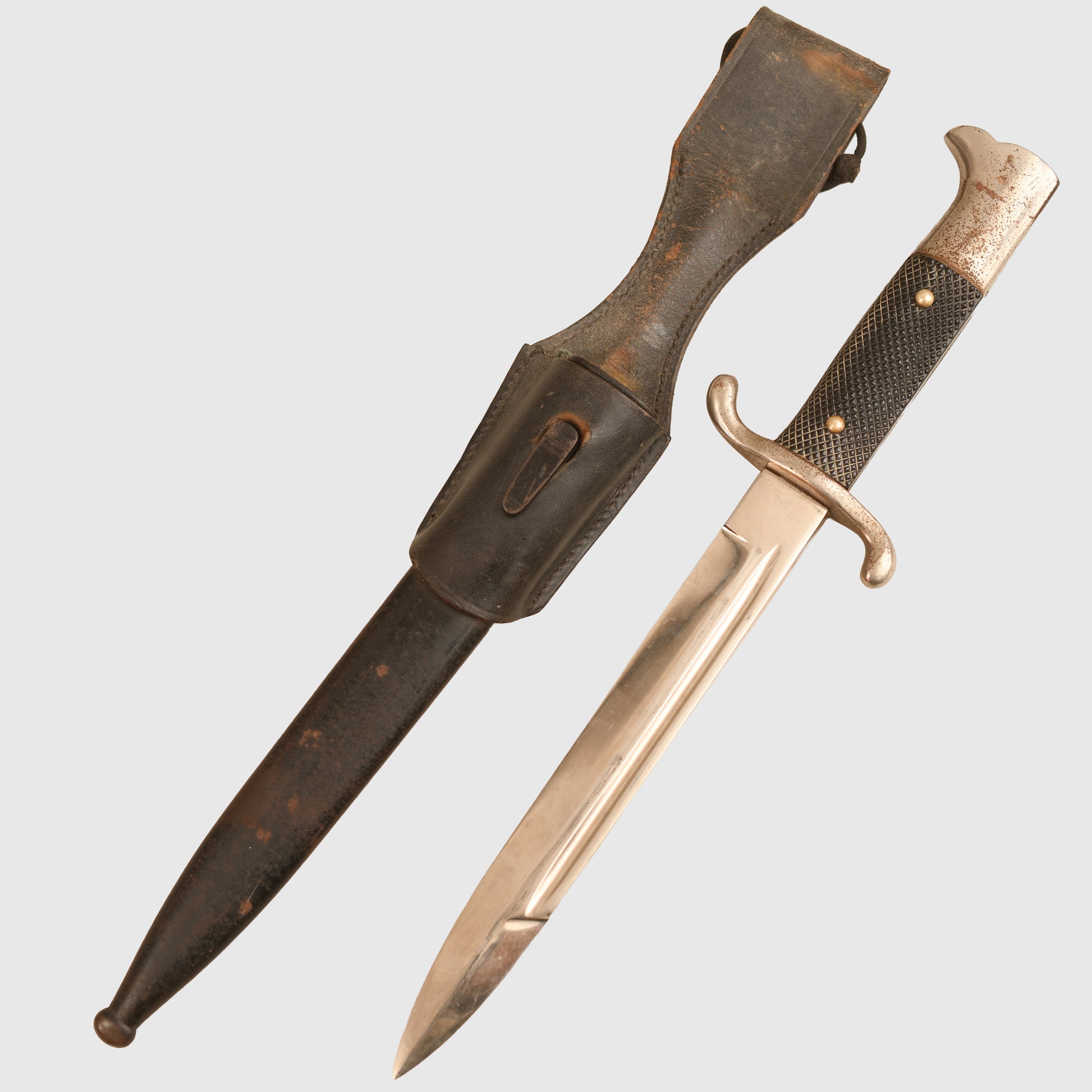 Excellent mint bright blade by Alcoso, the style of the blade is known as the carbine type blade with its S Guard Fire Service cross guard, eagle-headed pommel. Undamaged celluloid grips. Some light toning to the finish of the cross guard and pommel. In its original scabbard, retaining all its original black painted finish with rust bleed coming through the paint from the steel below. Original leather frog.
