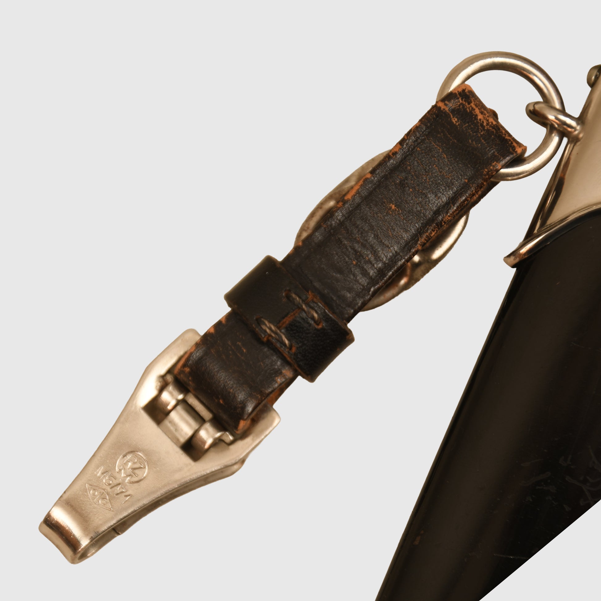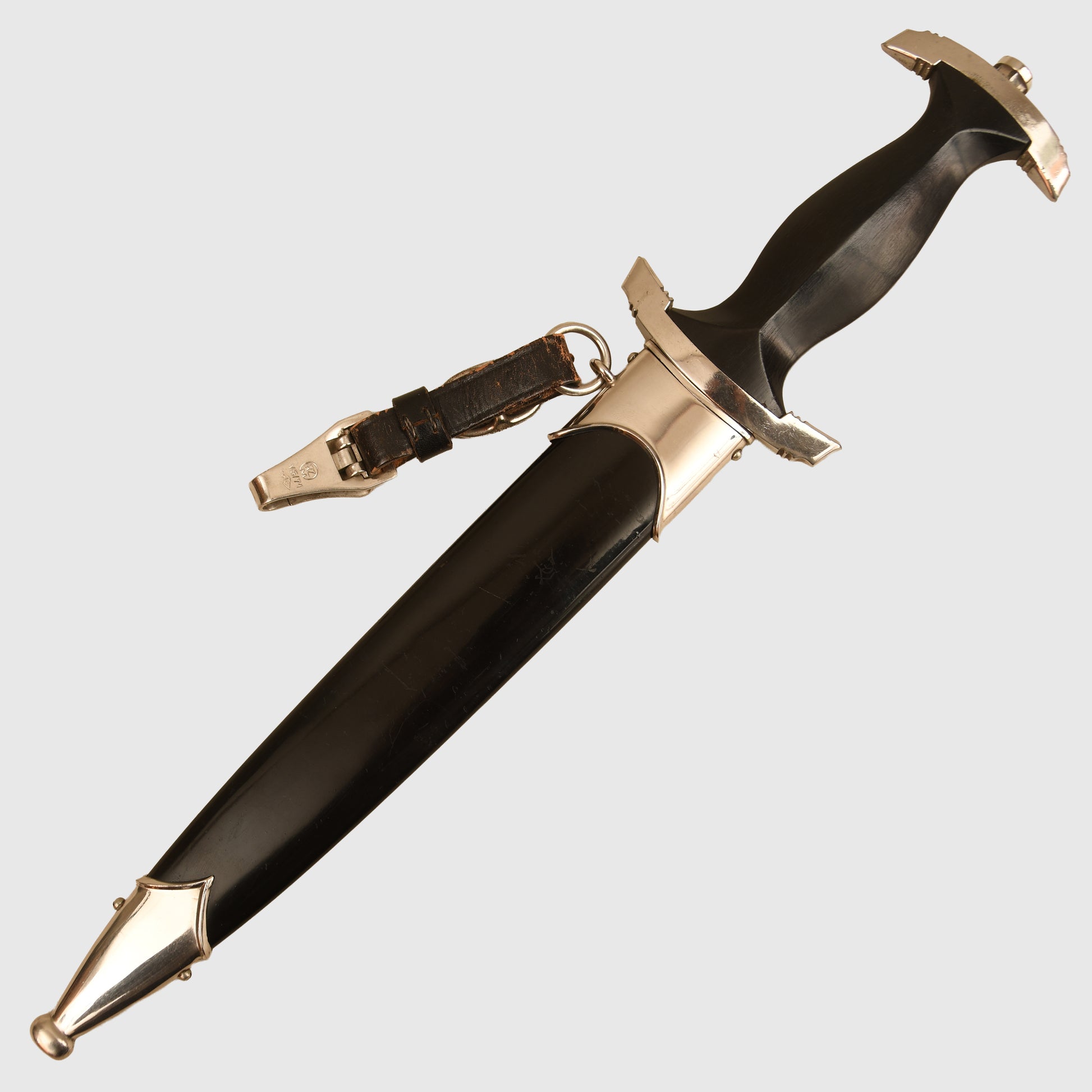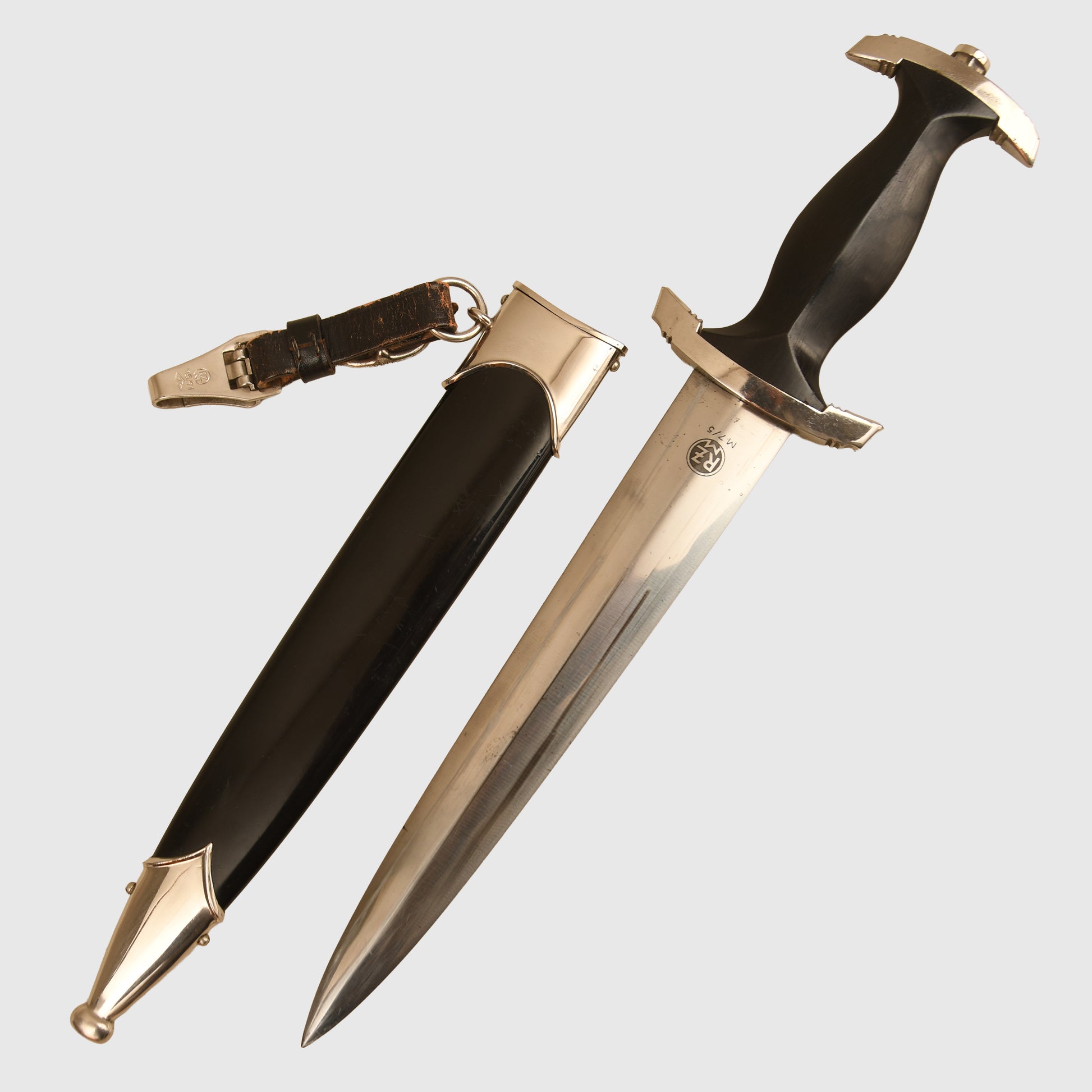 The black painted finish to the scabbard is fully intact, with natural age lines visible beneath the surface. There is one very minor indentation to the ball of the lower scabbard mount. Complete with its original black leather hanging strap, with the clip marked RZM 5/71 OLC. Without question, one of the finest SS enlisted man’s display pieces we have had in stock for a considerable time.