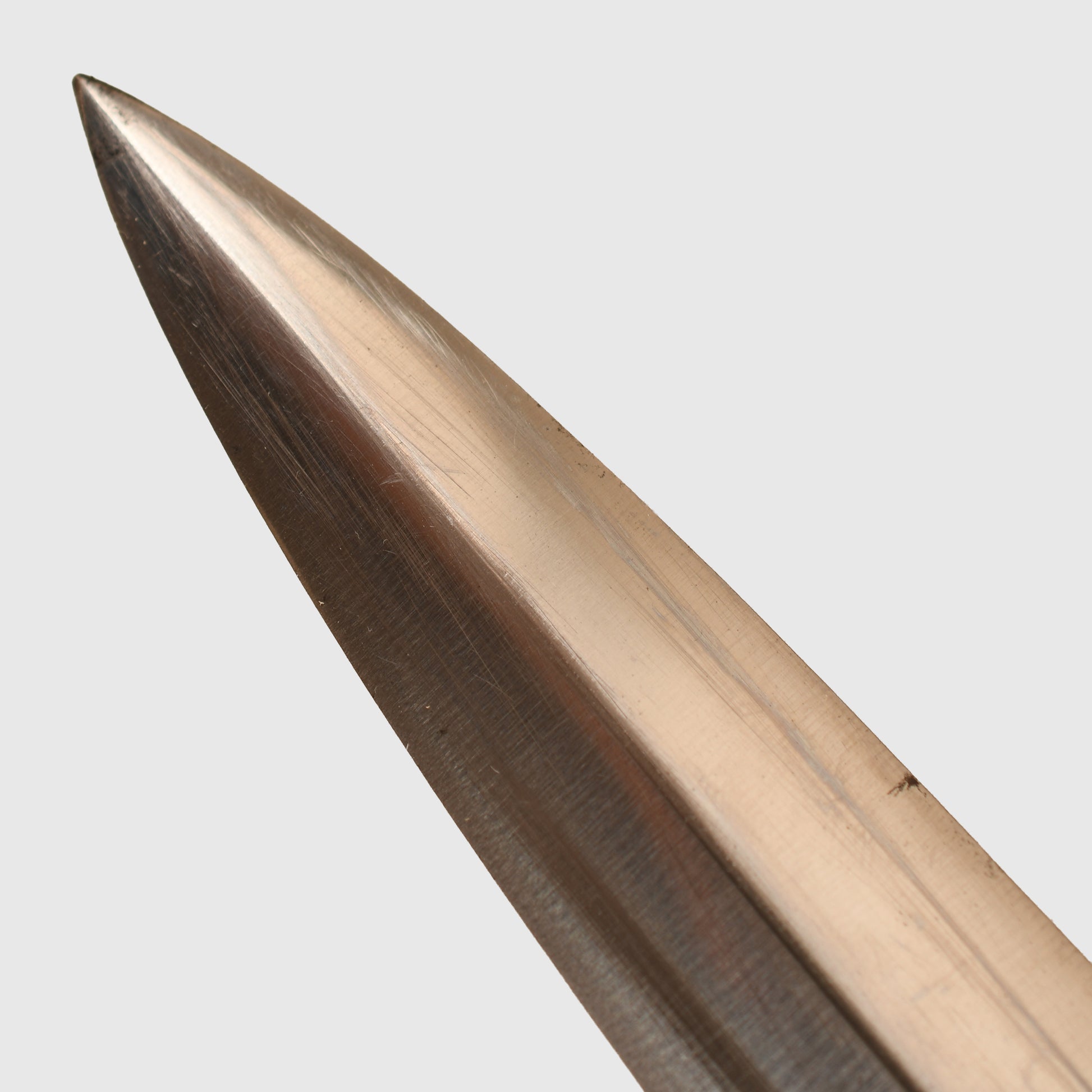 All plated fittings, including the upper and lower cross guard mounts and both scabbard mounts, remain mint bright. The ebony wood grip is completely undamaged, with sharp, well-defined edges throughout. The SS enamel inset is excellent and undamaged, complemented by a high-quality aluminium national eagle. The four screws securing the upper and lower scabbard mounts show unturned heads.