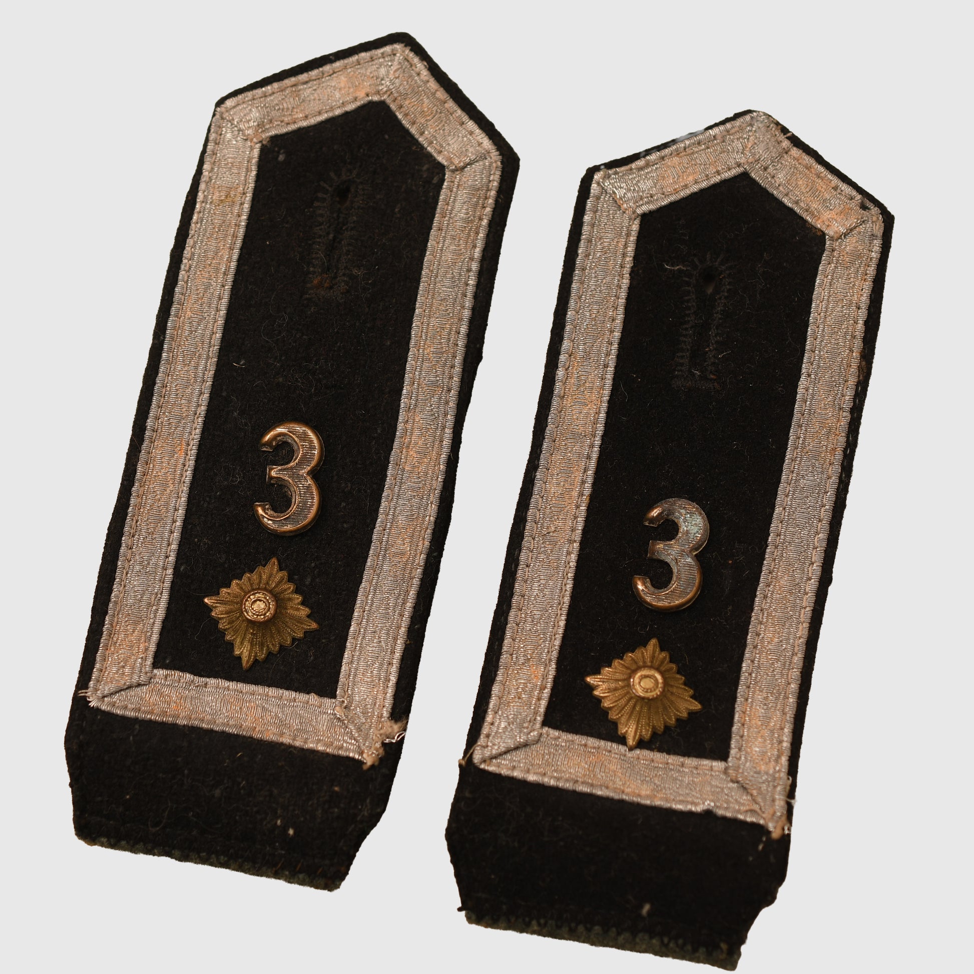 A very rare and desirable matched pair of SS Totenkopf Standarte No.3 Oberscharführer’s shoulder boards, dated July 1937. Constructed in the wide slip-on style with pointed tops, each trimmed with slightly oxidised silver tress and bearing a metal number "3" to the centre. Both slip-on tabs remain intact, with the interiors lined in grey herringbone twill. These boards are directly connected to the 3rd SS Totenkopf Standarte, formed in August 1939, which later became the 3rd SS Totenkopf Division.
