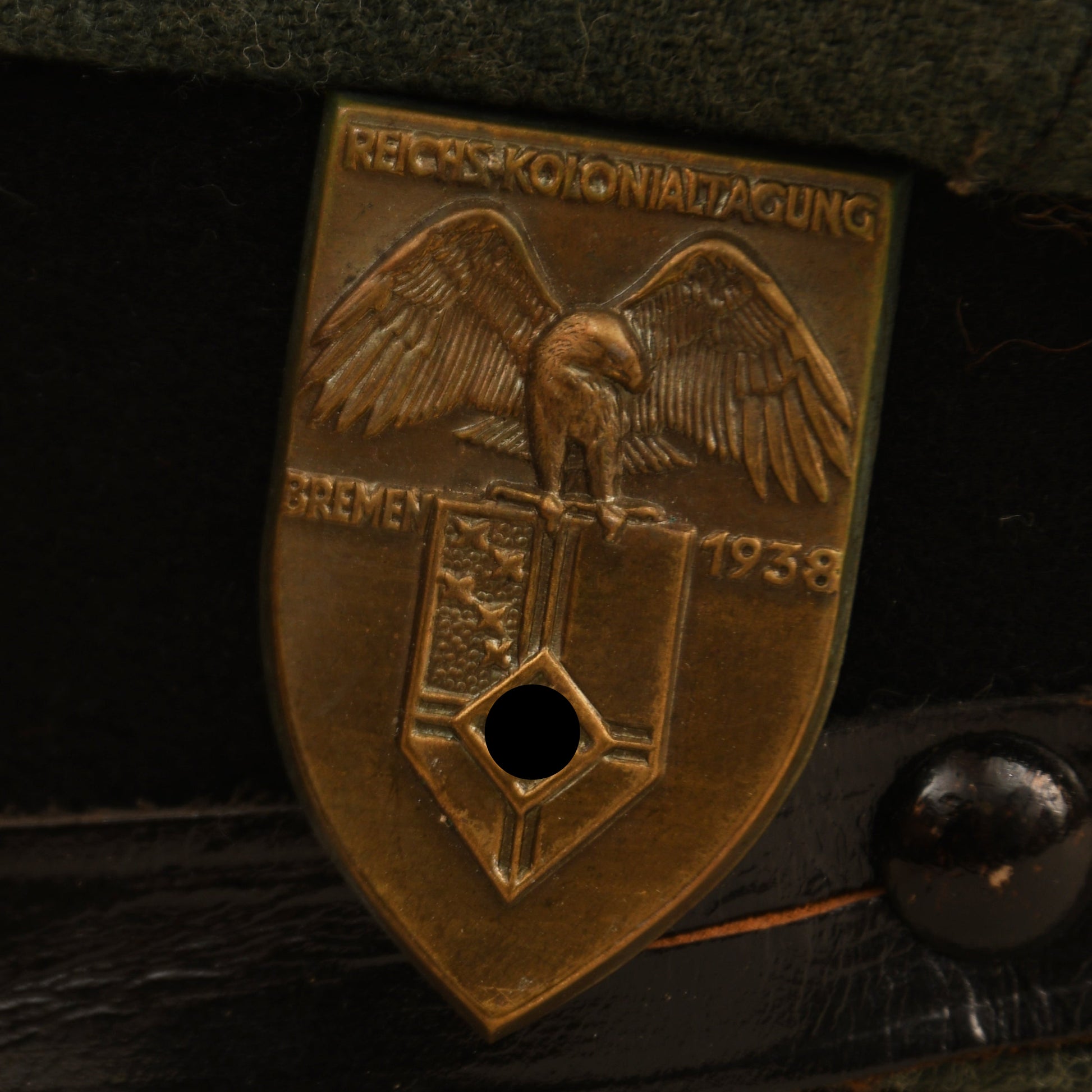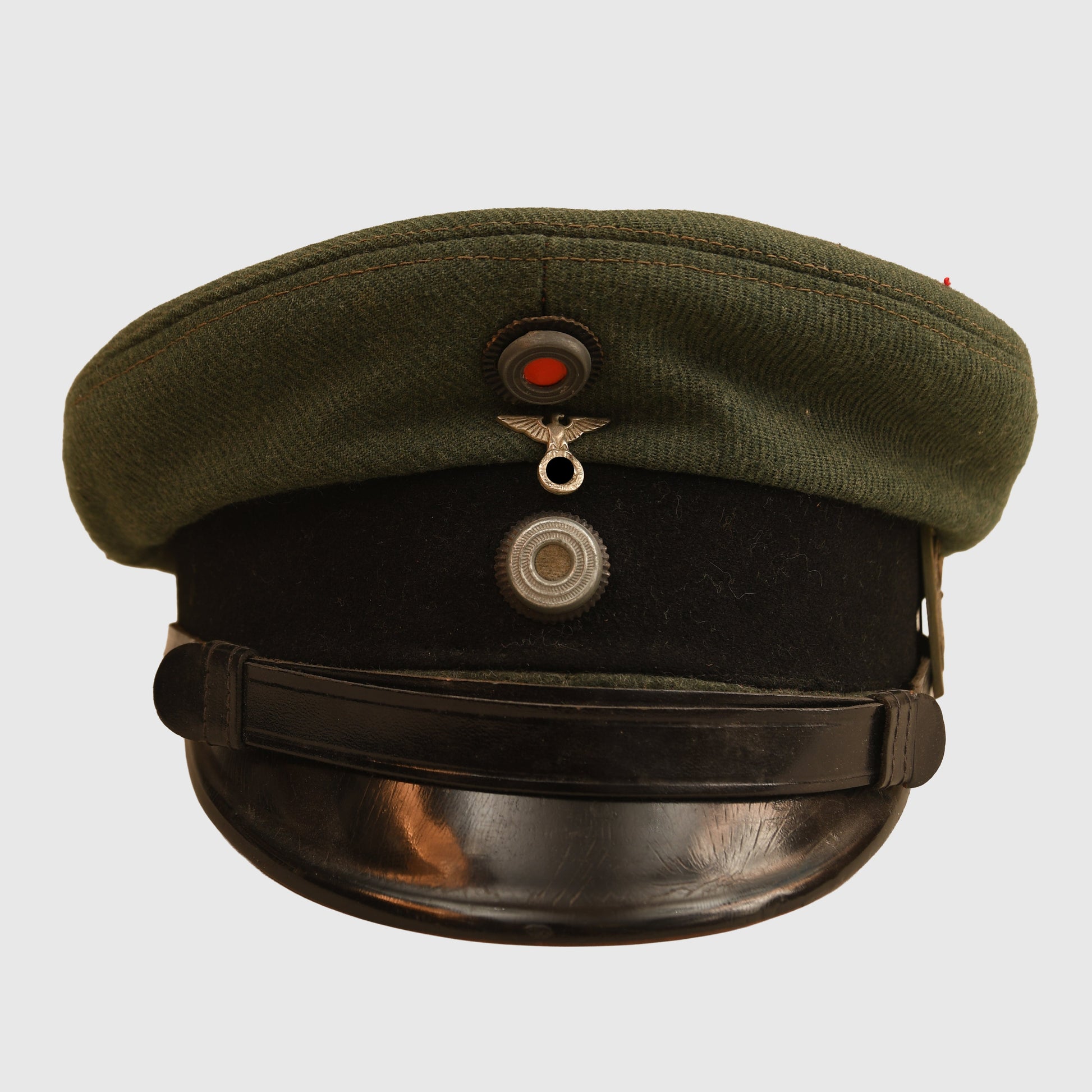 A very interesting and rare Stalhelmbund visor cap in the distinctive light field grey shade. The crown shows only two very minor moth nips. Features a black centre band with complete national and State cockades, flanked by a small M.29 eagle and swastika. The interior upper crown lining is a raffia pattern, with a full leather sweatband and black brushed cotton side lining stamped ‘ELITE size 56’ below the lozenge. Fitted with a Colonial Bund 1938 Bremen day badge to the side and a black leather chinstrap with matching black side buttons. A remarkable piece of Third Reich uniform history.
