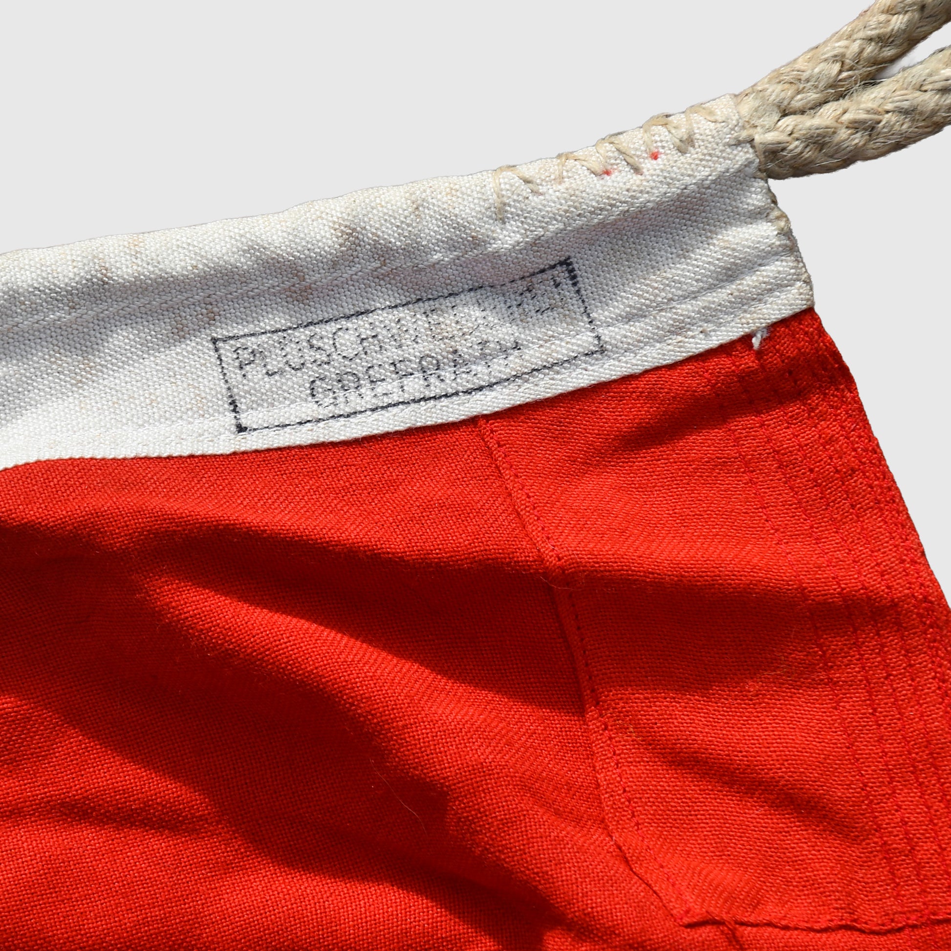 A very good medium-sized State Service Flag, ideal for display as a backdrop within a Third Reich collection. The flag retains its strong, deep red colour with an excellent black-and-white national eagle and central swastika. Complete with its original canvas selvage edge, suspension ropes, and a clear flagmaker’s stamp to the selvage marked Reichsflg 80 x 135. A fine, well-preserved example.