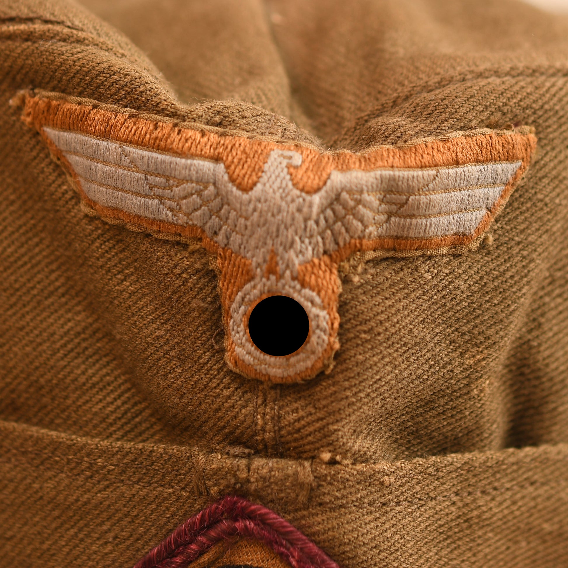 The front features the correct early-war configuration of insignia—a finely Bevo-woven blue-on-tan eagle positioned above the tropical cockade, with the distinctive inverted V waffenfarbe denoting the Chemical Warfare branch. An excellent and scarce example of a specialist tropical cap rarely encountered in this condition.