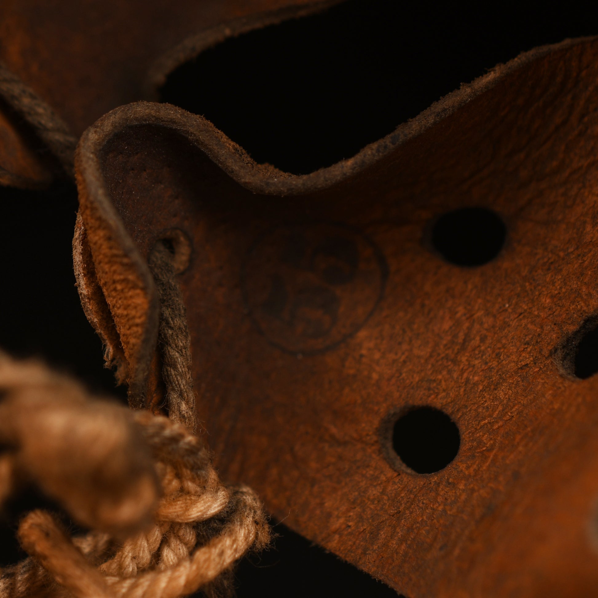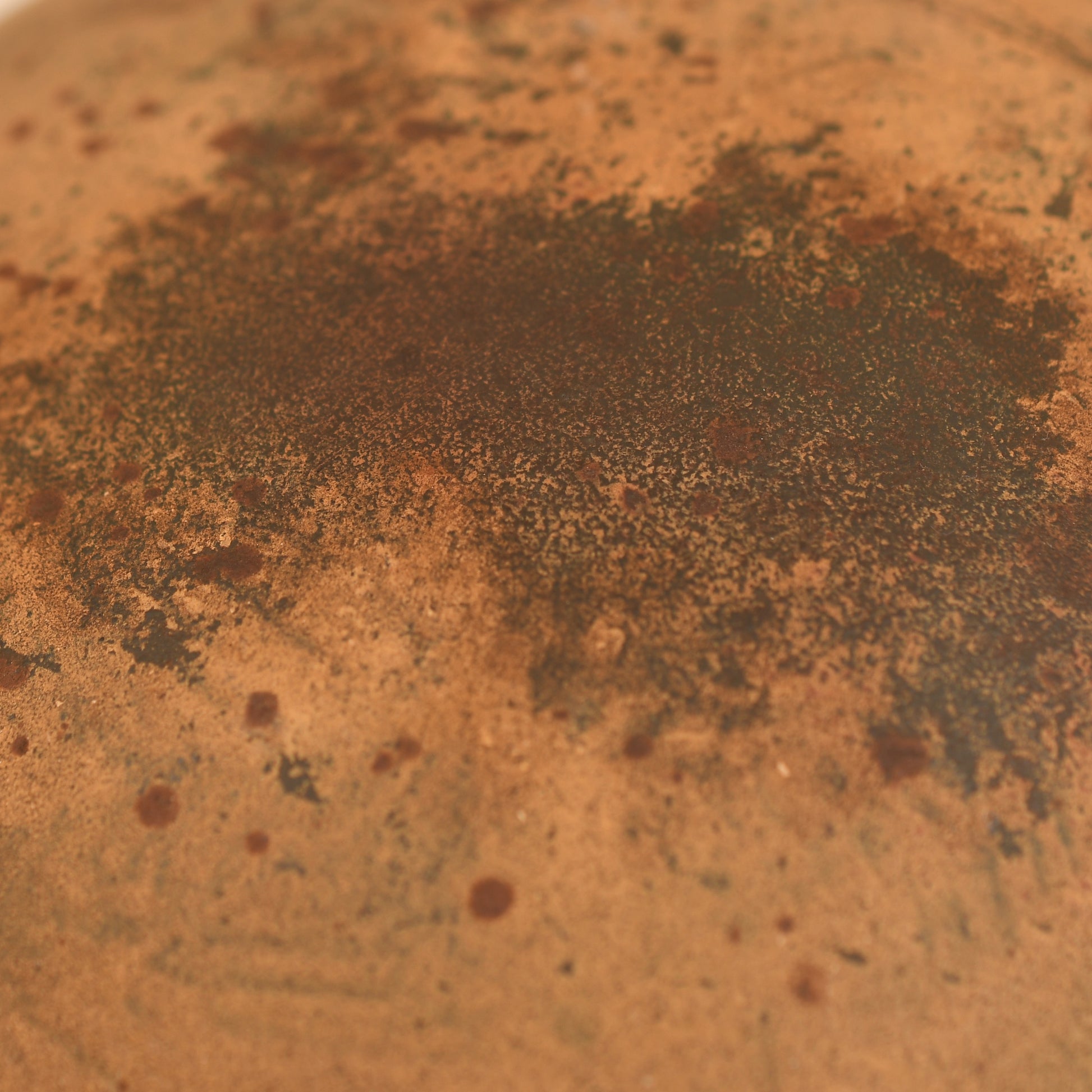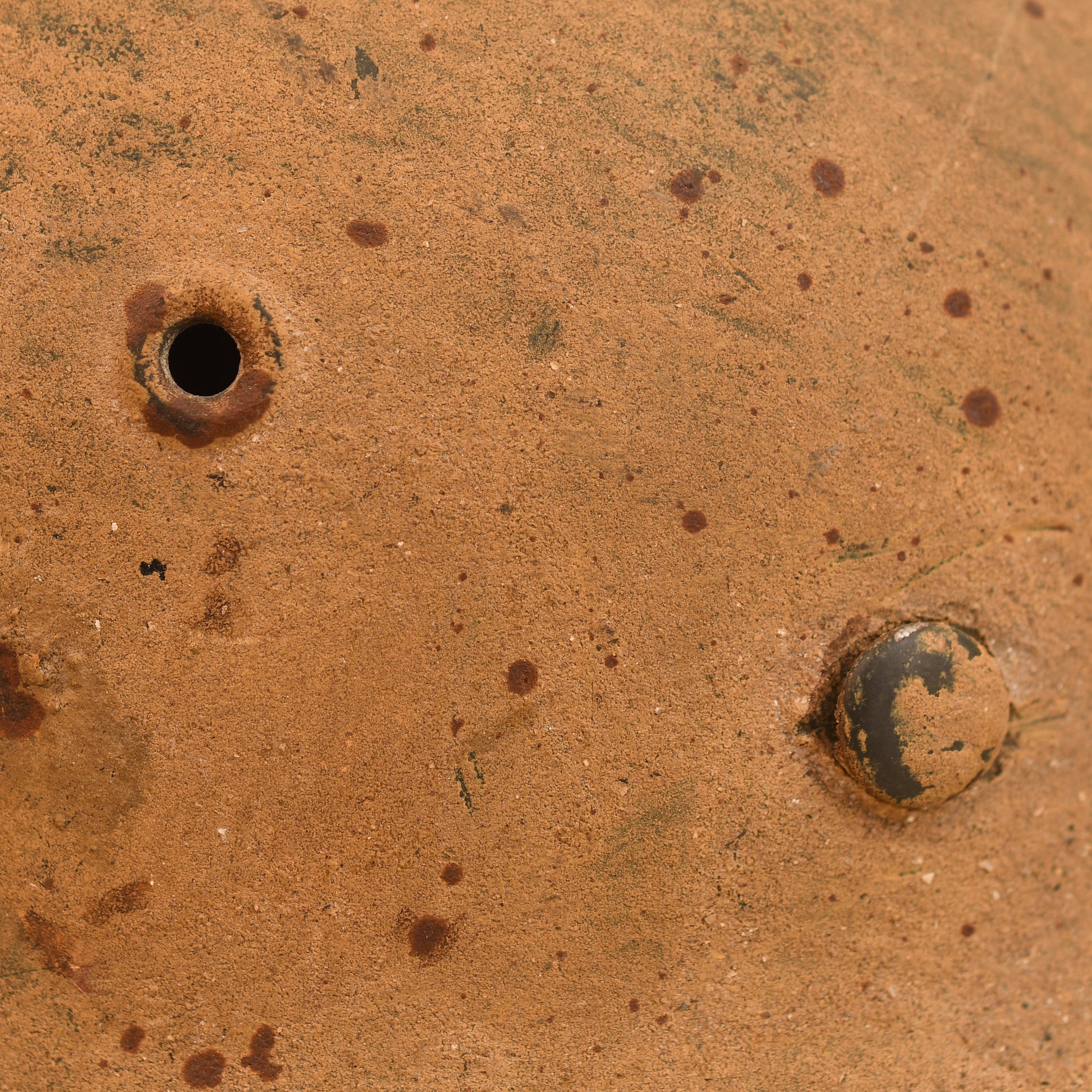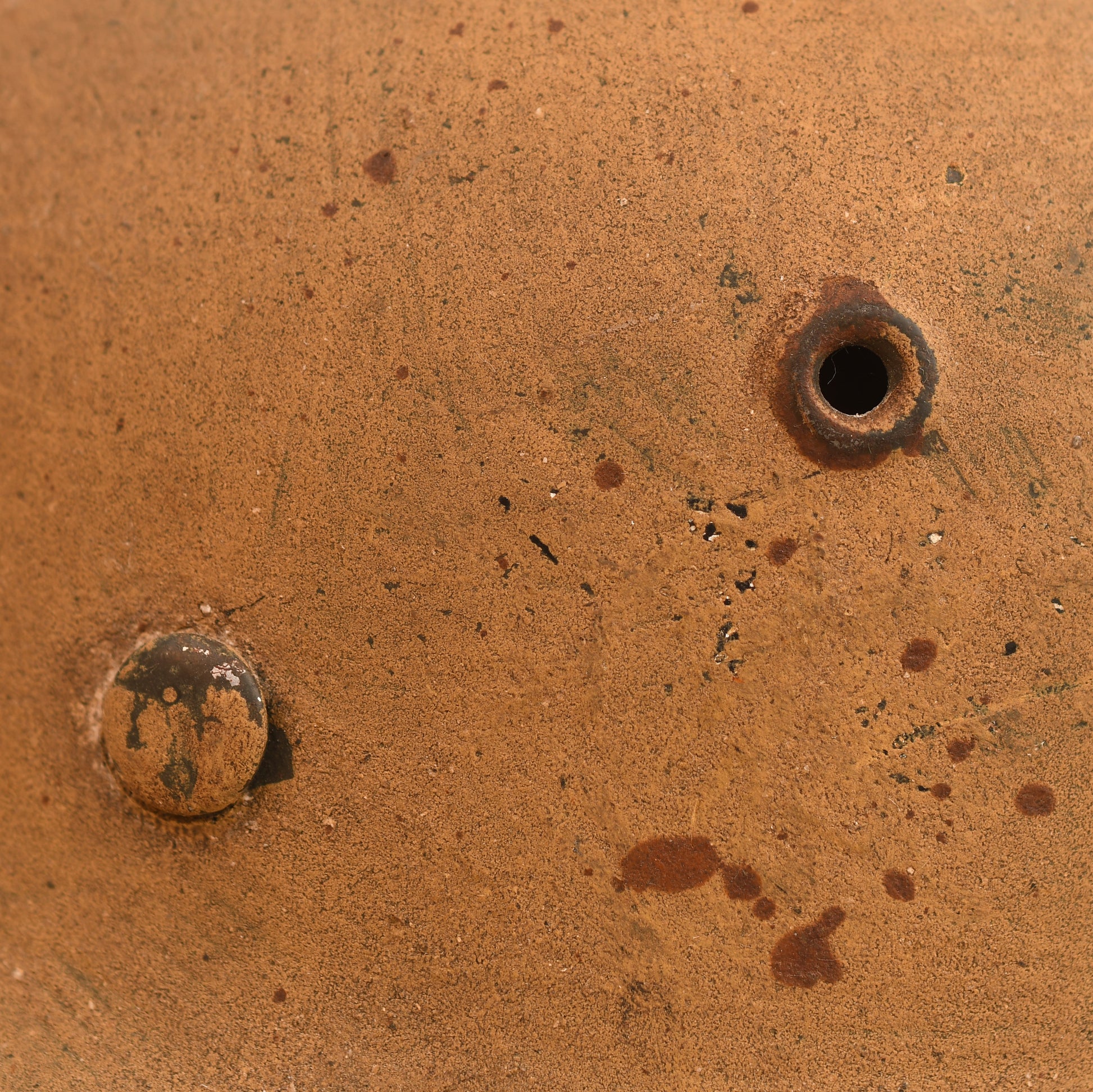 A well-used ET64 M.40 helmet in classic tropical finish. The crown shows a small section of loss, with some paint missing around the three liner retaining rivets and light overall rusting, consistent with age and service. The helmet is fitted with its original size 55 zinc-banded liner and drawstring. Faint traces of a painted name remain on the inner rear skirt, partially obscured by the tropical paint. A fine example of a tropical theatre M.40 helmet.