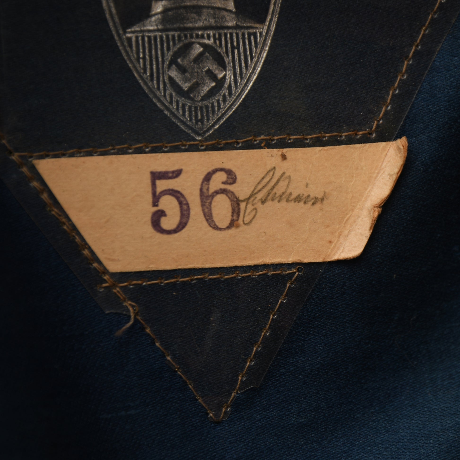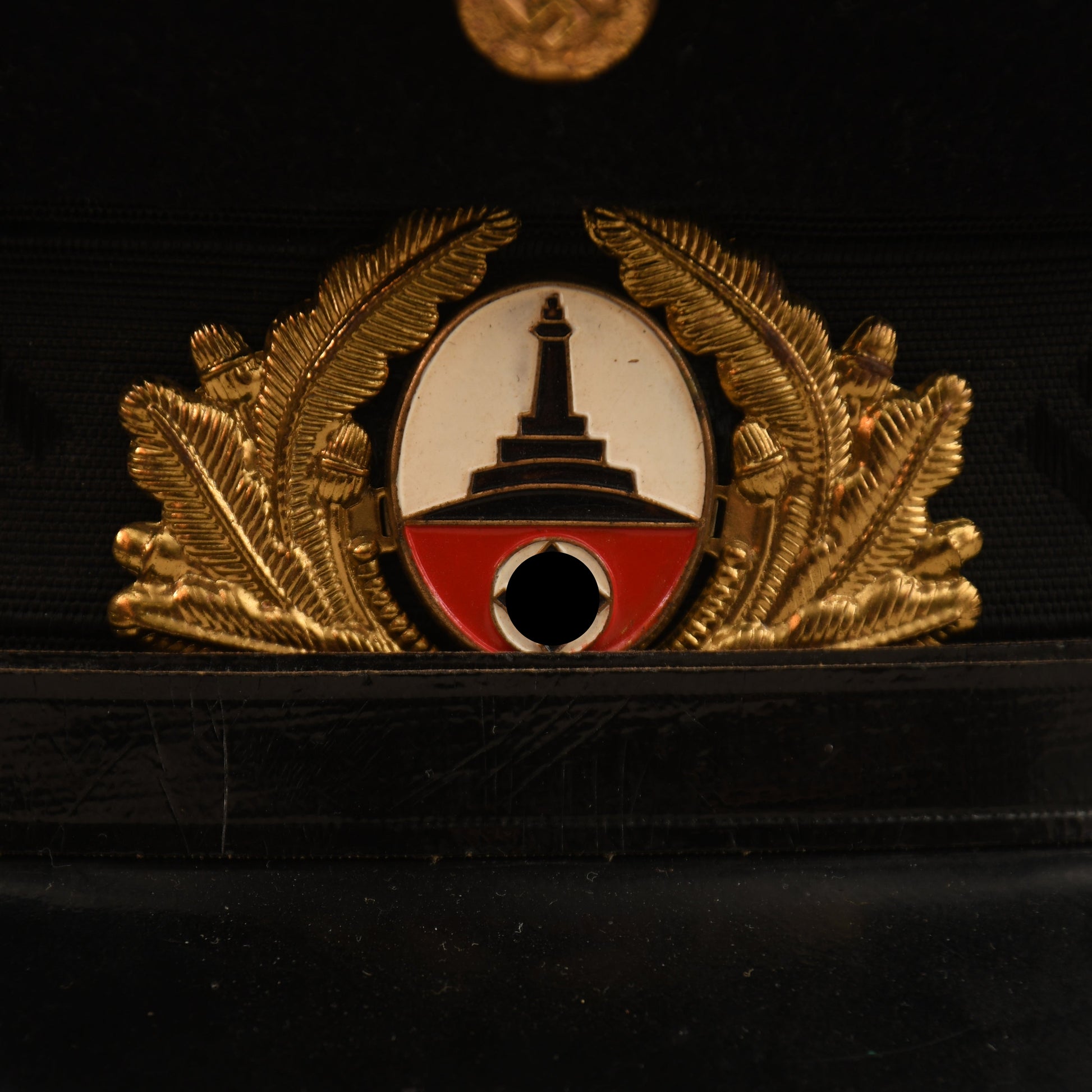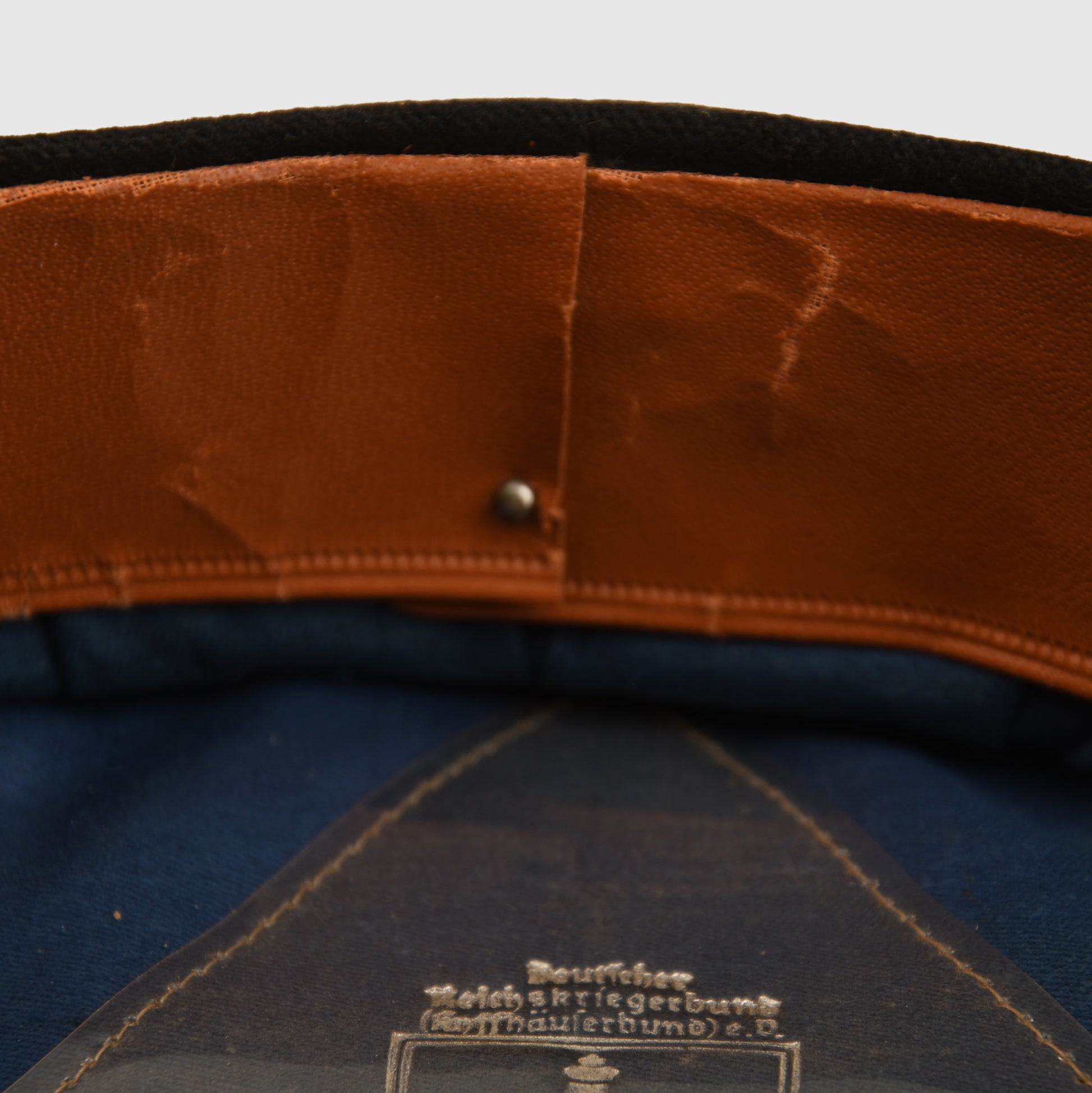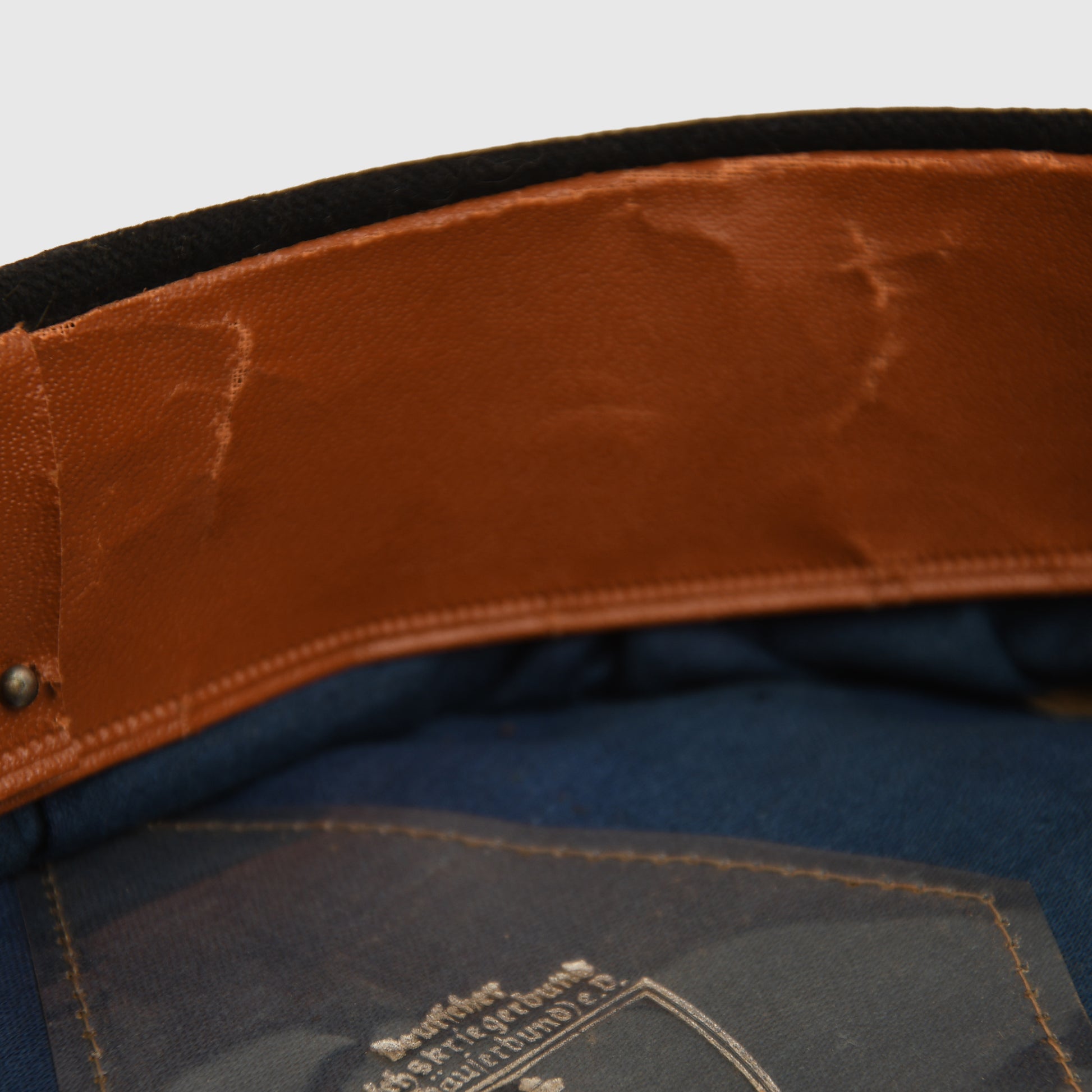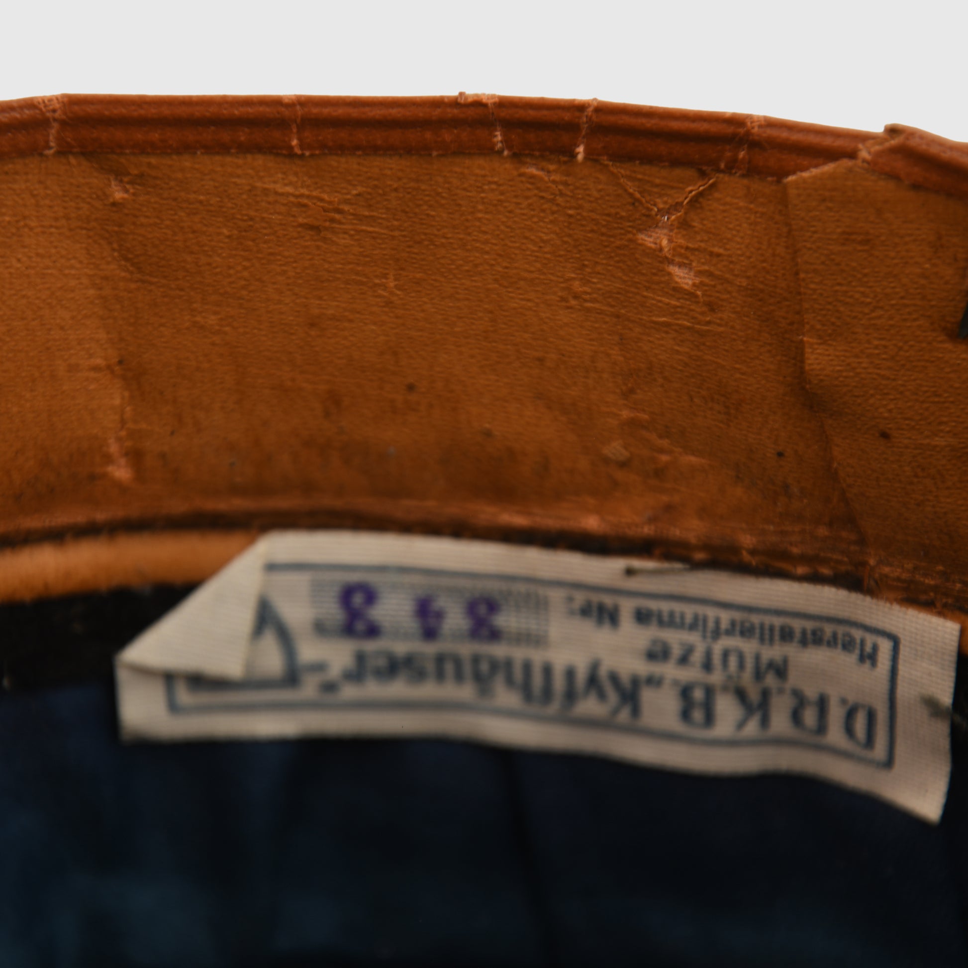 A nice condition size 56 all dark blue Veterans Association Kyffhauserbund with the blue satin lining, gold blocked insignia of the Kyffhauerbund silver blocked underneath the lozenge. Paper label size ‘56’ with the name applied. The original paper wrapping for the hat is still present in the interior. No moth. Nice insignia. Good strap with undamaged peak. Complete with its original ‘D.R.K.B.’ Kyffhauersbund official issue label to the interior underneath the ersatz type liner.