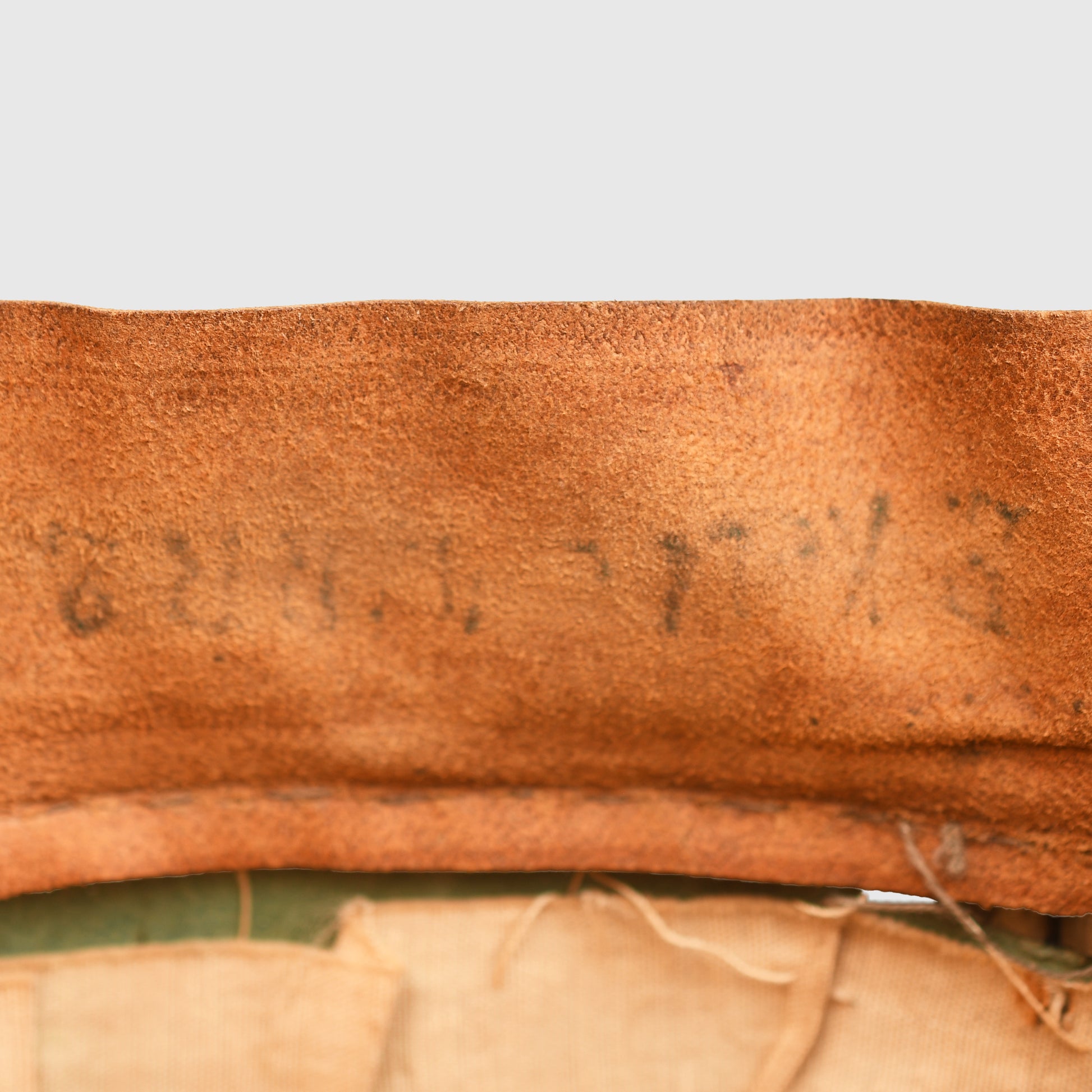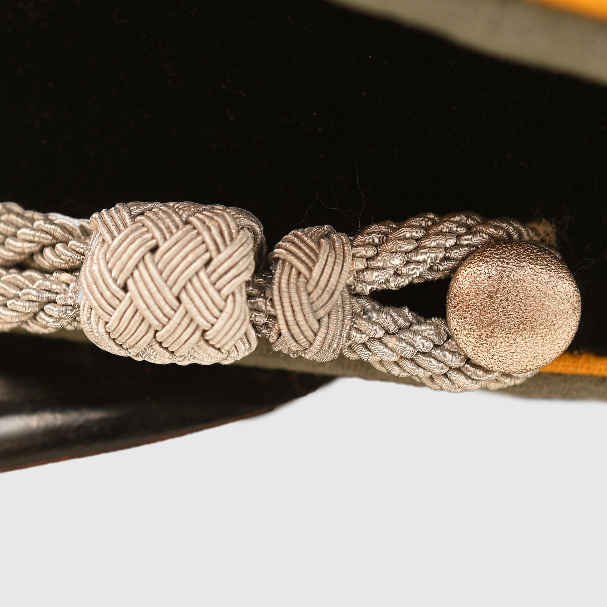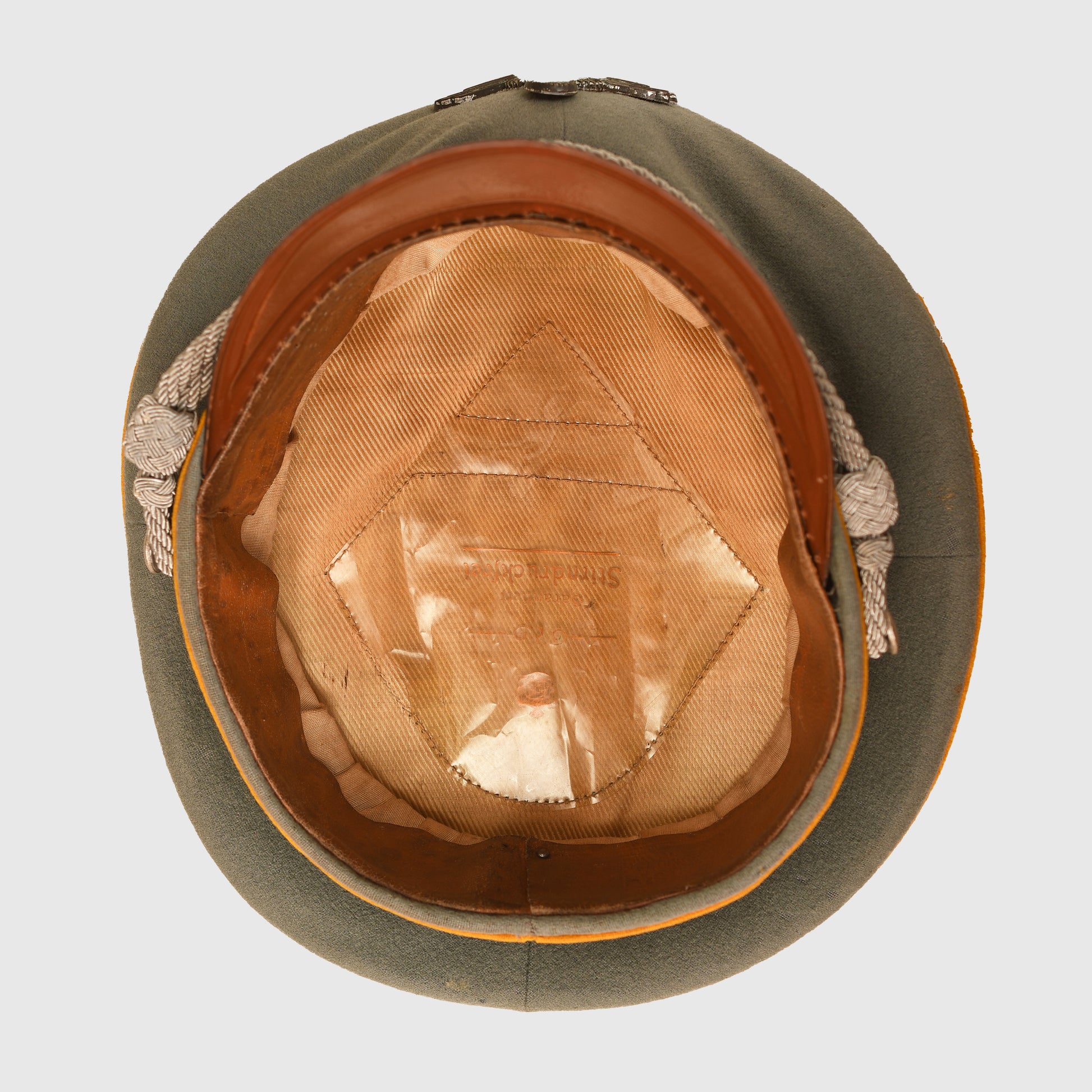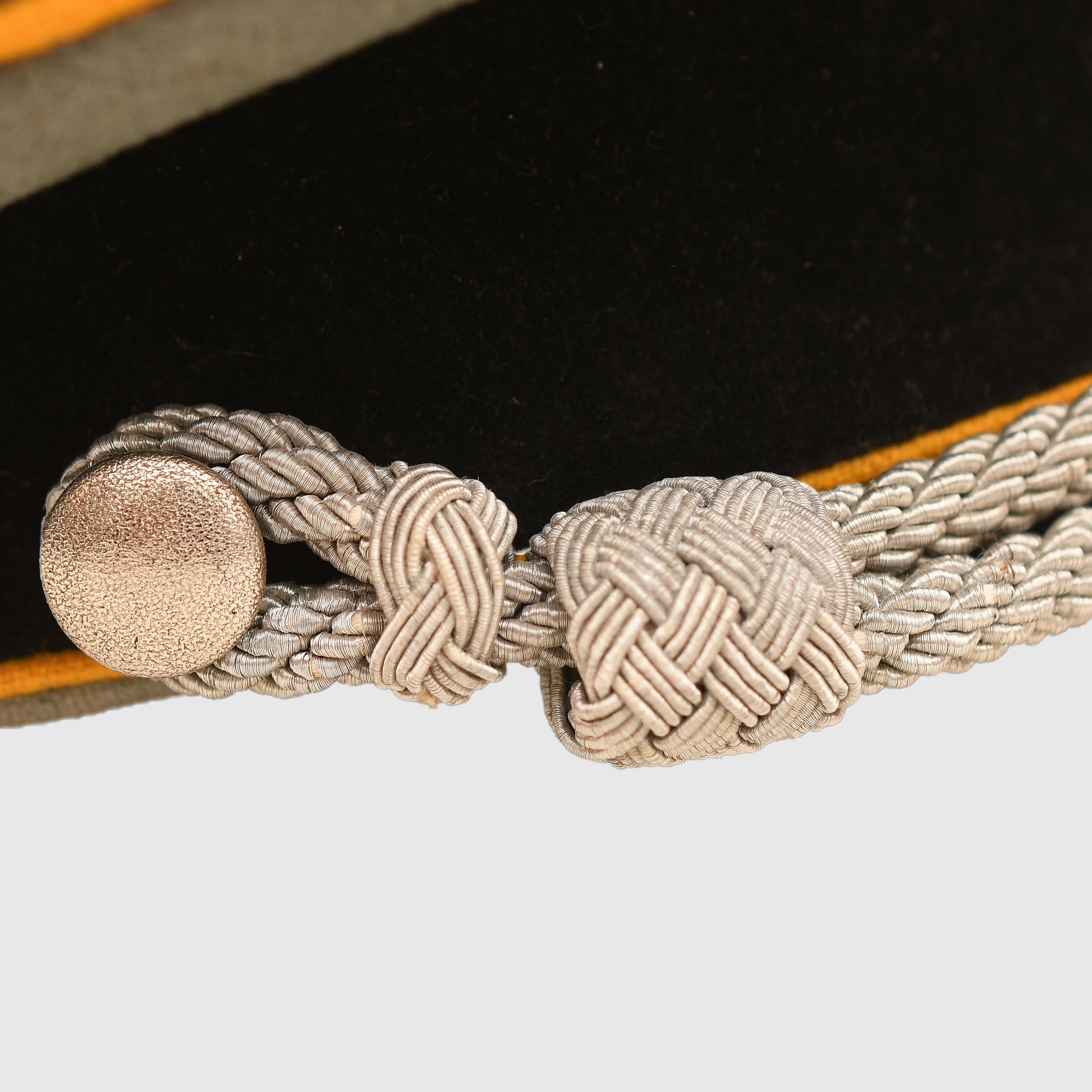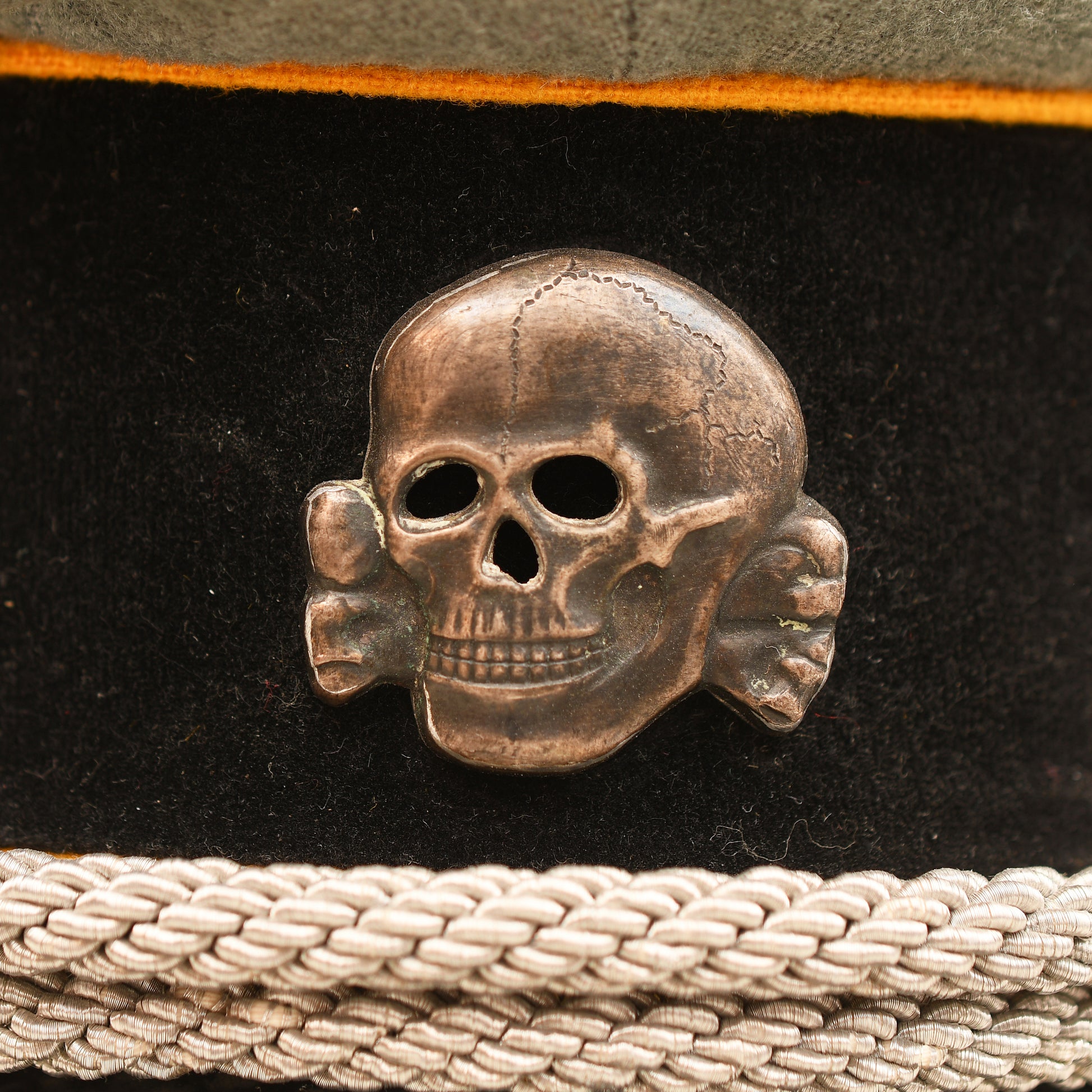 An exceptionally rare example from our own collection, this SS officer’s saddle-shaped visor cap features the elusive cavalry yellow waffenfarbe, introduced only briefly in 1940. This cap is marked internally in two places to the 2nd Totenkopf Reiter Regiment, one of the most hard-to-find unit designations. Constructed from a distinctive dove grey cloth—seen occasionally on high-quality officer caps—it features a tight black velvet centre band, matching white buttons, and untouched silver officer’s cords. The national SS eagle and skull are original to the cap, with the eagle appearing as if factory-applied. Size approximately 56.