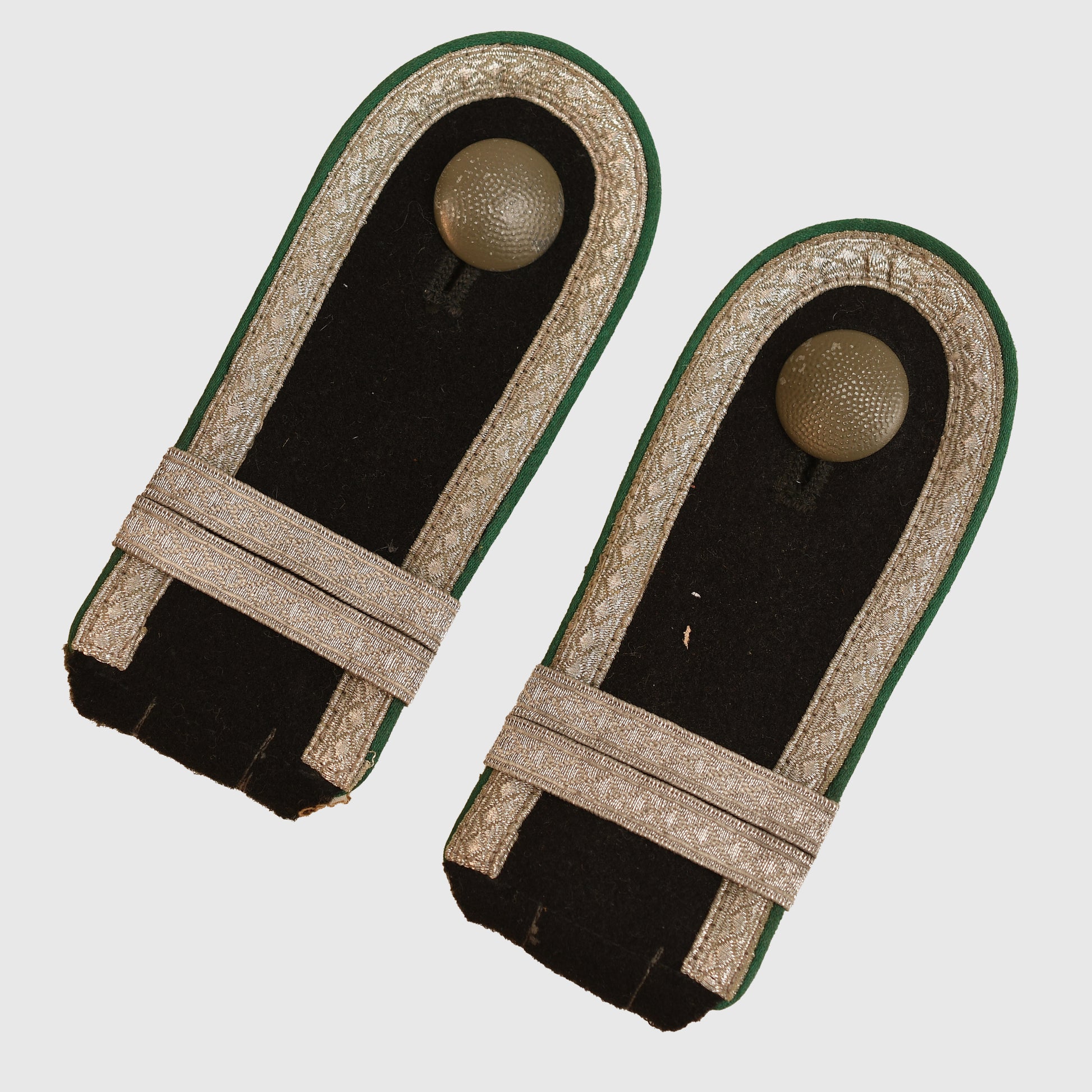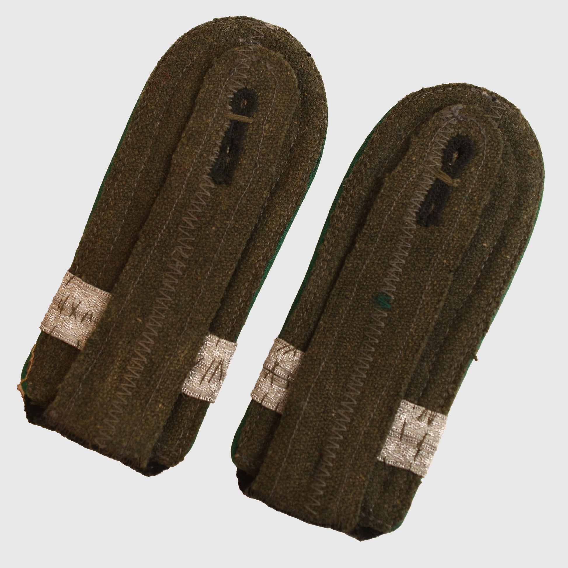 An excellent and well-preserved pair of shoulder boards for a Waffen SS Standartenjunker; featuring distinctive mountain green wool piping surrounding black centres. Each board is edged with silver lace, including a double row of lace at the base, highlighting the rank’s status. Both boards come complete with their original slip-on tabs, each retaining an attached button. These buttons have been secured by a previous collector using a few additional threads through the shank to hold the under tab in place—this modification can be easily removed if desired. The black centres are free from moth damage, and the field grey underlay remains intact.