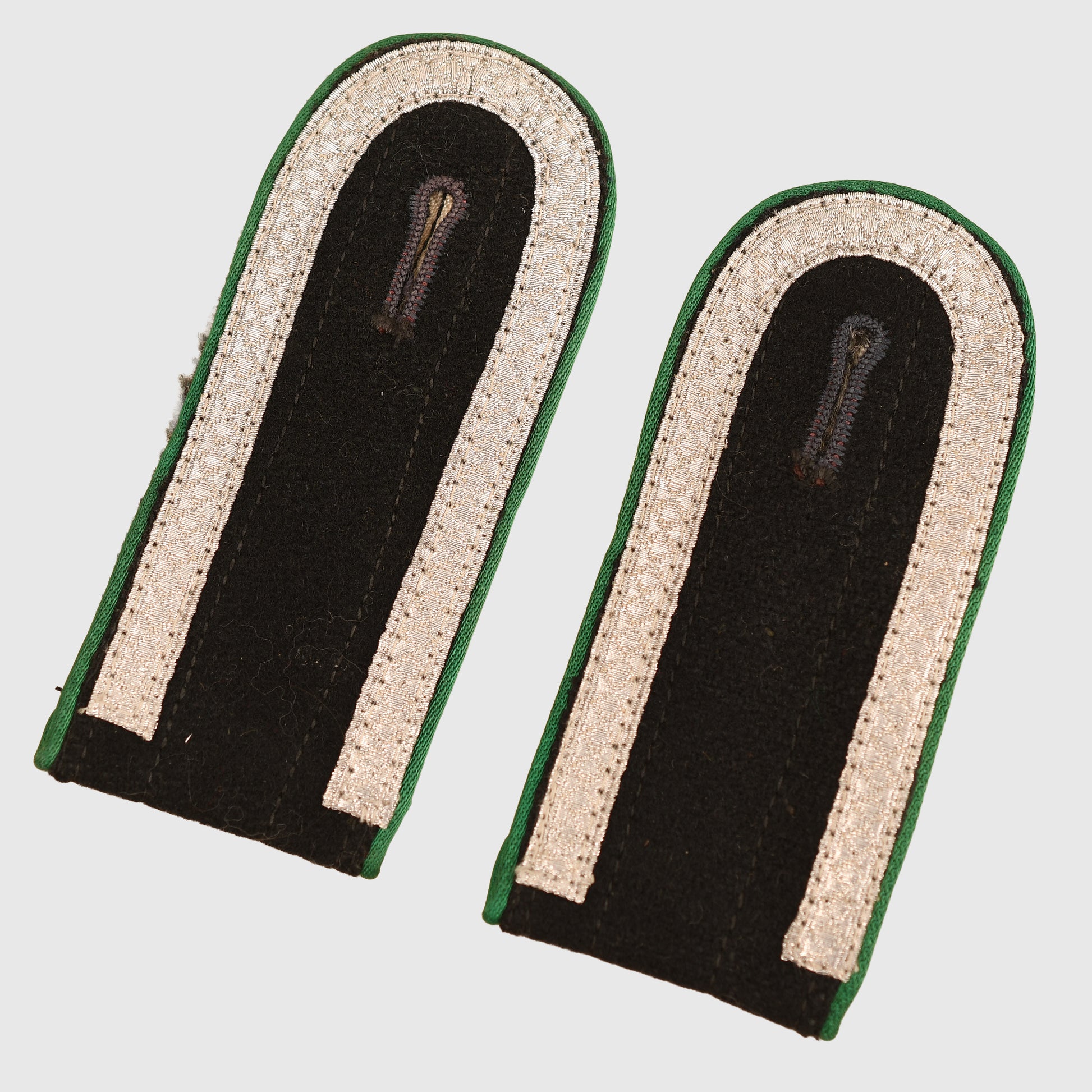 An excellent unused late-war pair of shoulder boards for a Waffen-SS Unterscharführer in mountain troops. Constructed with black centres, bright green silk piping, and rank tress. The reverse shows the slip-on tab and main board sewn together with a single strip of herringbone light cream rayon. Both boards are unlined to the reverse, a typical late-war expedient to conserve wool. A fine and scarce matching pair.