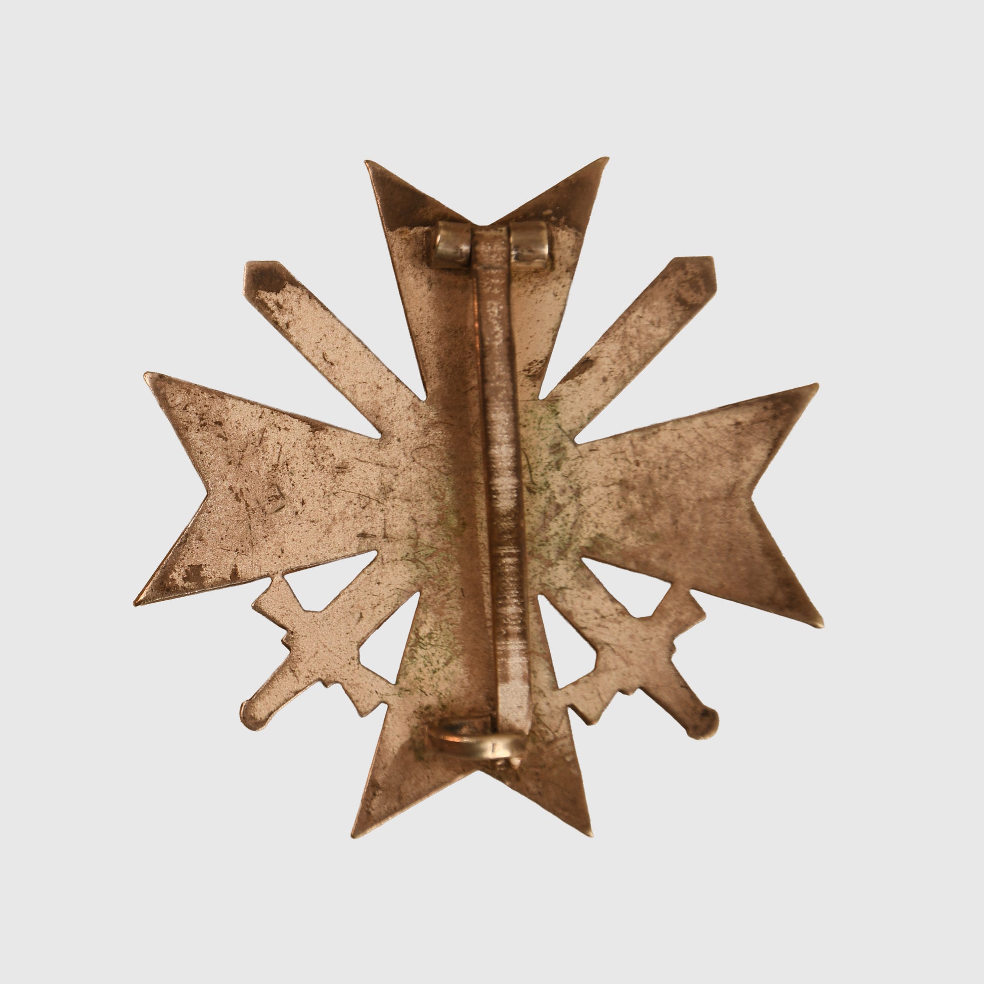 A clean example of the War Service Cross 1st Class with swords, complete with its original pin, hook, and hinge. Fitted into its original presentation case, the exterior lid bears a slightly thin silvered impression of the award with minor scuffing. The interior remains in good condition.