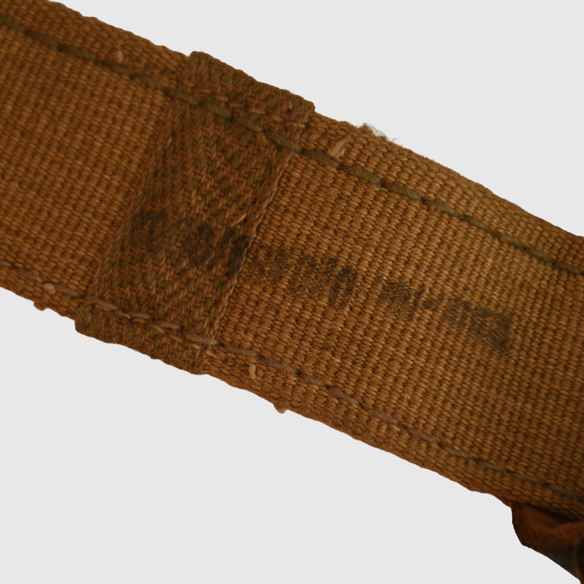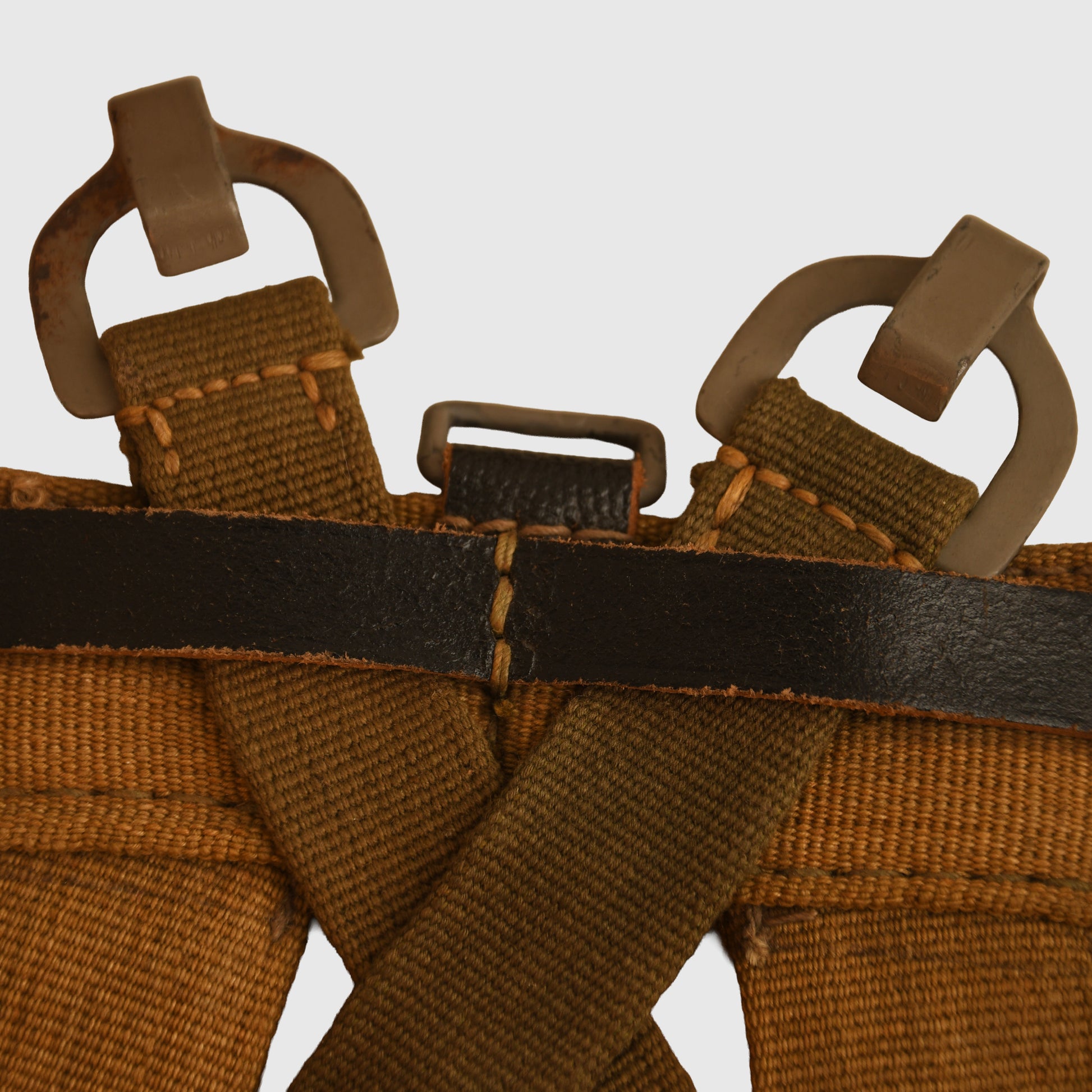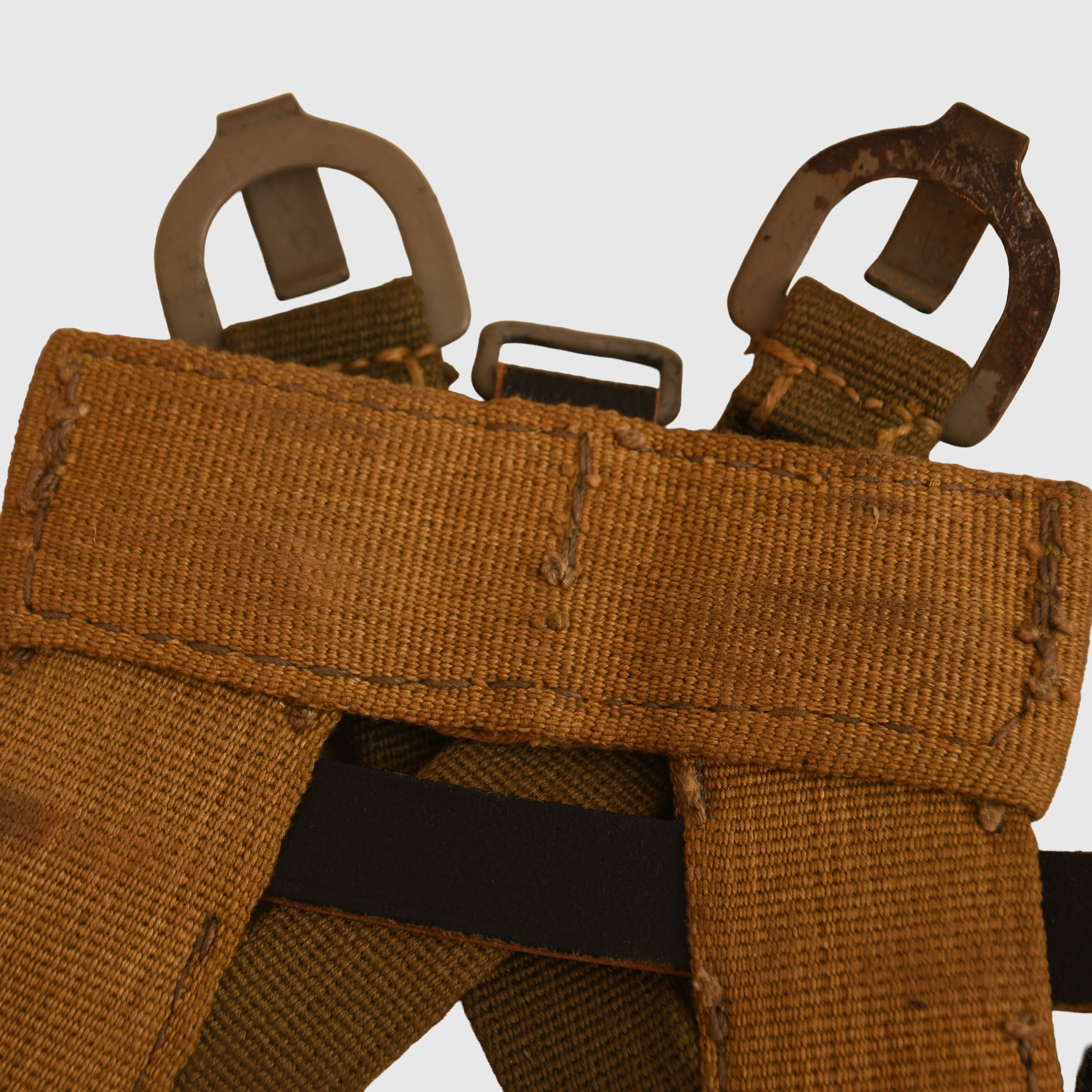 A virtually mint, unused example of an RB-numbered A frame. The main body is constructed in light tan webbing, complemented by two internal cross straps in a slightly darker shade. All leather fittings are complete with crisp white stitching, showing no signs of use.