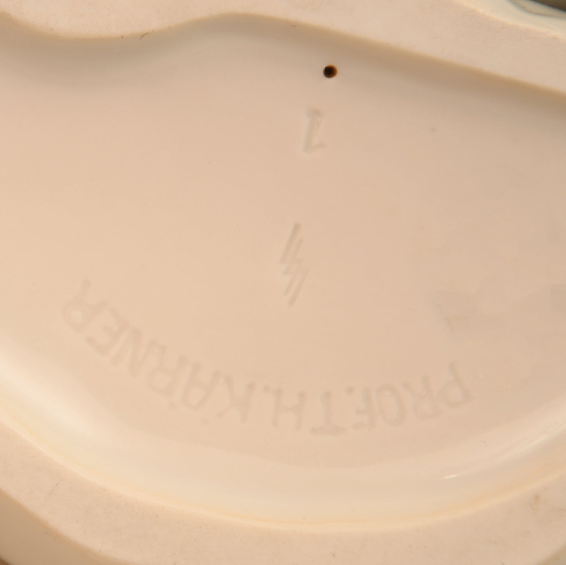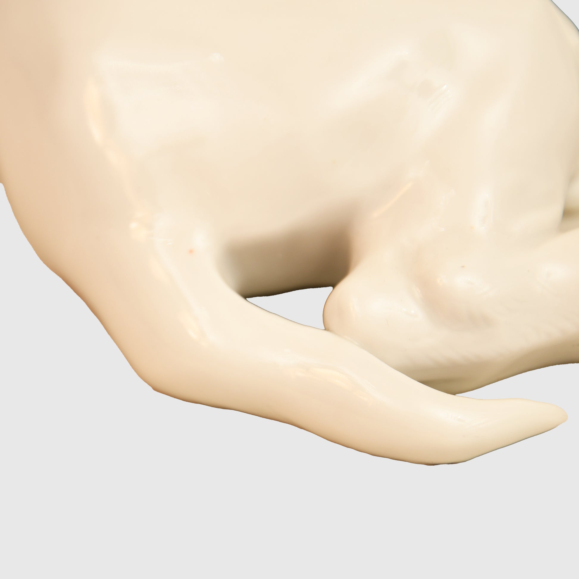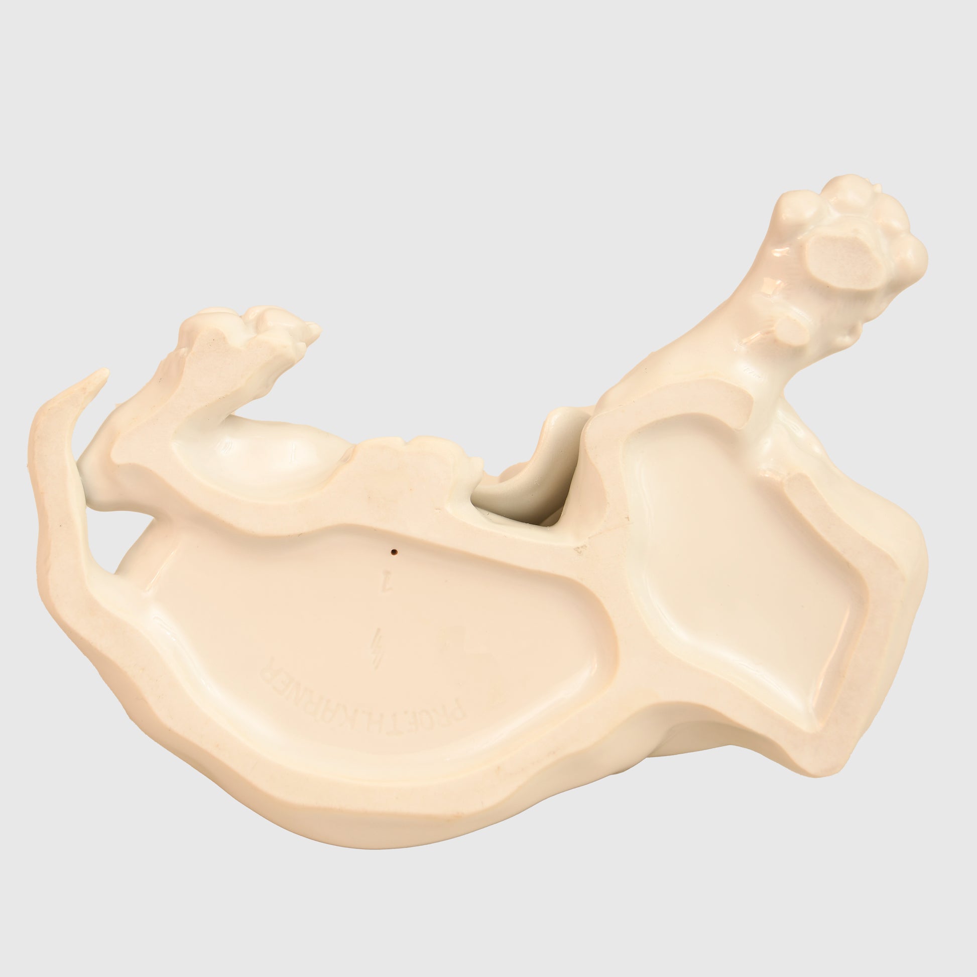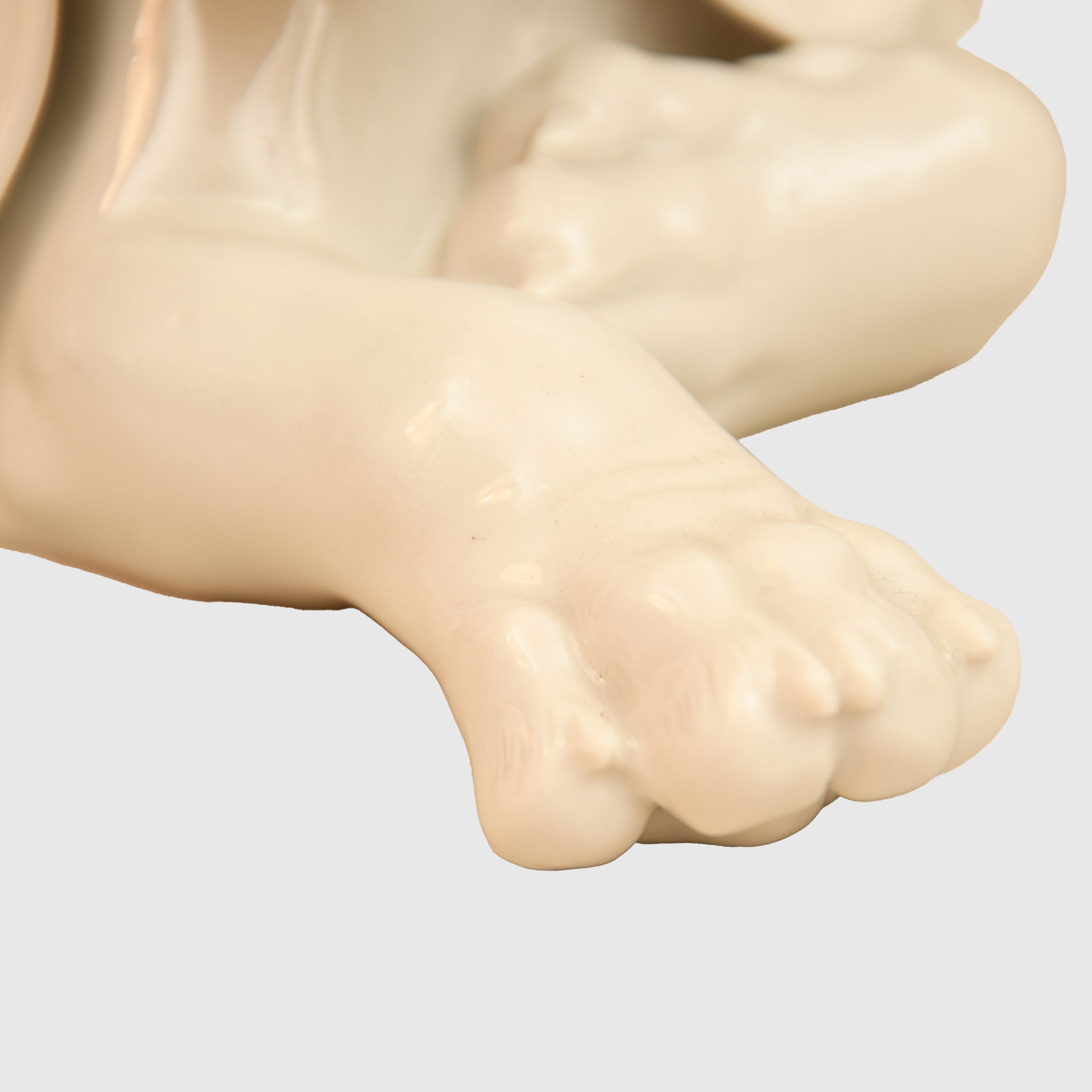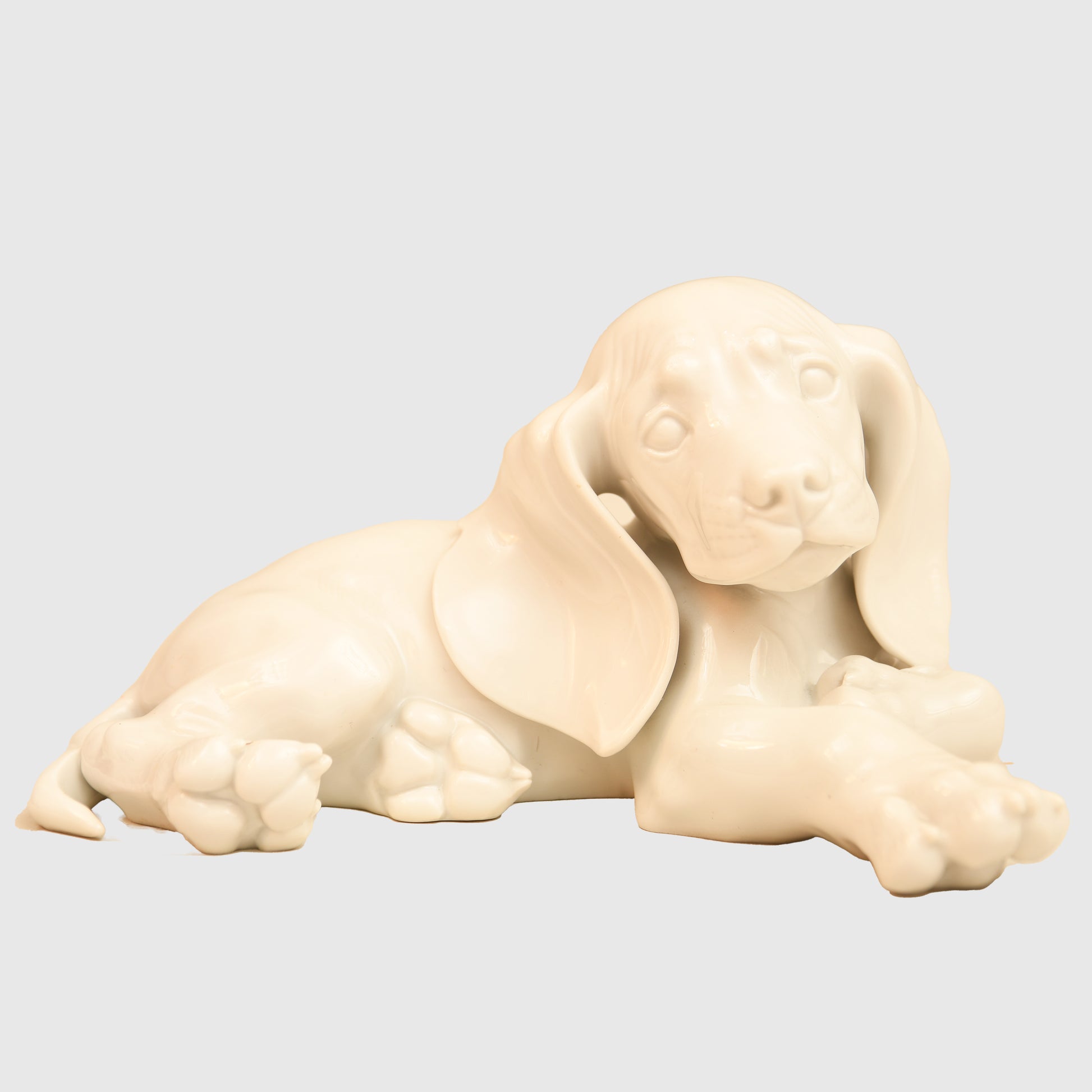 A fine example of the white glazed porcelain reclining dachshund, model number 1, designed by Theodor Kärner and produced by the renowned Allach manufactory. Production records indicate that only 322 examples of this model were made in white glaze during the years 1938 and 1939.