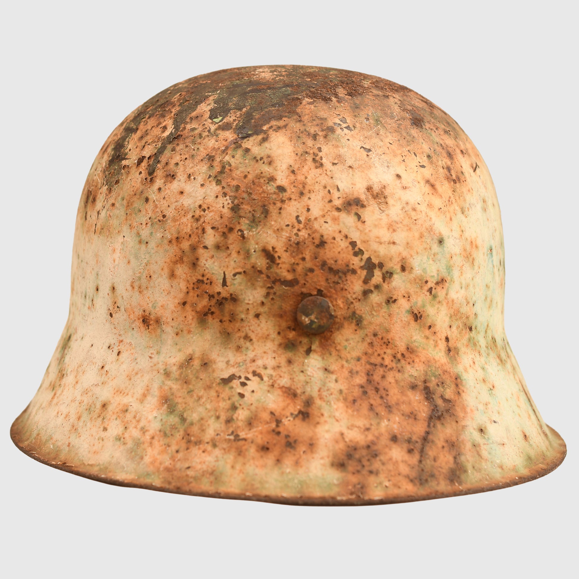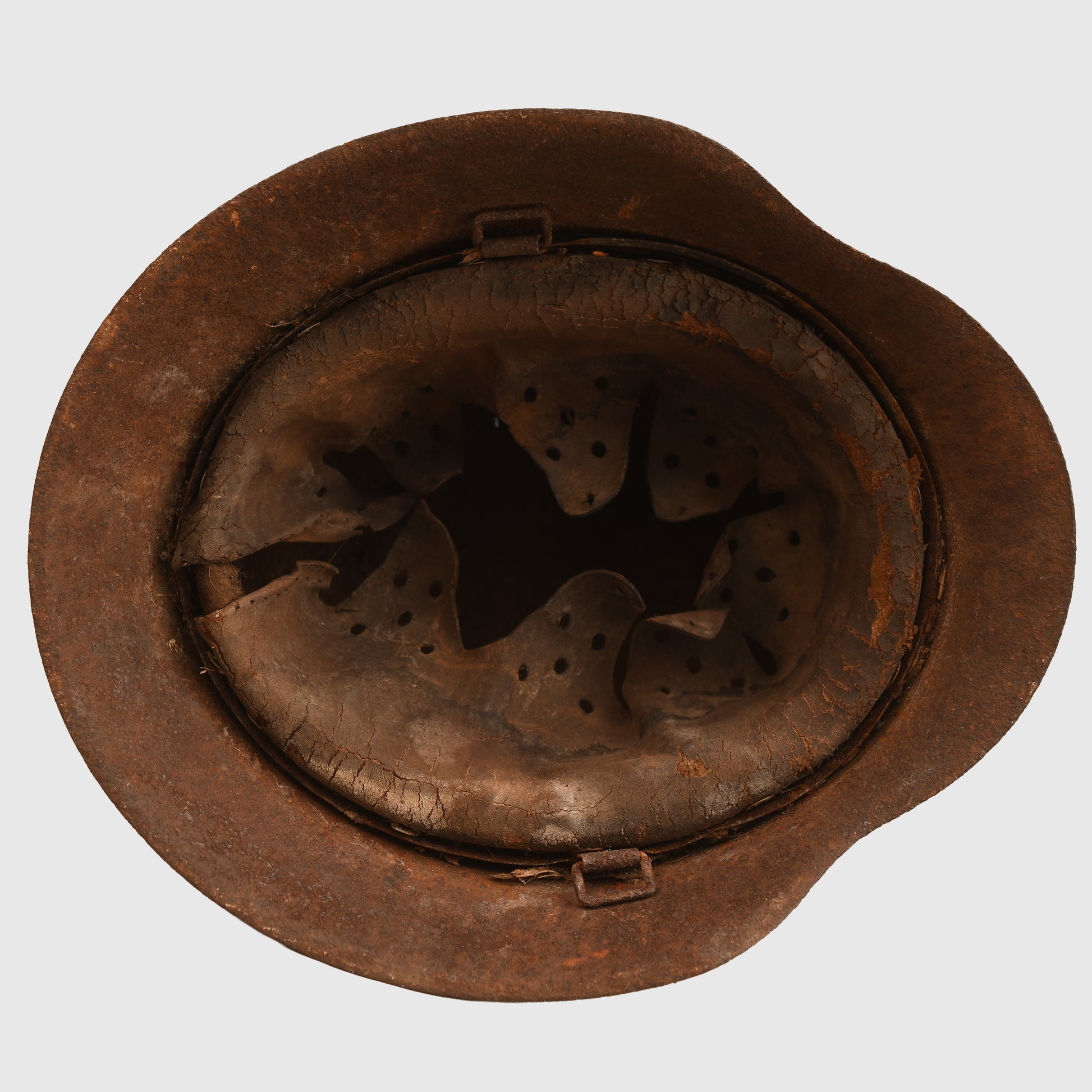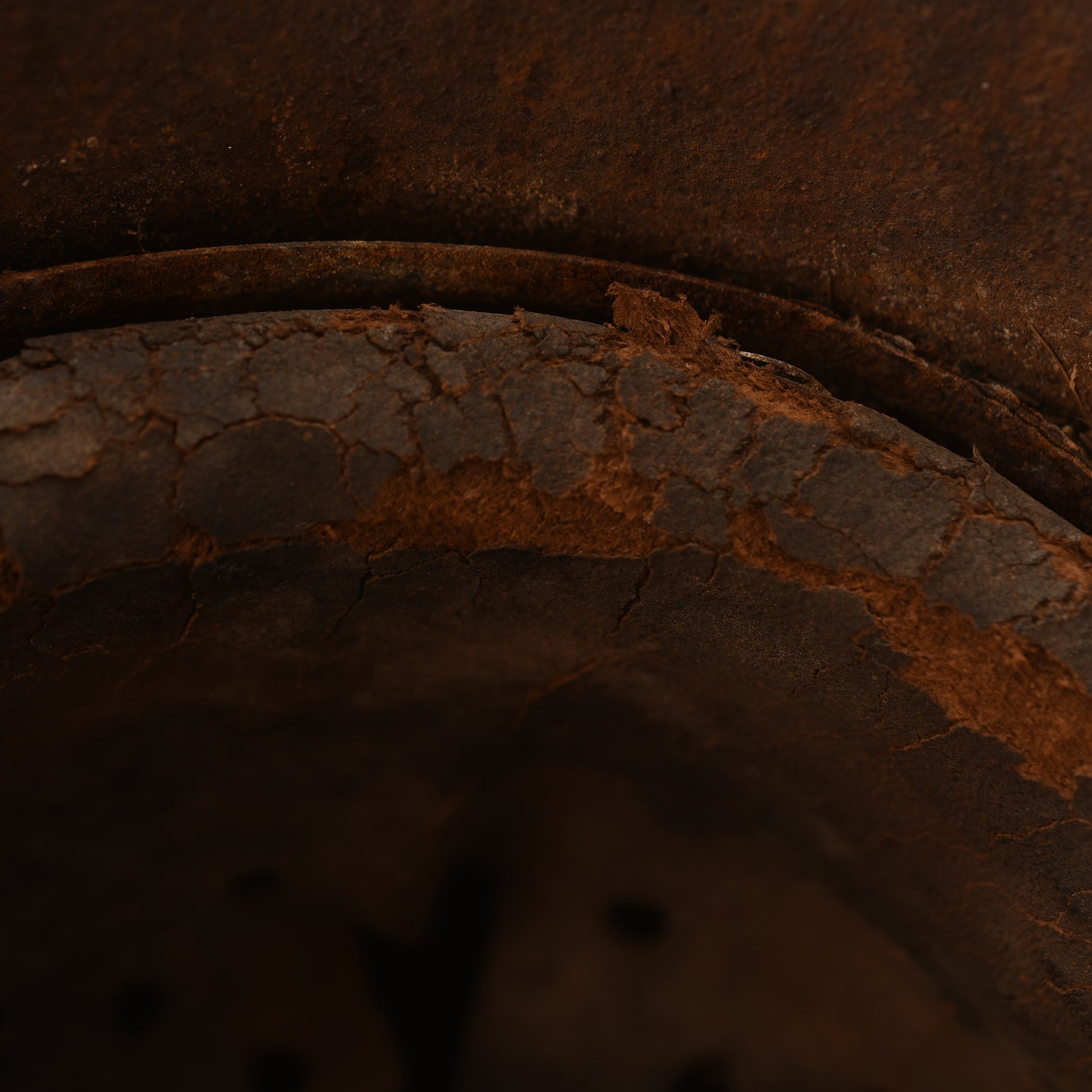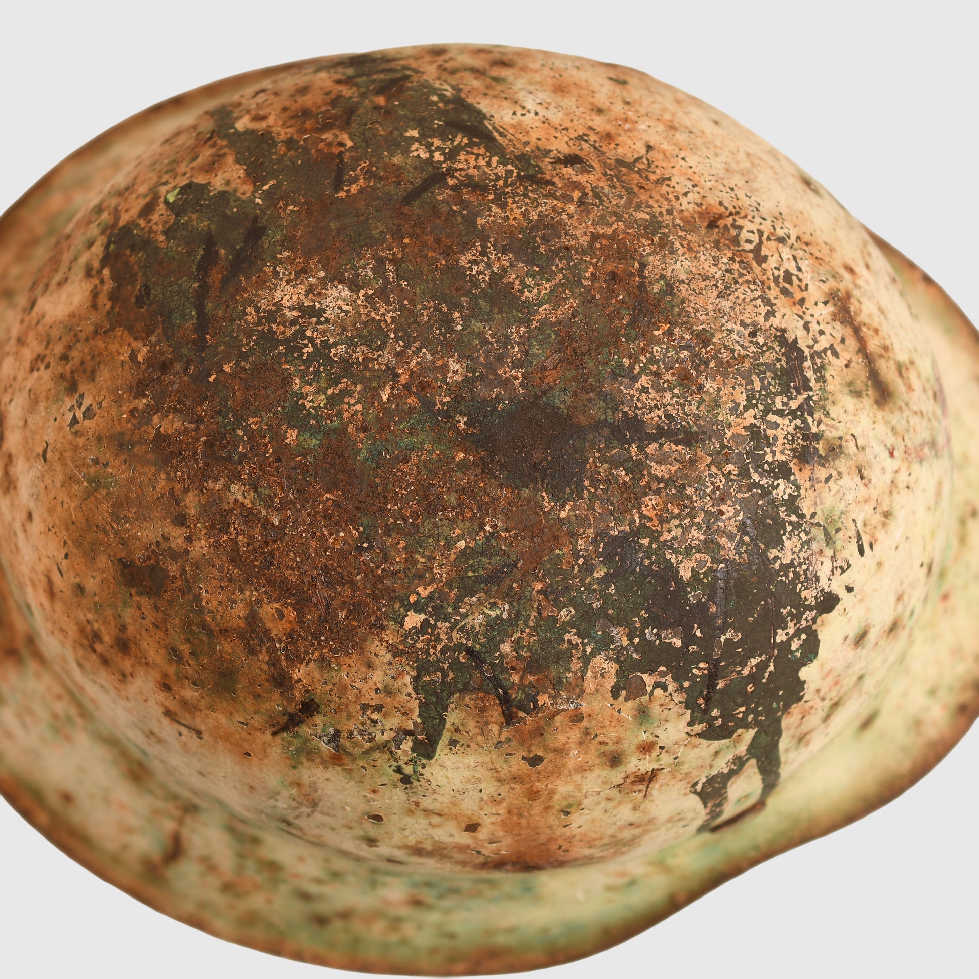 A fabulous barn find helmet, being an M.42 raw edge combat helmet, painted white with the remains of its red cross to the face side. Considerable rust bleed in the crown area, where the white paint has removed itself, revealing the original grey-green paint below. Other parts of the helmet have rust bleed with, not only rust marks, but with the colour of the grey green below flooding through. To the front of the helmet can clearly be seen the outline of a red cross. To the interior, the complete shell has a thin layer of rust. The original liner is all complete; the stitching at the reverse side has split, but all the tongues are present. A super rare barn find helmet.