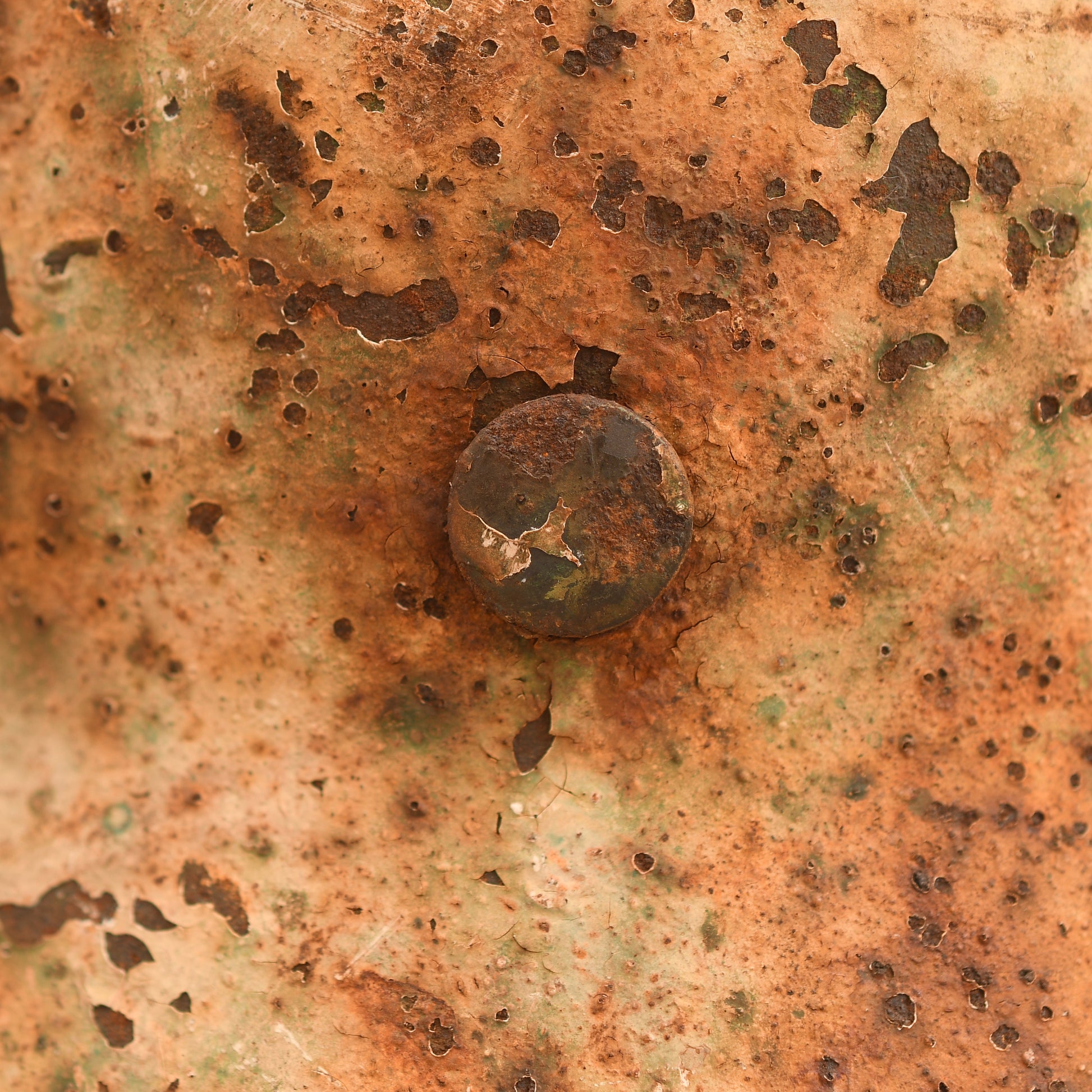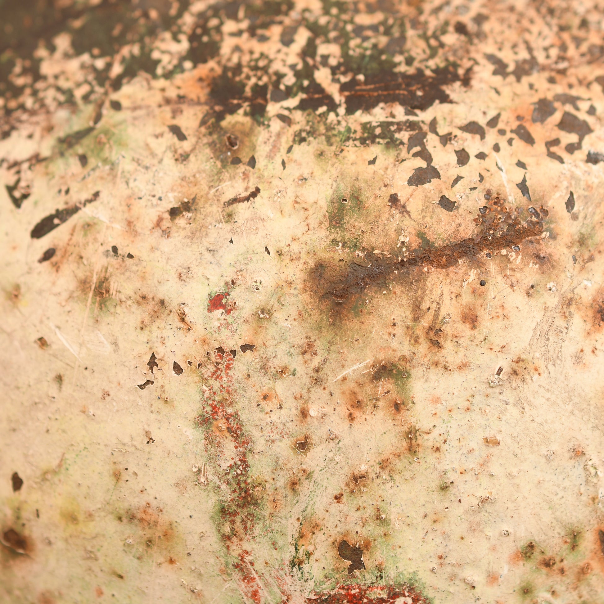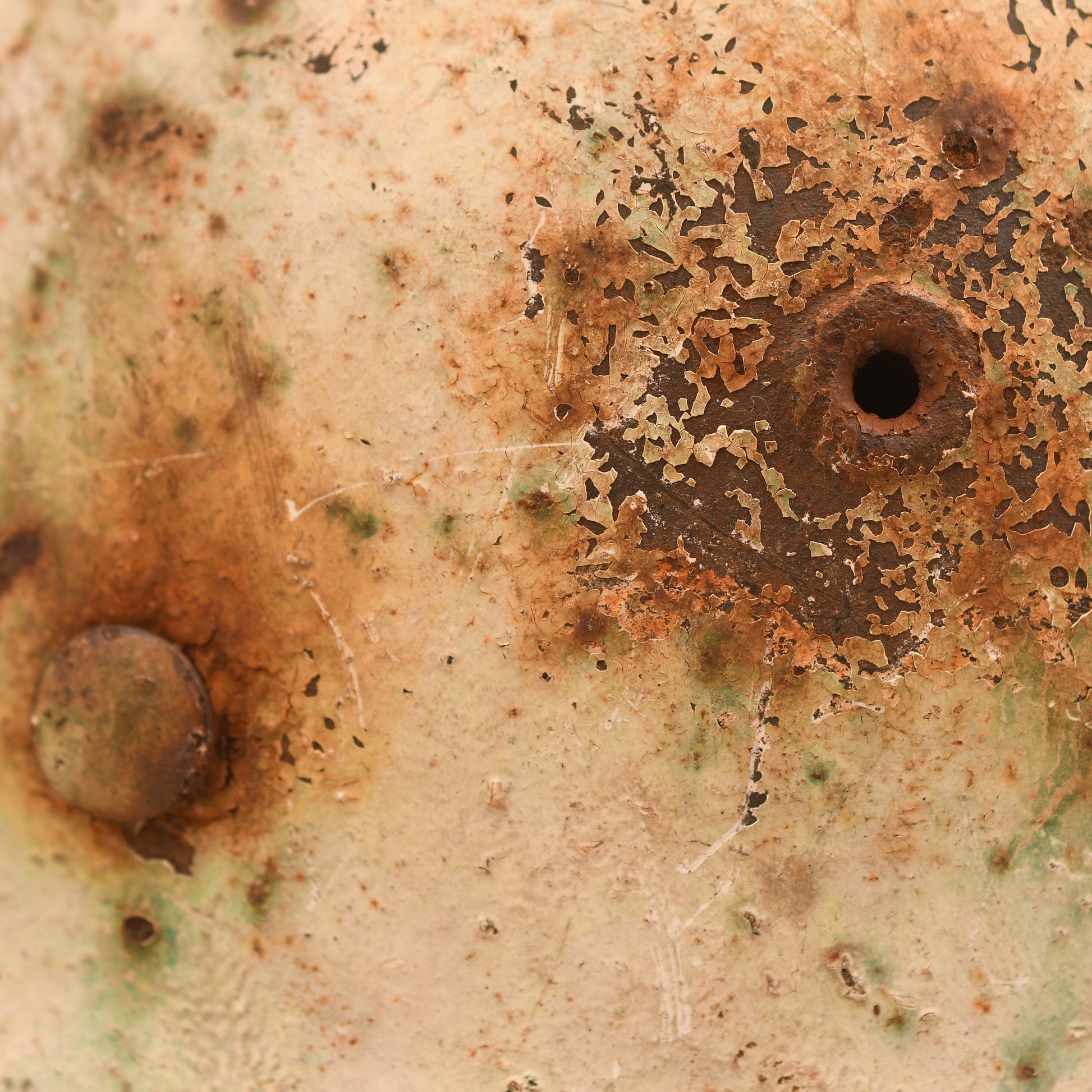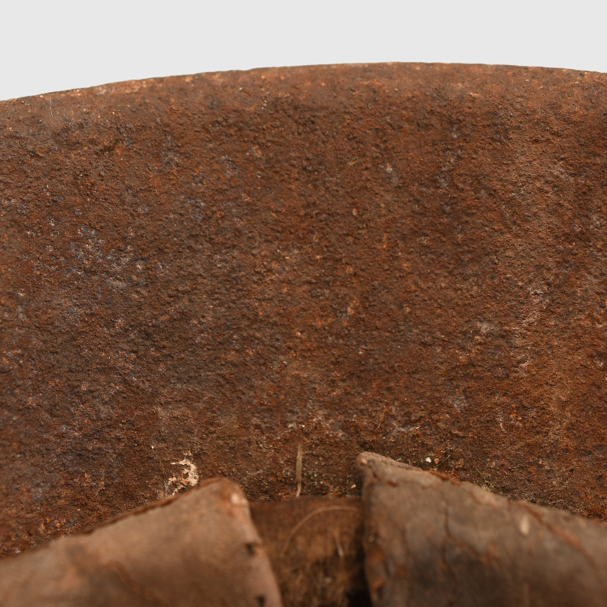A fabulous barn find helmet, being an M.42 raw edge combat helmet, painted white with the remains of its red cross to the face side. Considerable rust bleed in the crown area, where the white paint has removed itself, revealing the original grey-green paint below. Other parts of the helmet have rust bleed with, not only rust marks, but with the colour of the grey green below flooding through. To the front of the helmet can clearly be seen the outline of a red cross. To the interior, the complete shell has a thin layer of rust. The original liner is all complete; the stitching at the reverse side has split, but all the tongues are present. A super rare barn find helmet.