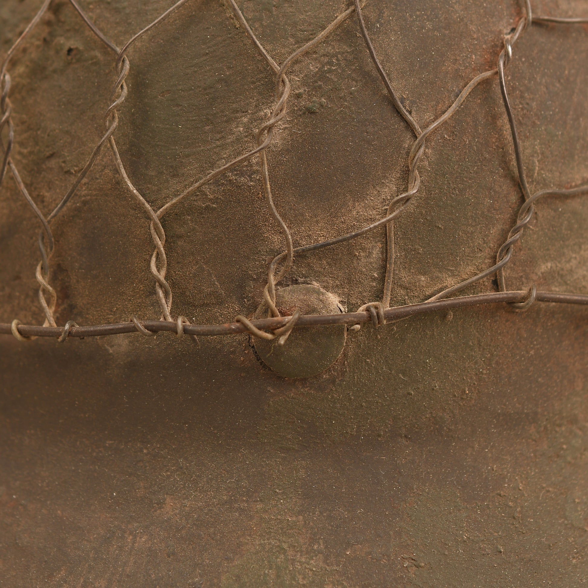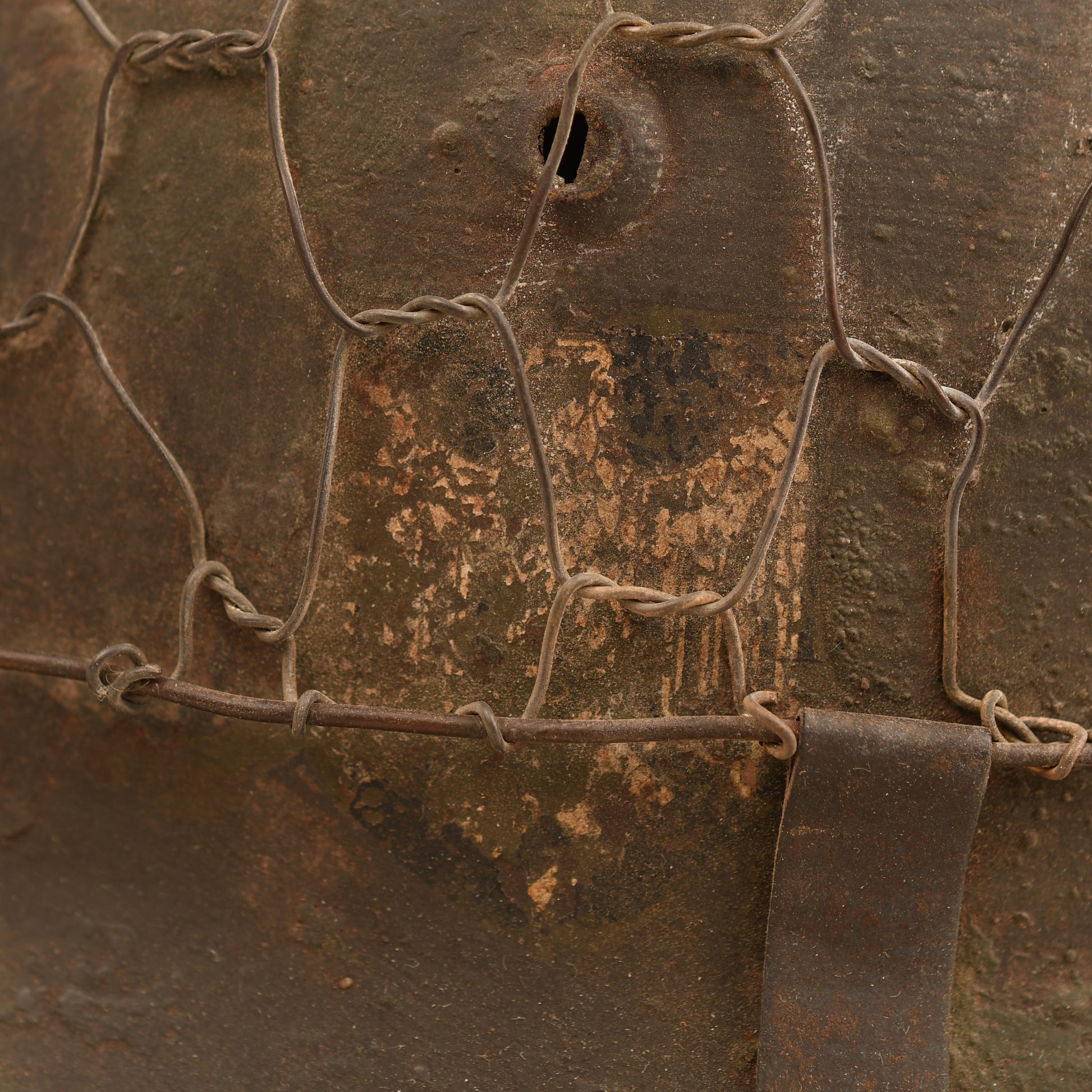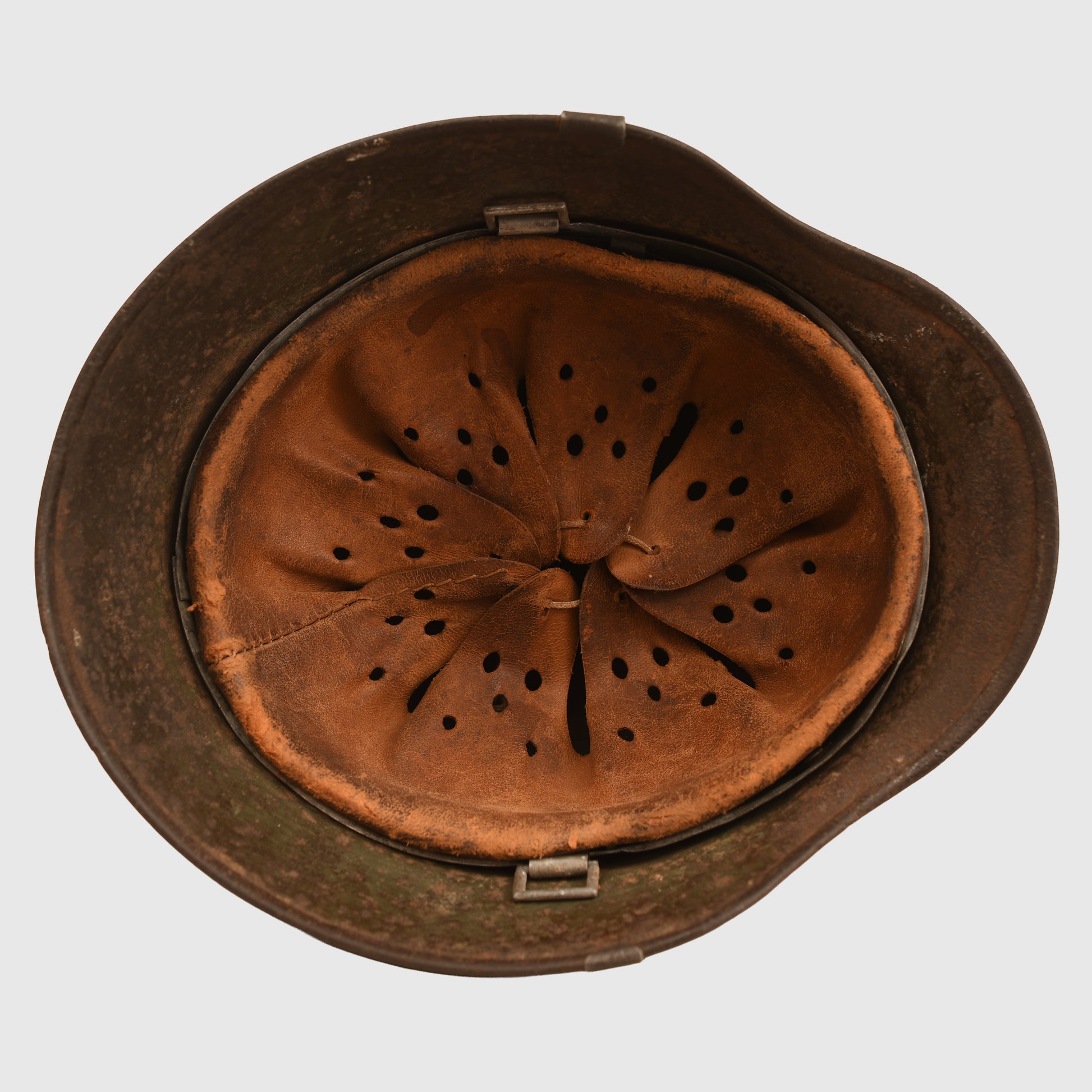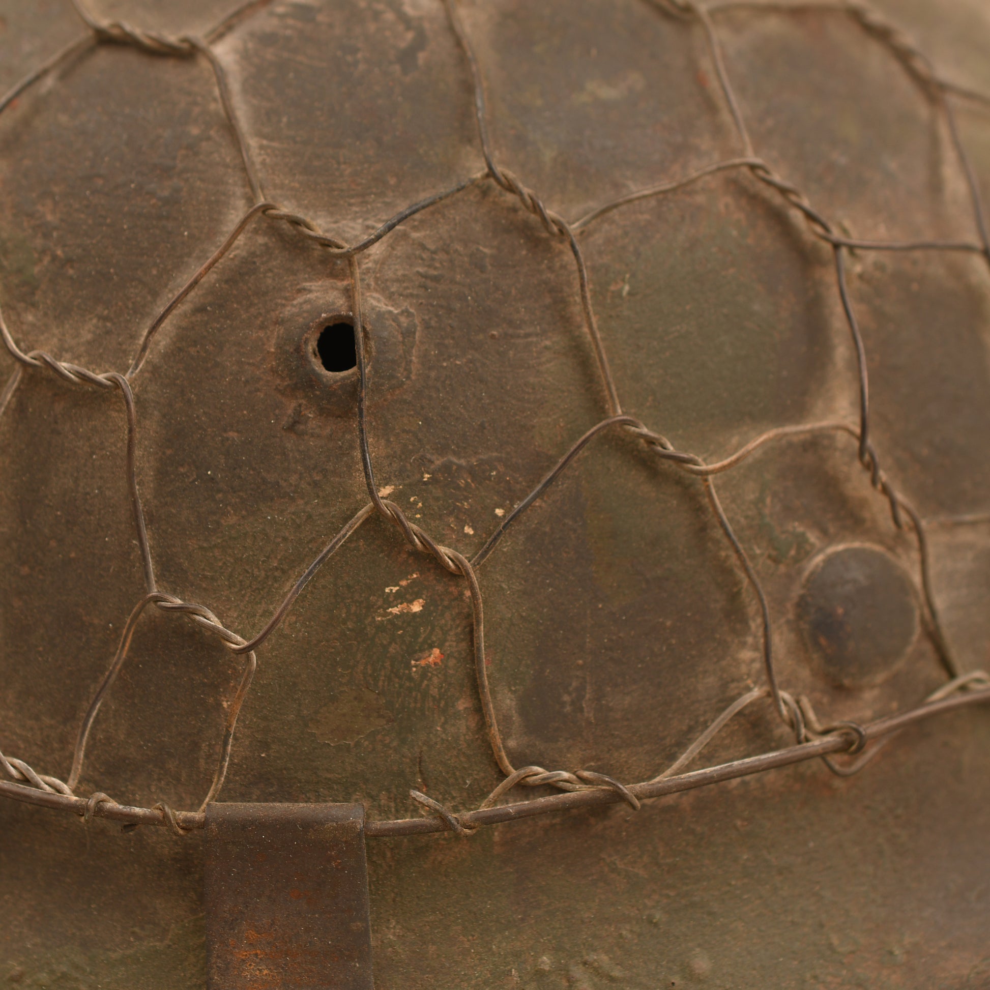 A size 64 M35 shell painted in a matte green camouflage finish, faint remnants of the army decal visible. The upper bowl is fitted with a wire frame for attaching foliage, secured with two steel clips. The interior retains its complete M35 aluminium-banded liner, showing wear but preserving a very good mid-tan colour with the original drawstring intact. Faint traces of the original apple green finish remain on the interior shell.