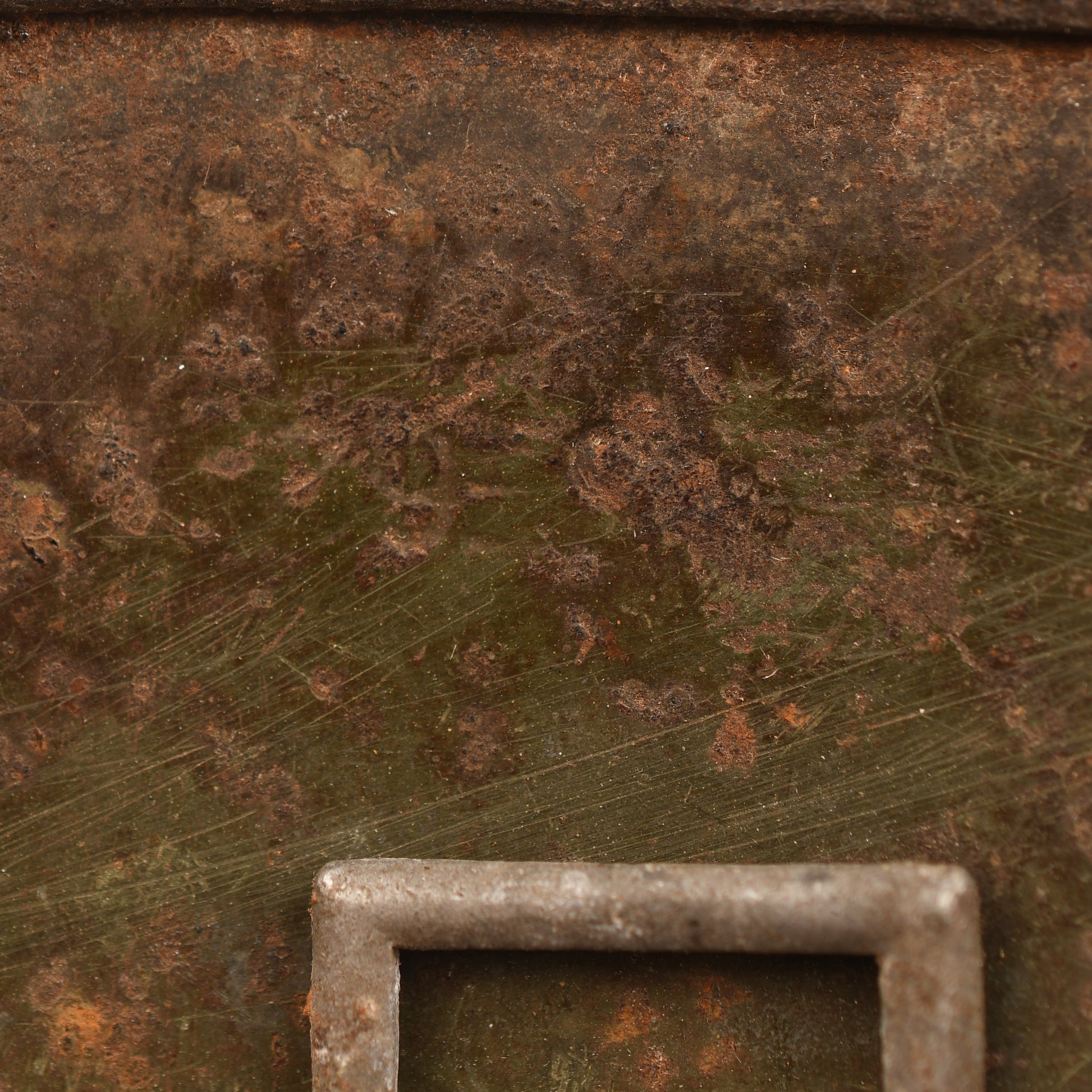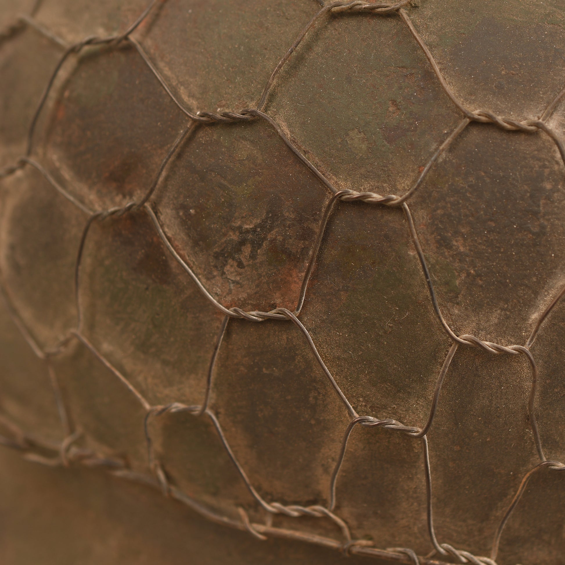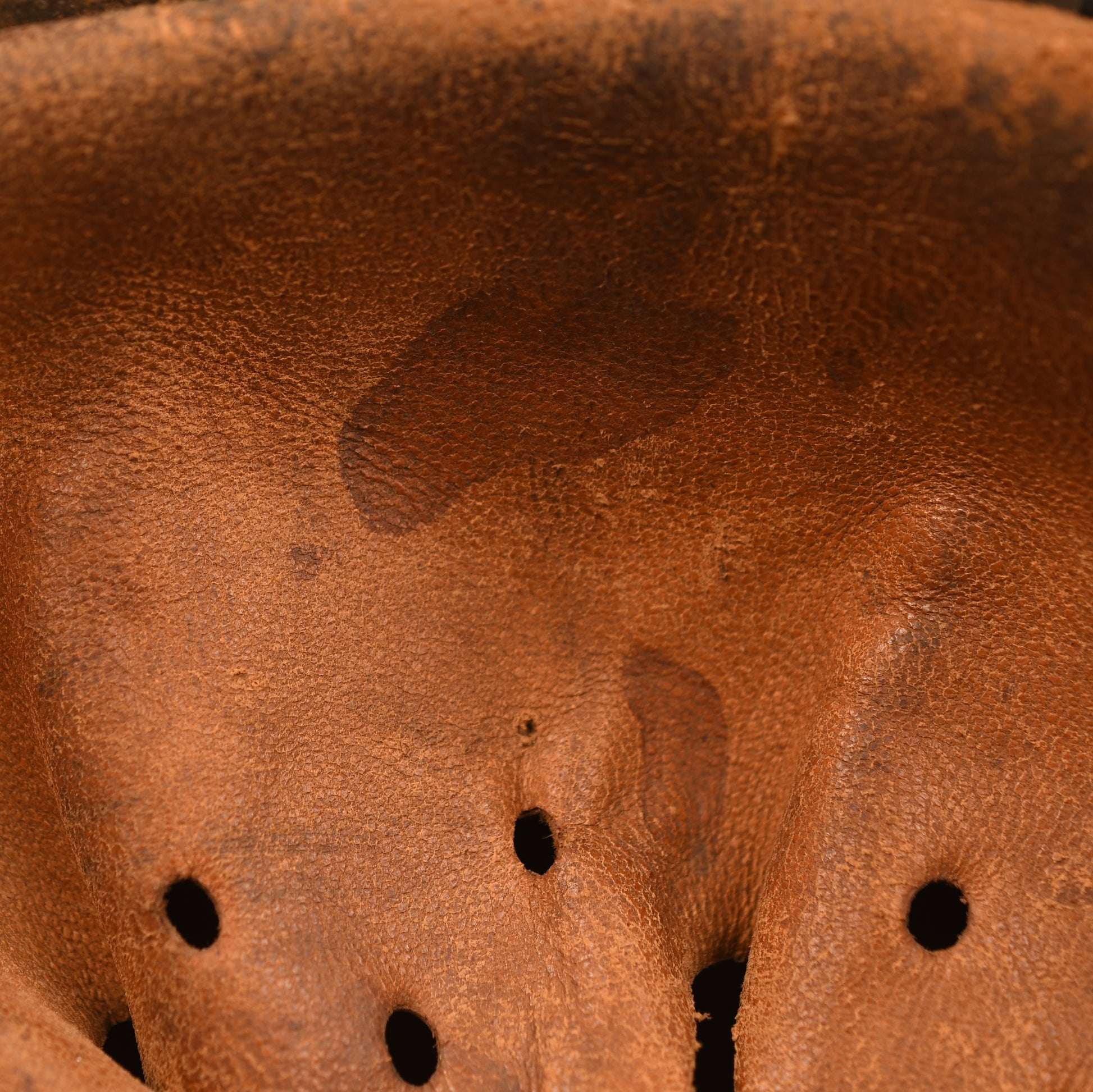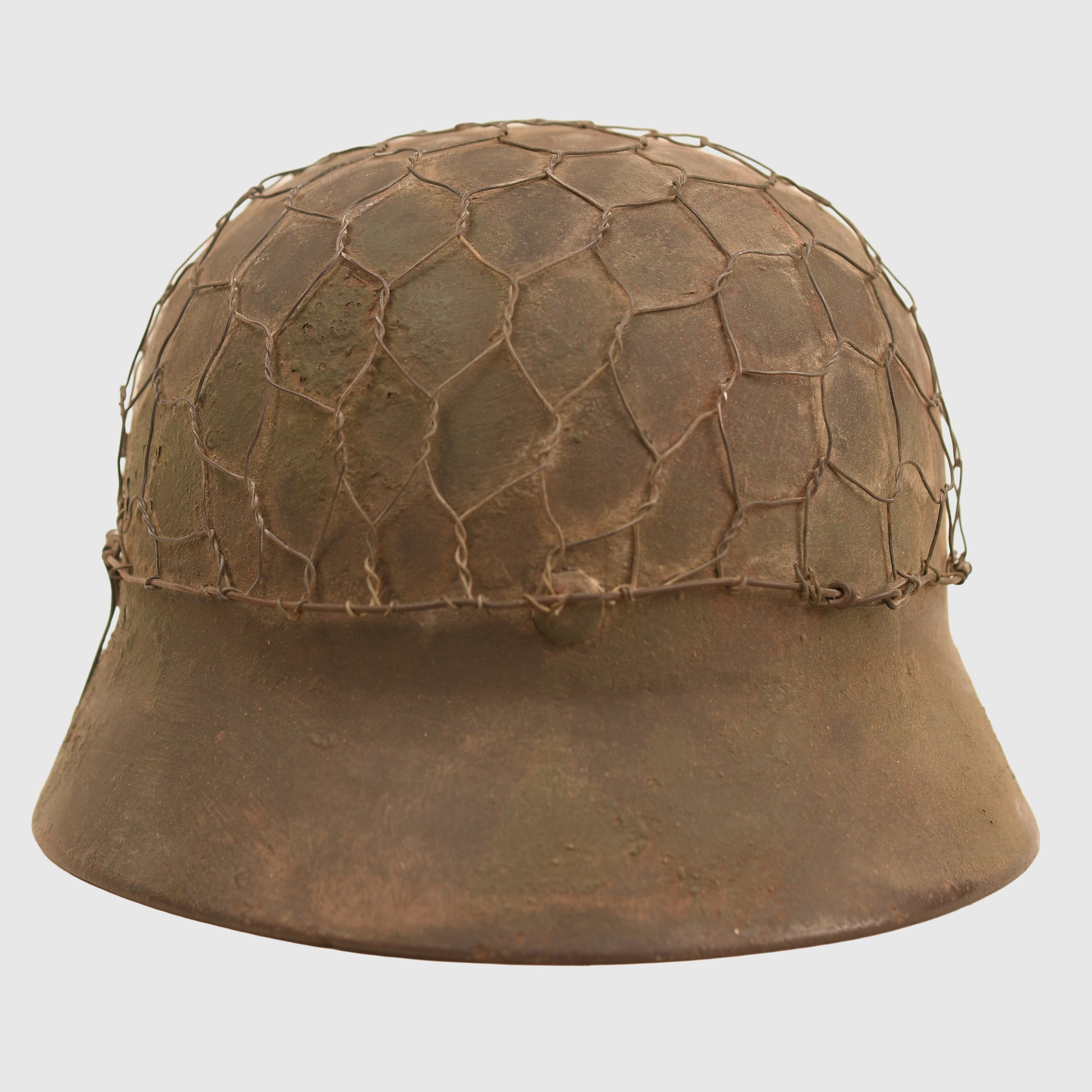 A size 64 M35 shell painted in a matte green camouflage finish, faint remnants of the army decal visible. The upper bowl is fitted with a wire frame for attaching foliage, secured with two steel clips. The interior retains its complete M35 aluminium-banded liner, showing wear but preserving a very good mid-tan colour with the original drawstring intact. Faint traces of the original apple green finish remain on the interior shell.