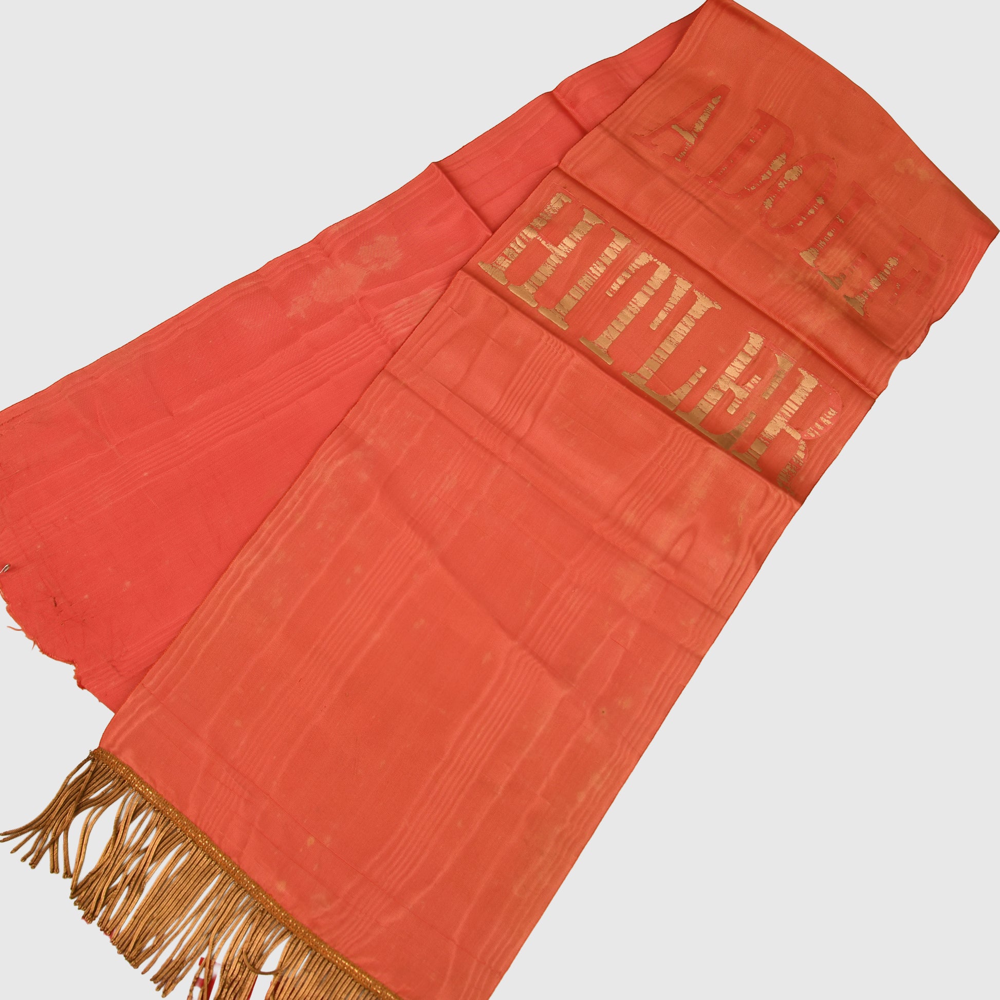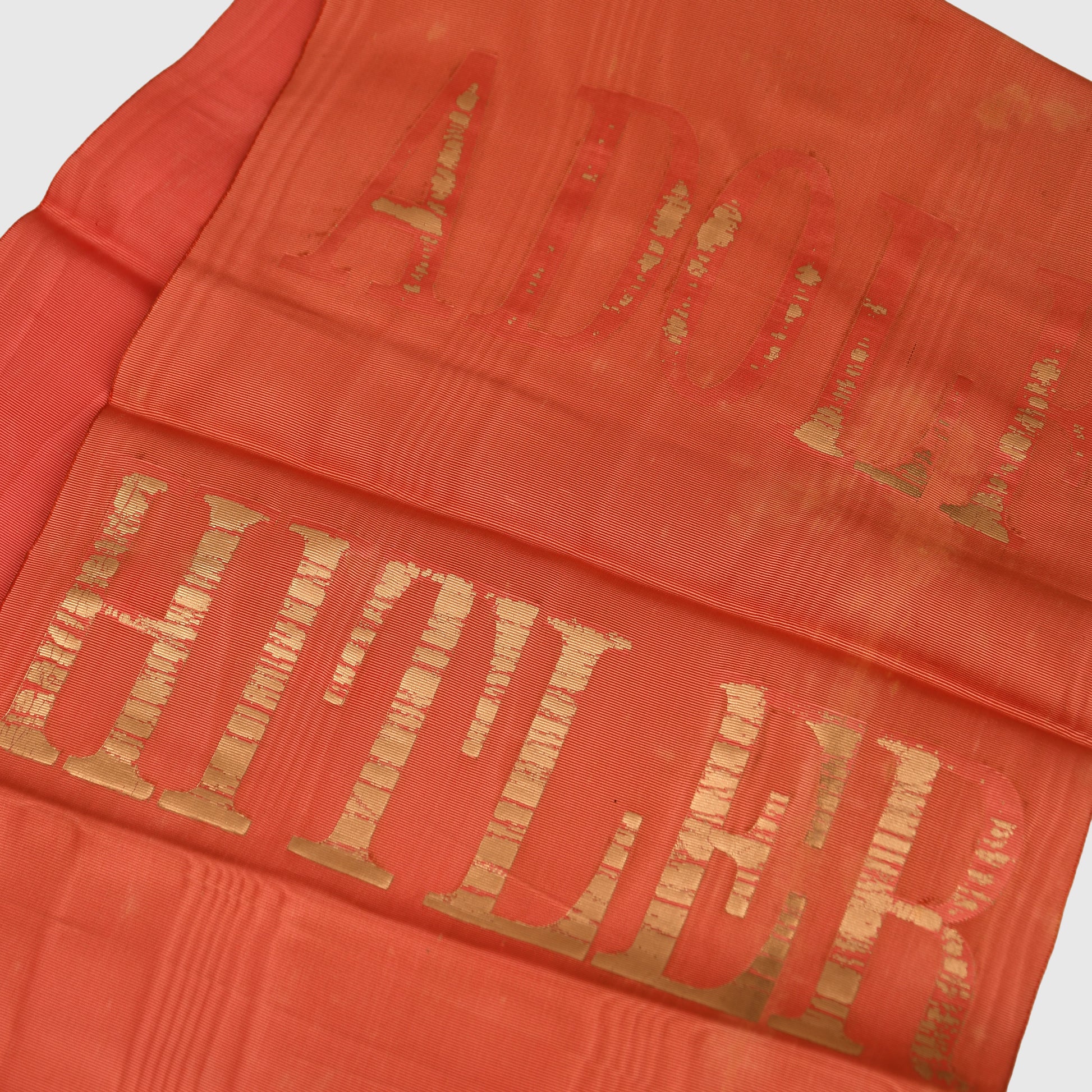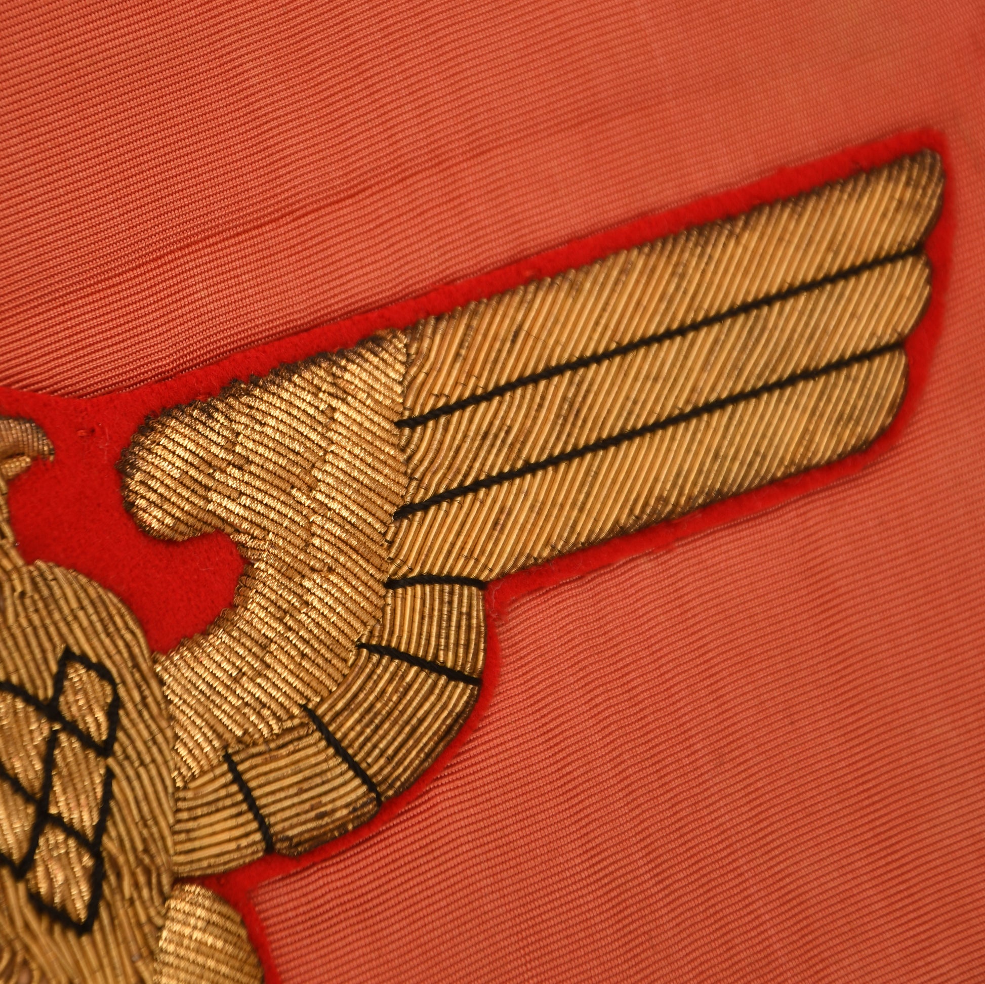 The ribbon is crafted from high-quality watered red silk and features a gold-fringed base. A prominent feature of this section is the exceptionally detailed hand-embroidered national eagle with a 7.5 cm wingspan, set upon a red backing. Positioned below the eagle is the name Adolf Hitler applied in gilt lettering. The surname Hitler remains almost entirely complete in its gilding, while the first name Adolf shows some partial loss of the gold finish to the silk.